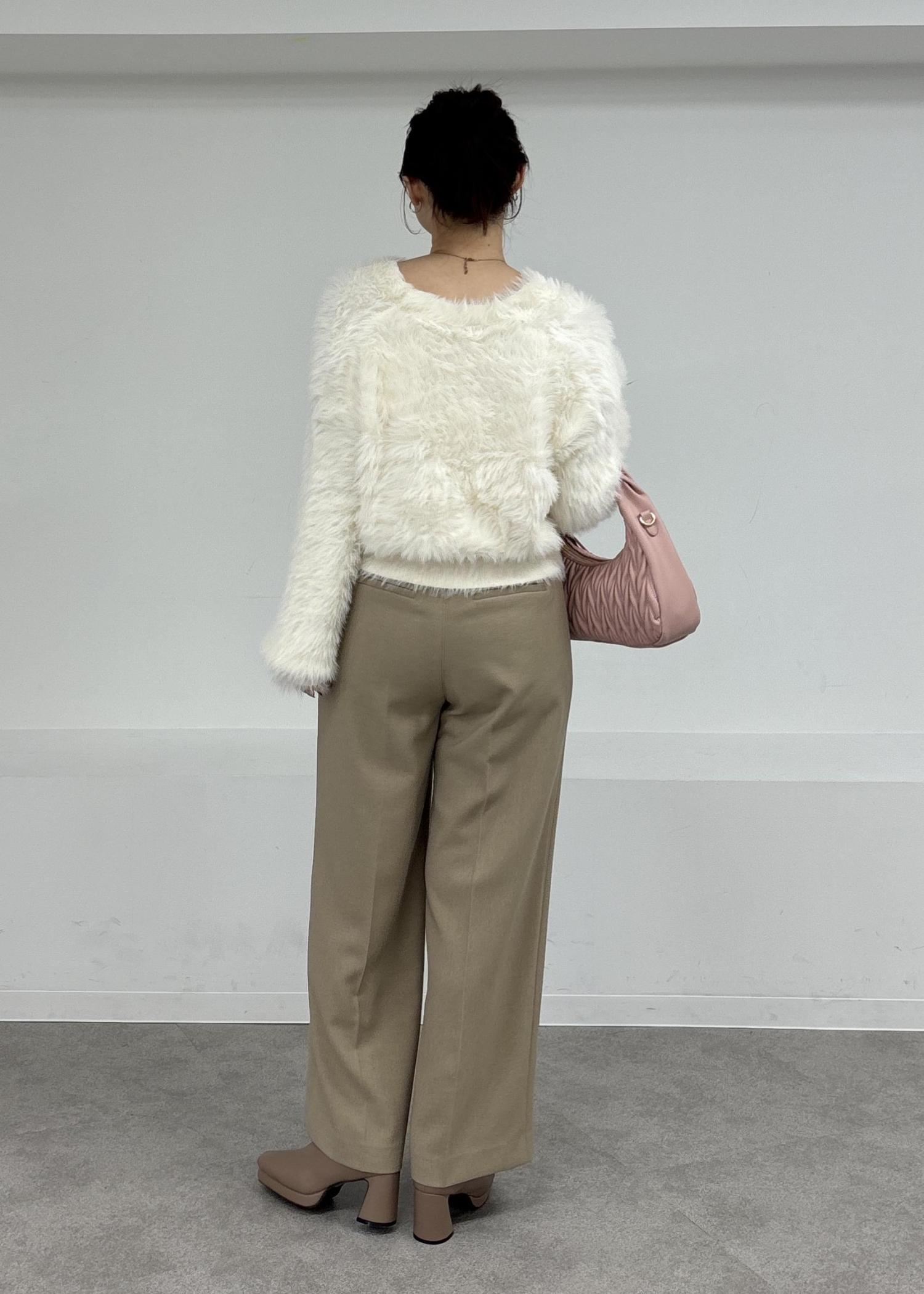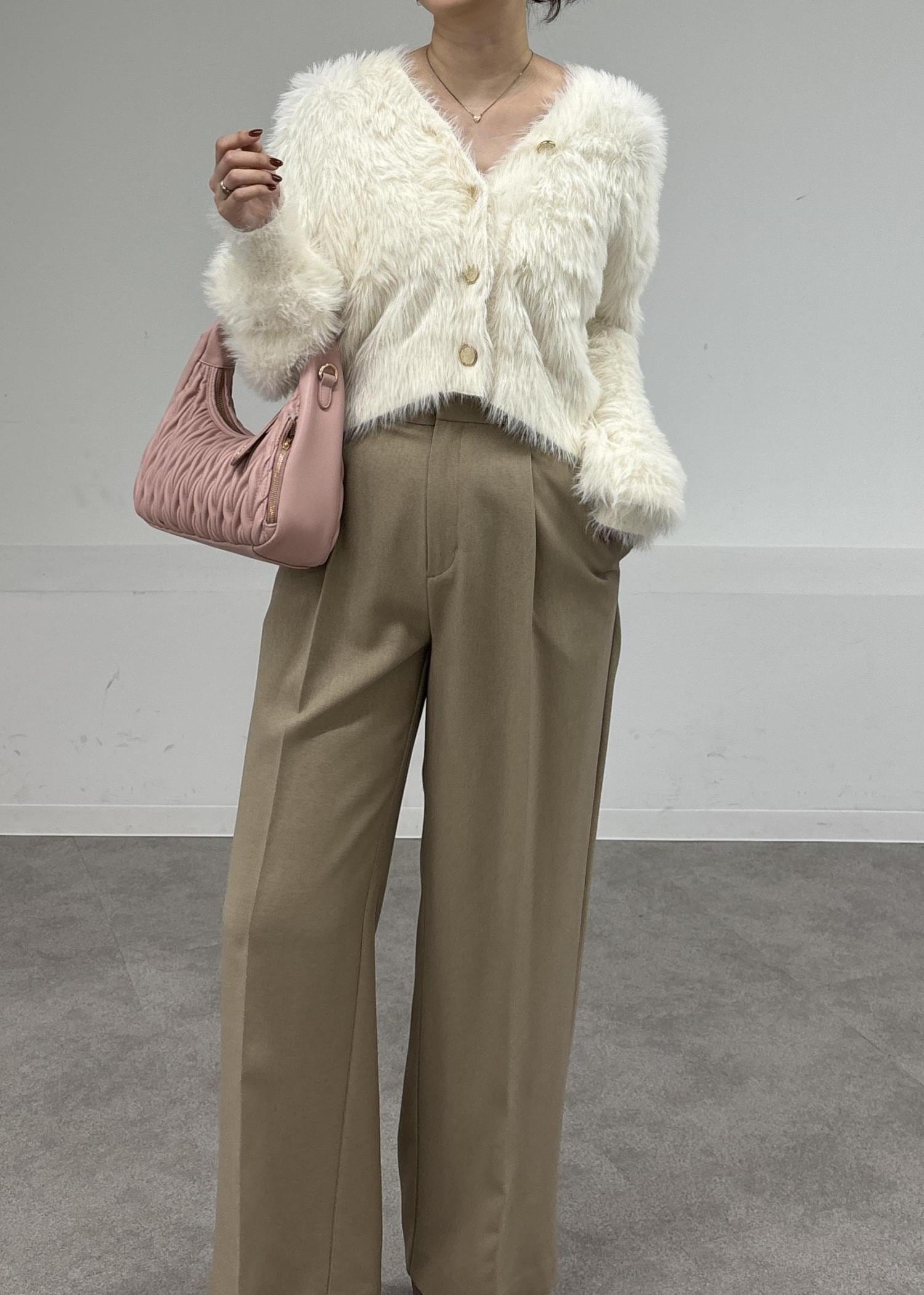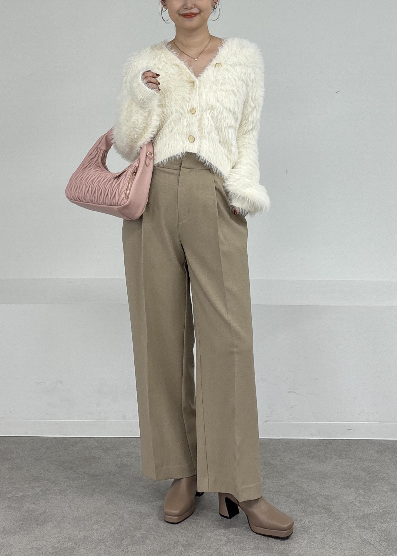ふわふわタッチなショート丈カーディガンはホワイトに、パンツはベージュで淡めなカラー合わせにし、ヒールブーツで大人かわいいコーデに♡
