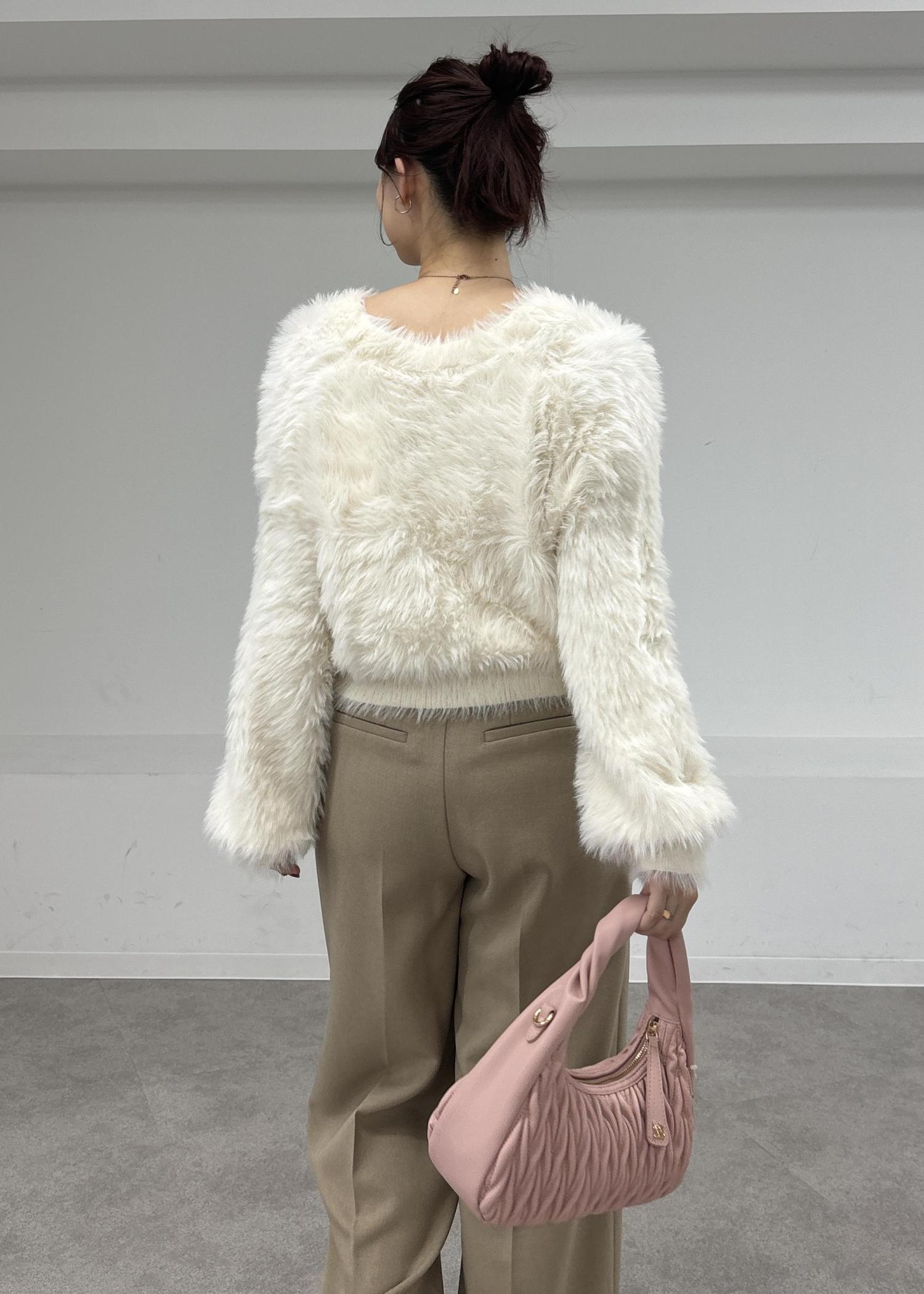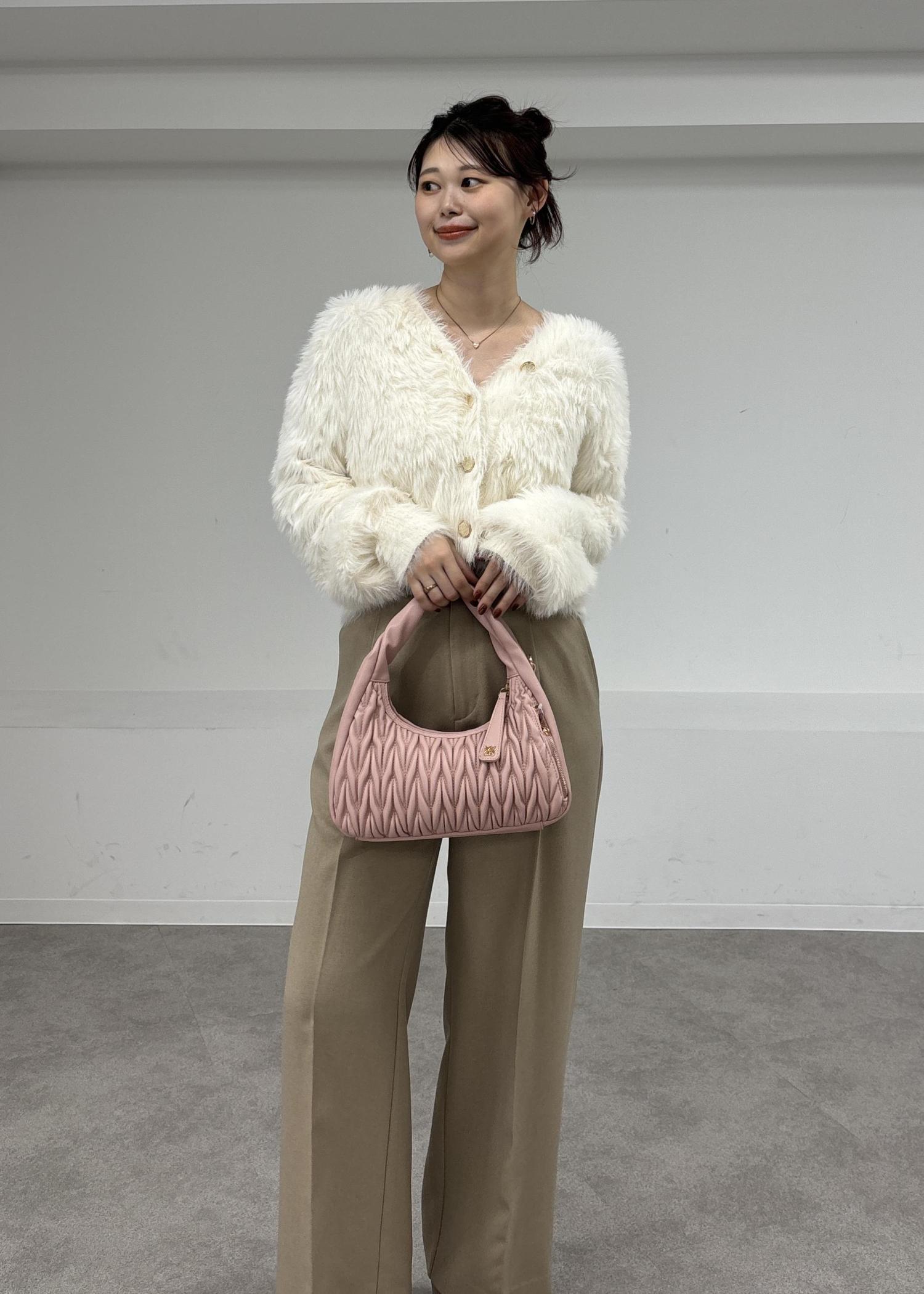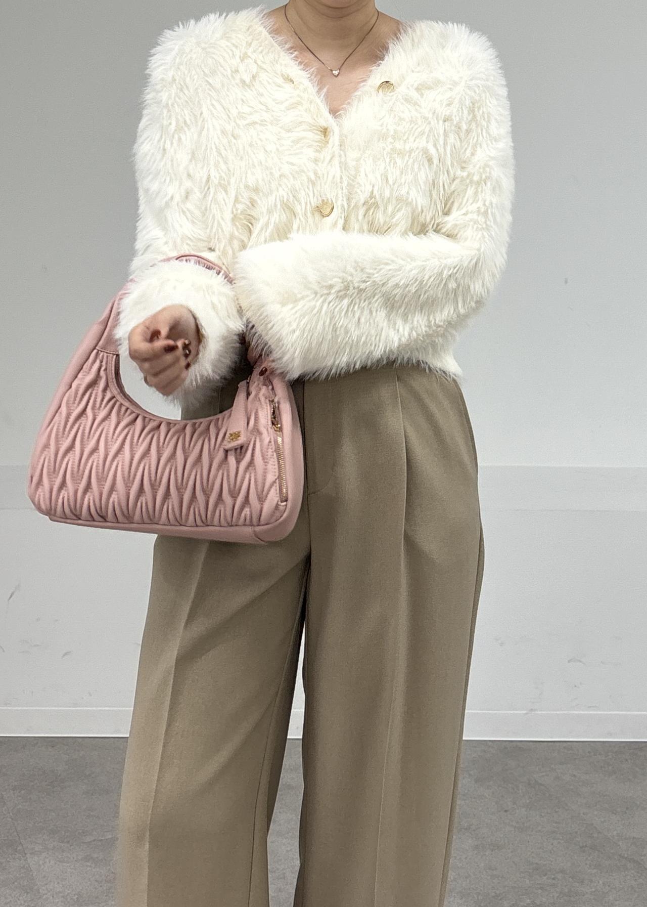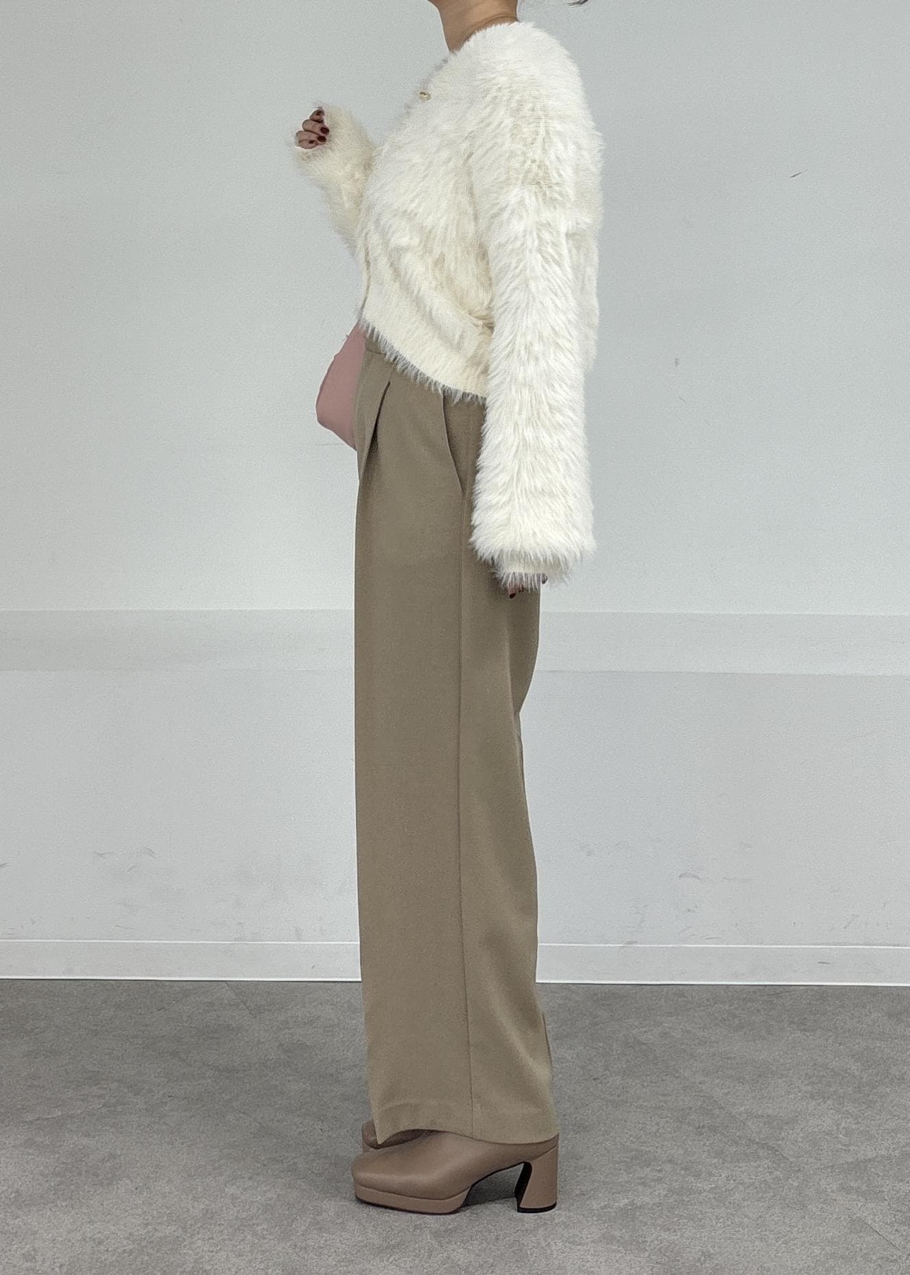 ふわふわタッチなショート丈カーディガンはホワイトに、パンツはベージュで淡めなカラー合わせにし、ヒールブーツで大人かわいいコーデに♡