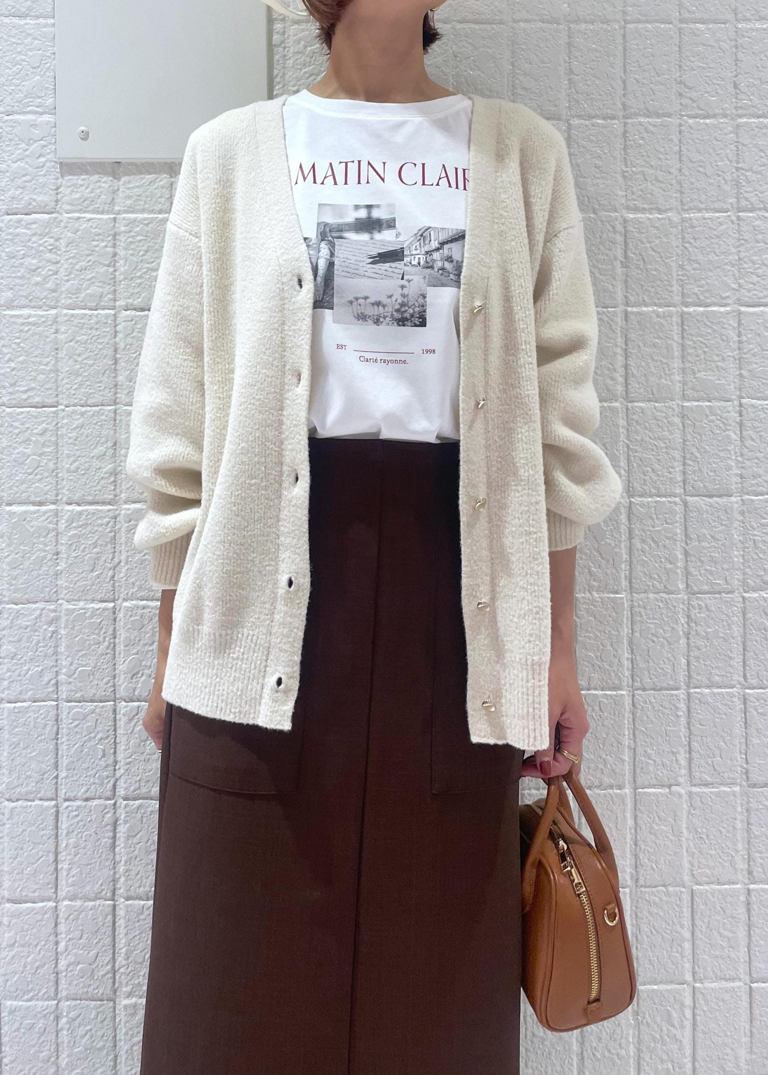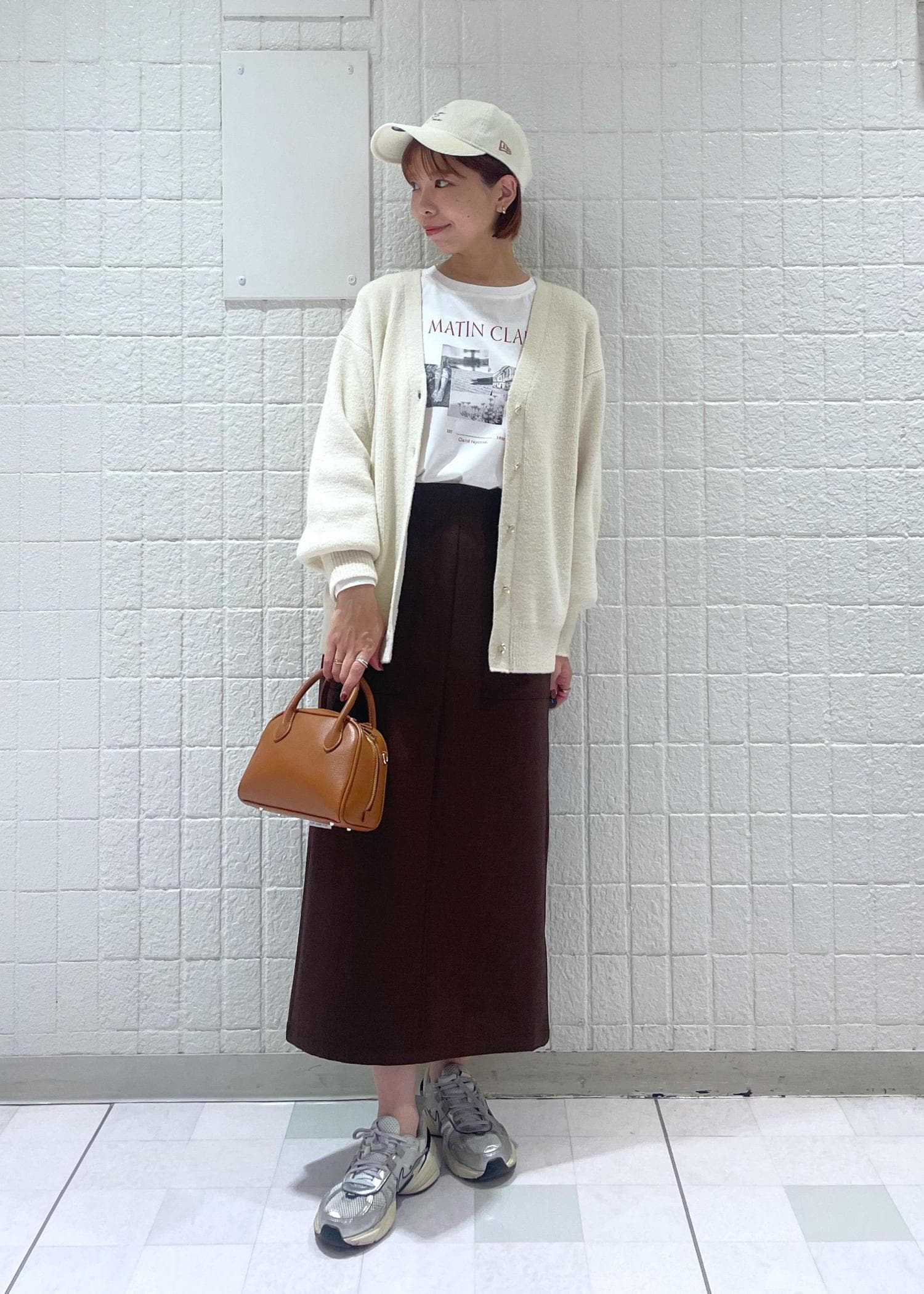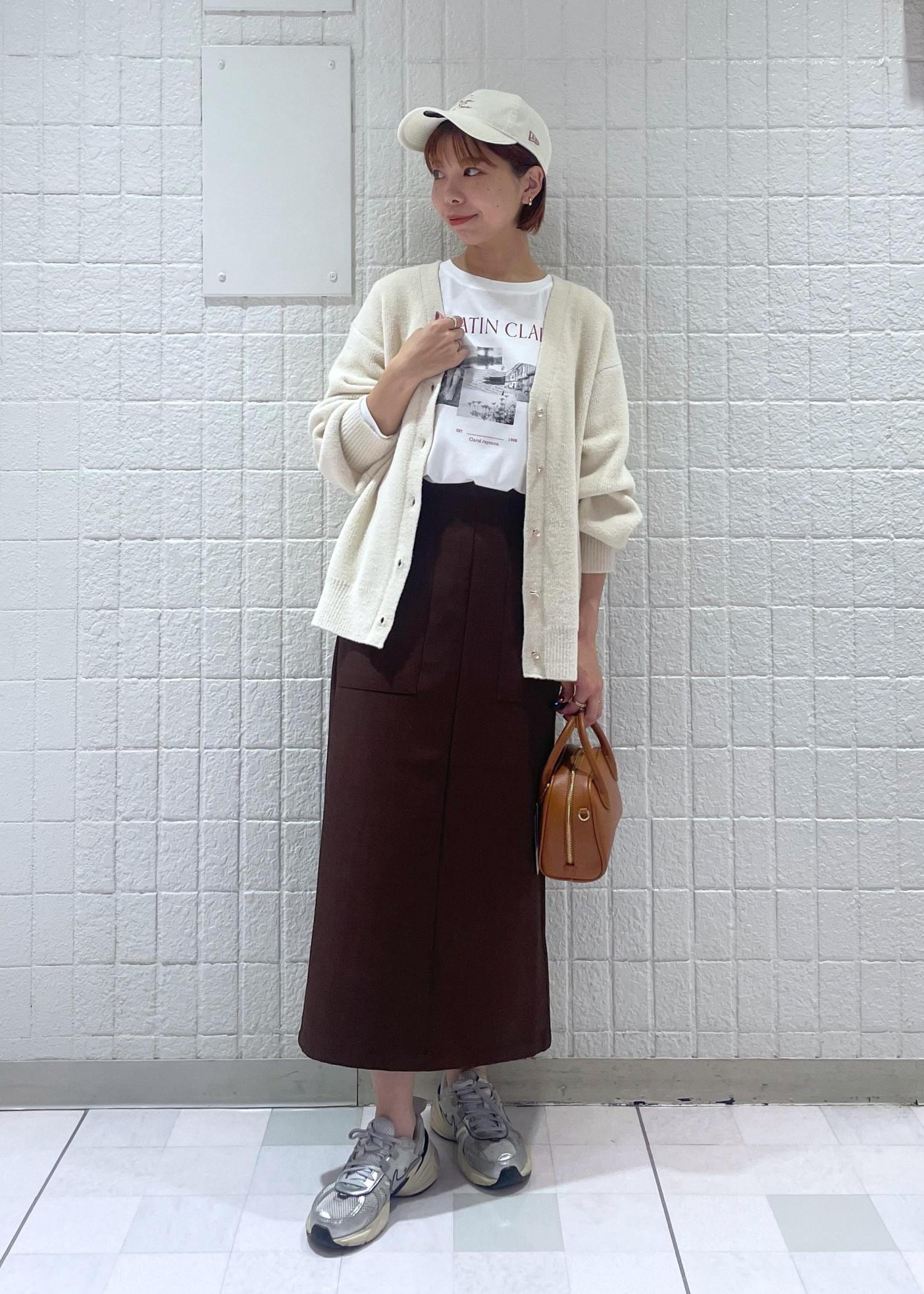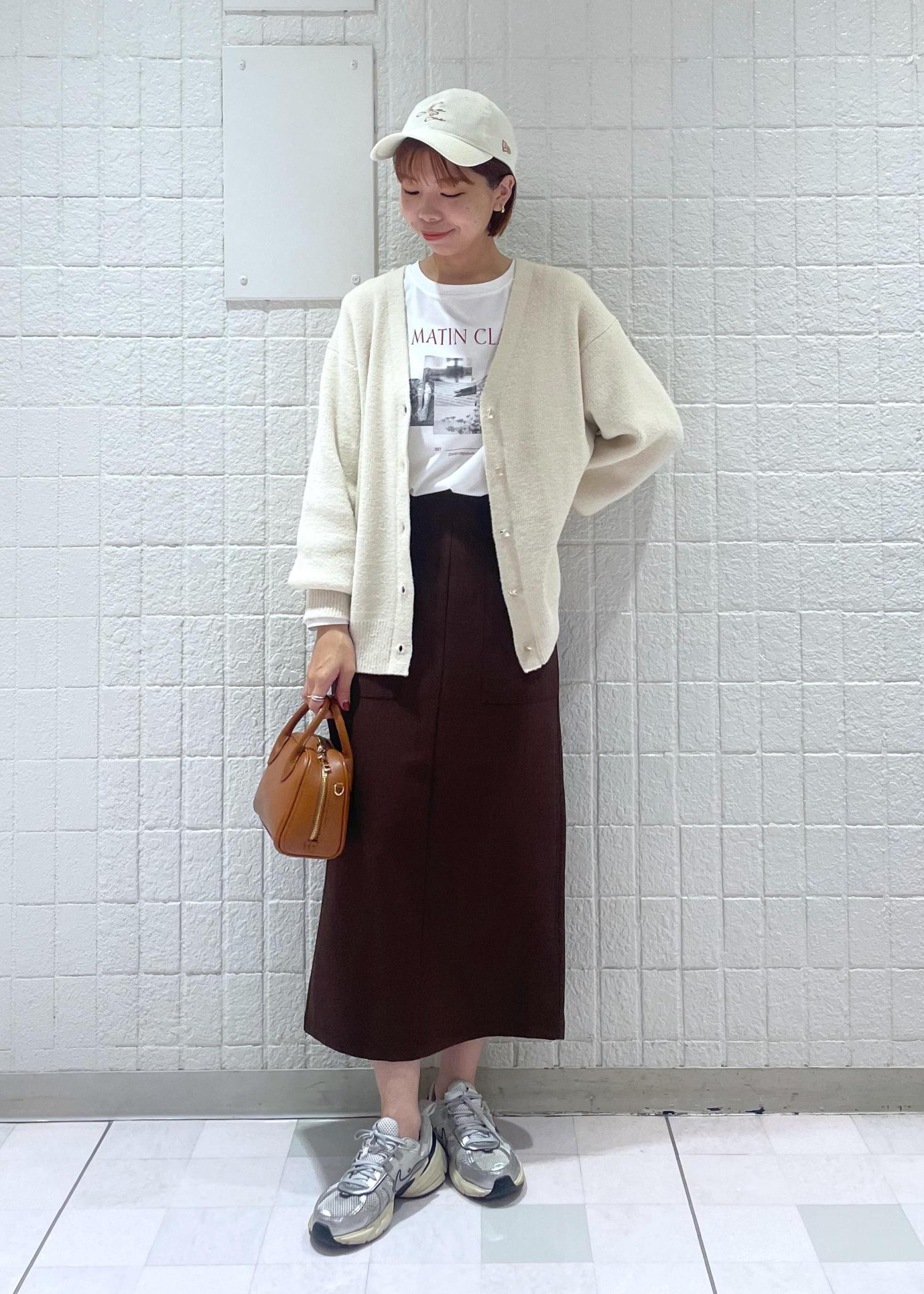 秋らしい赤みのあるブラウンカラーのアイラインスカートにTシャツ、ロングカーディガンを合わせた秋のカジュアルコーデ。