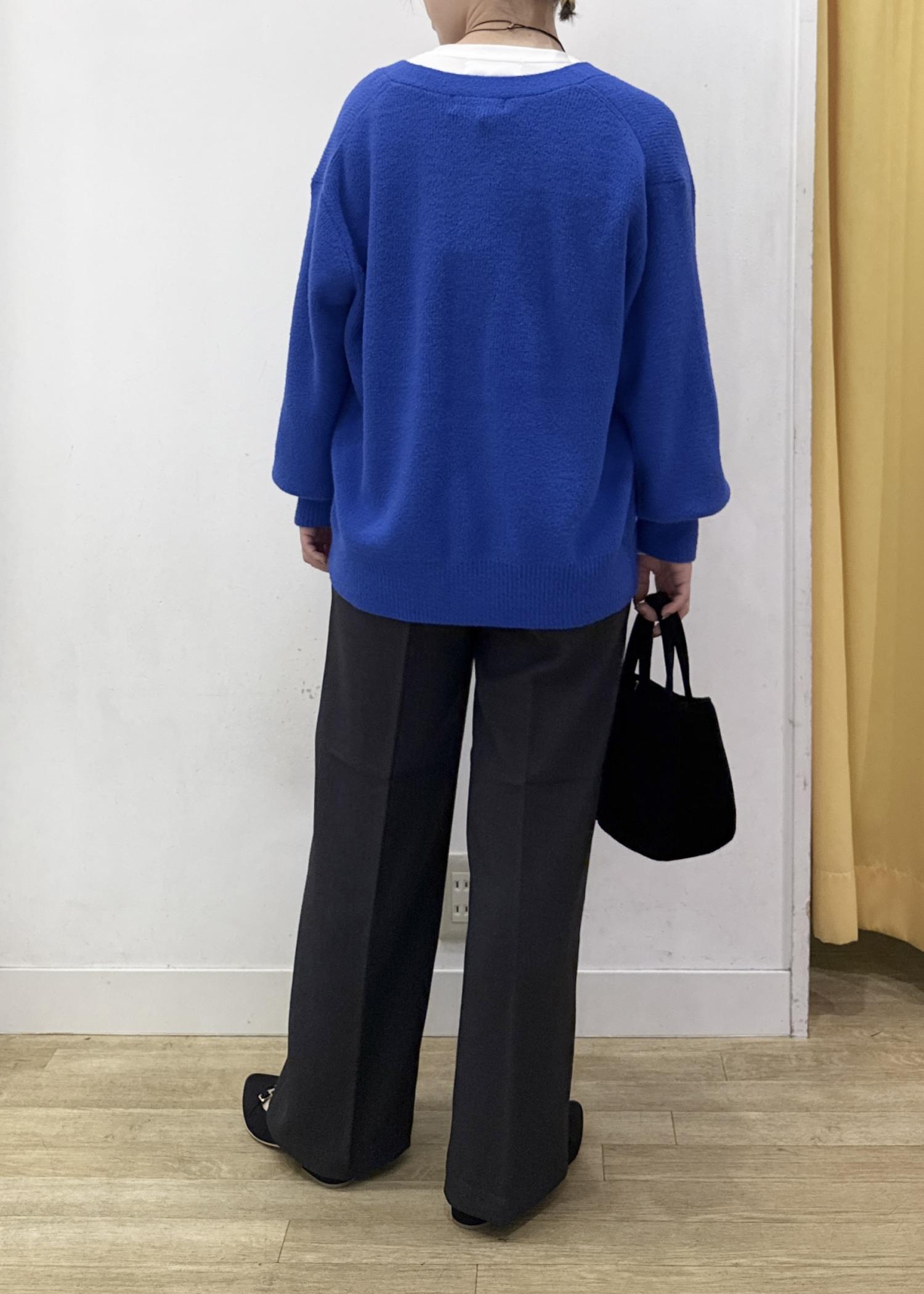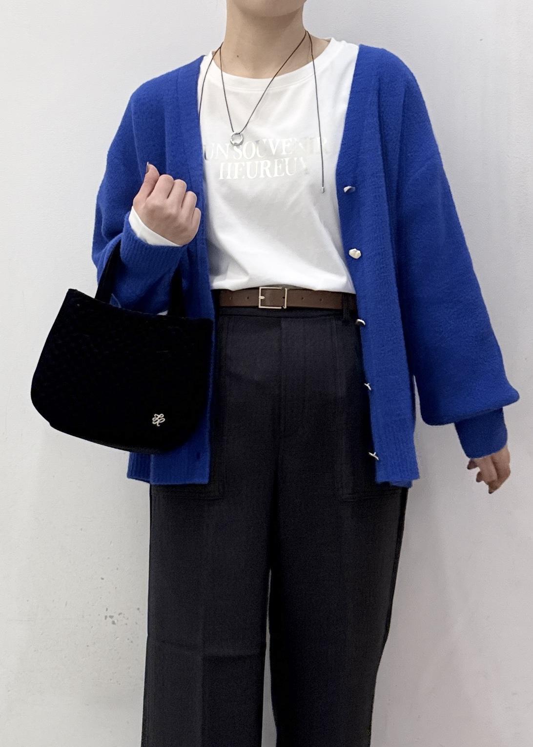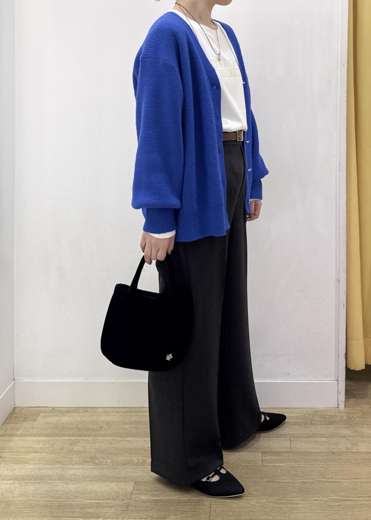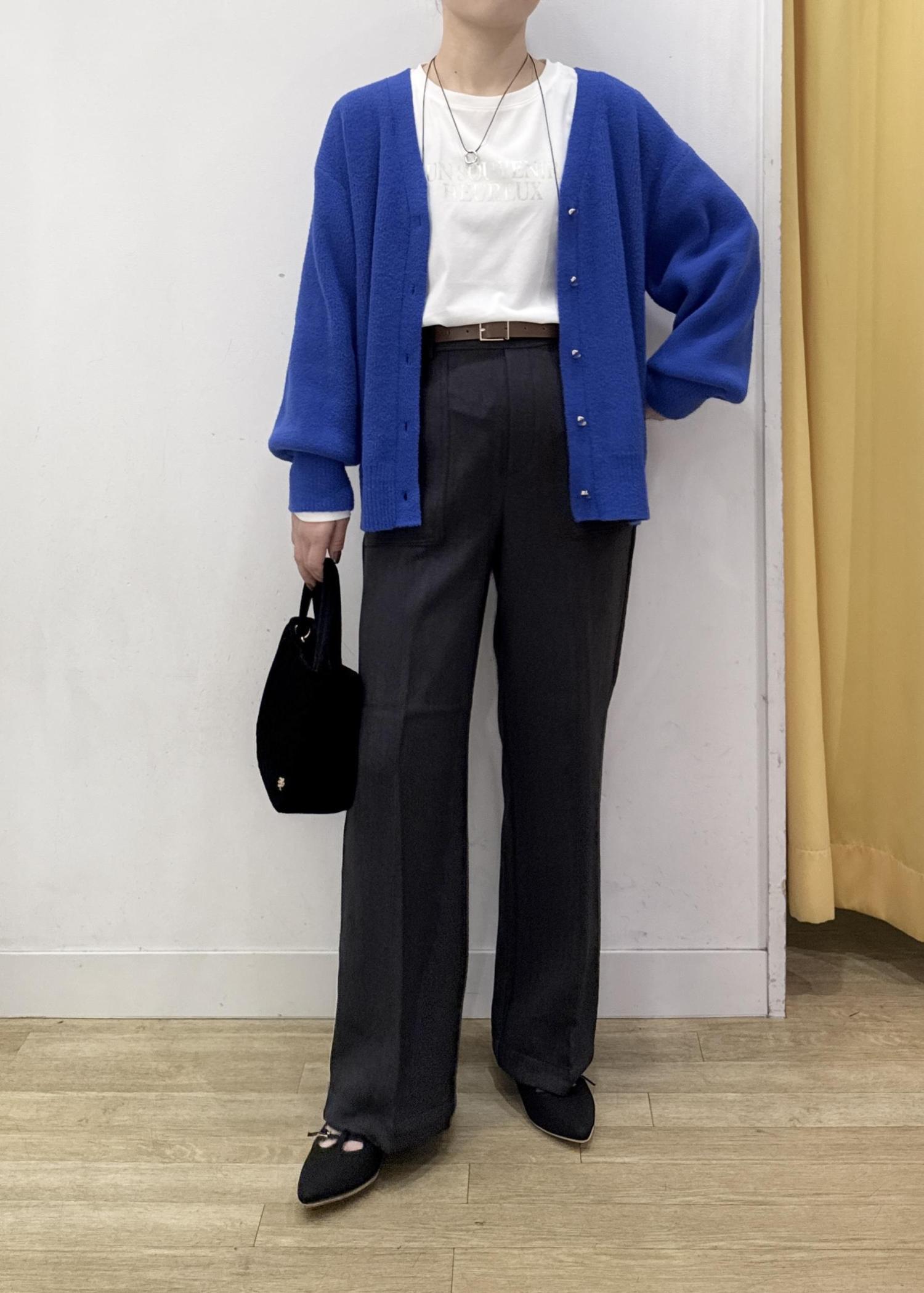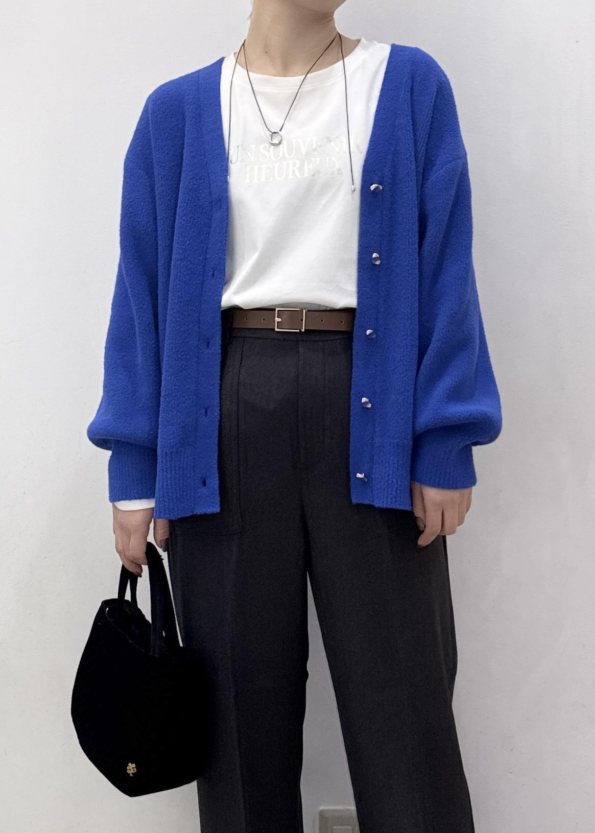 ブルーのキレイなカラーがポイントのカーディガンを使った大人カジュアルコーディネート!