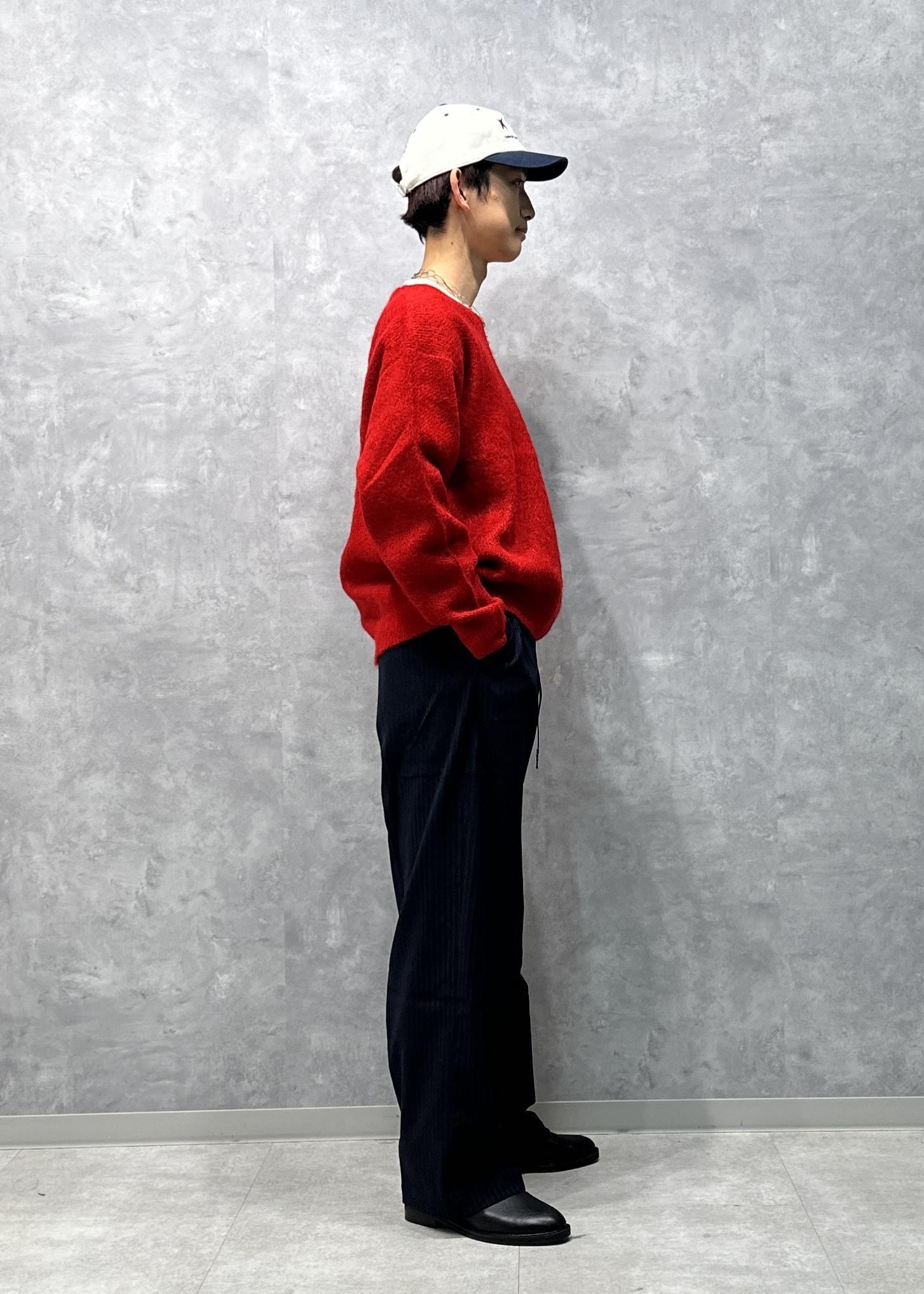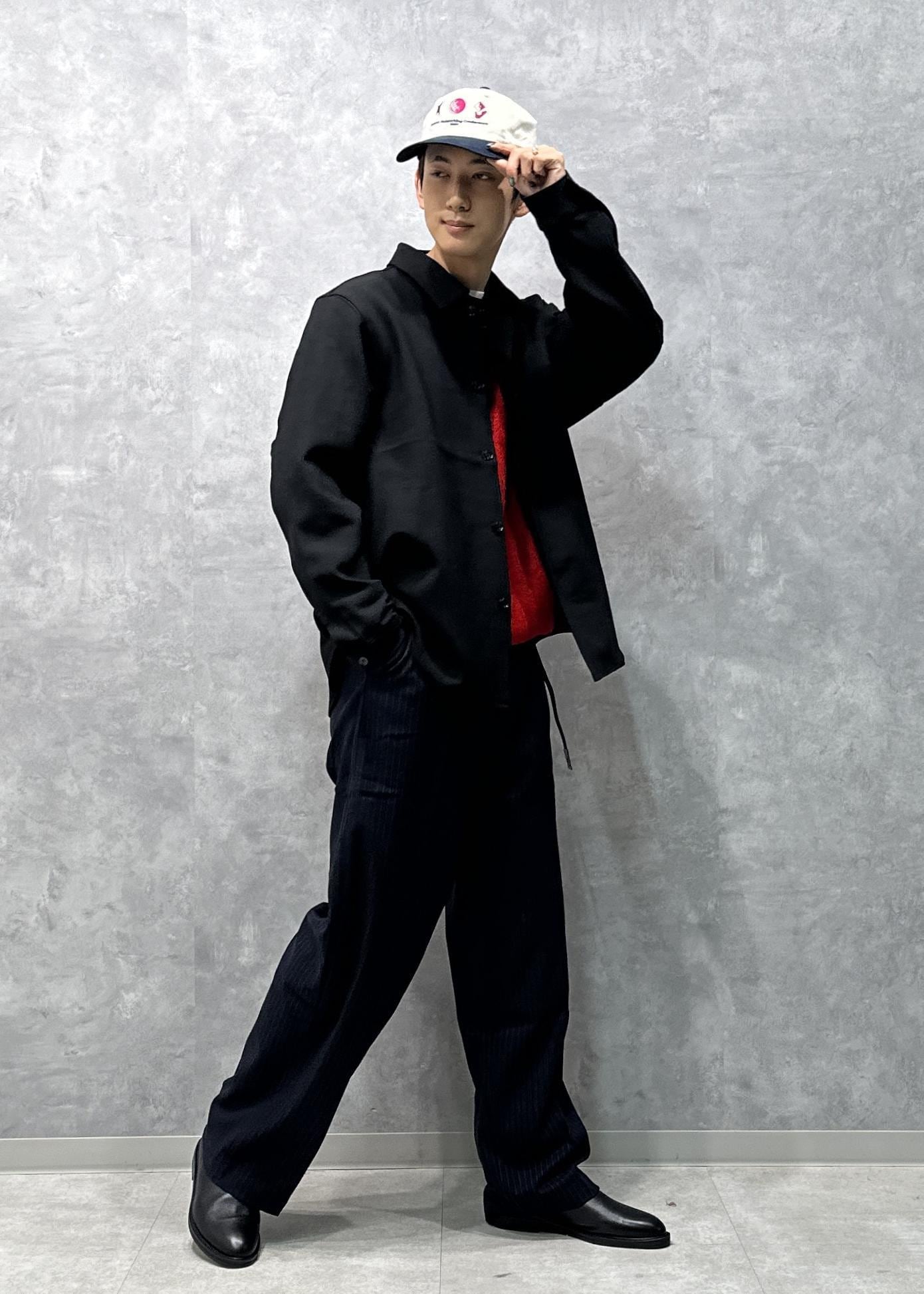 赤ニットを差し色に、黒のシャツジャケットとネイビーのストライプパンツを合わせた差し色コーデです。程よいルーズなシルエットとキャップでラフな印象に。色物挑戦したい方はモノトーンコーデのインナーに着ることで色の面積が狭くなって挑戦するハードルが下がるのでおすすめです。差し色があることでシンプルすぎないコーデに仕上げました。