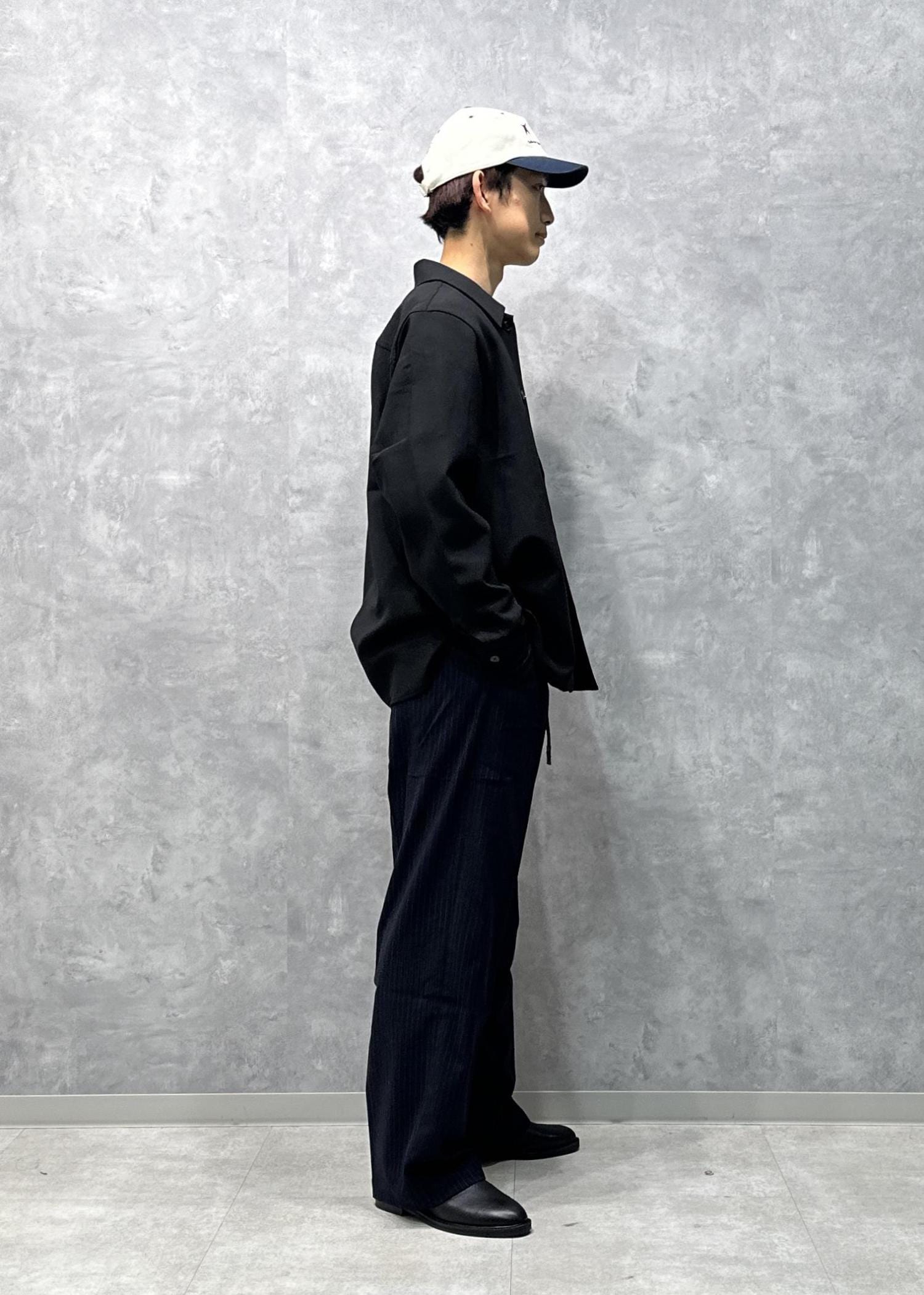 ワイドでルーズ、かつ上品でルーズなシルエット。丈はやや長め。厚めの生地感で秋冬仕様。温かみのある風合いです。ダークトーンなので合わせやすく、シックでモードな印象です。