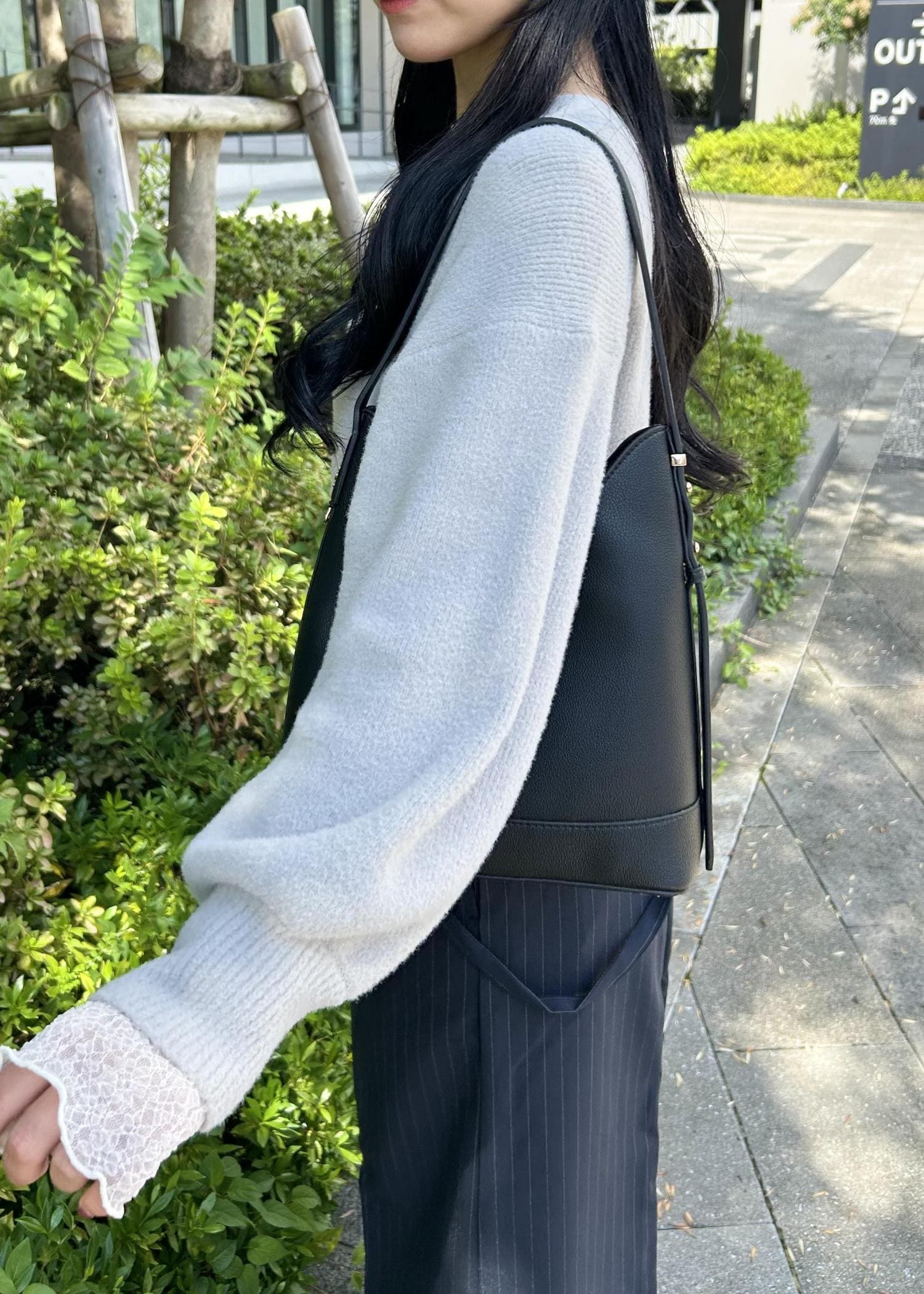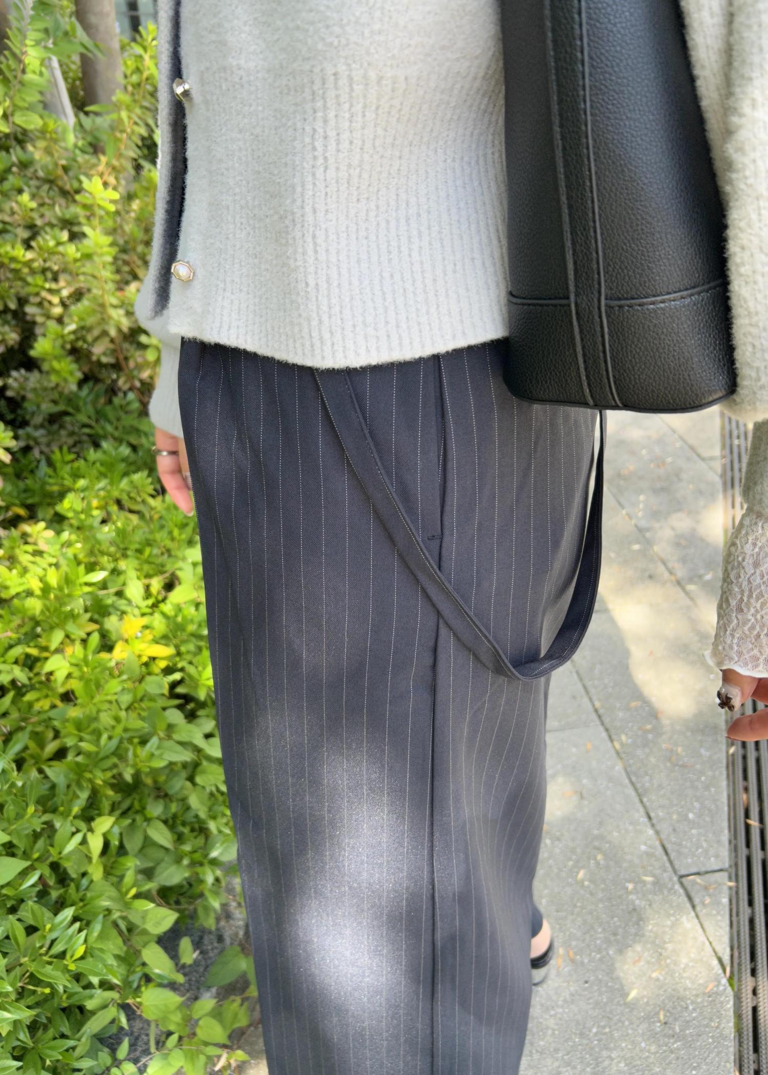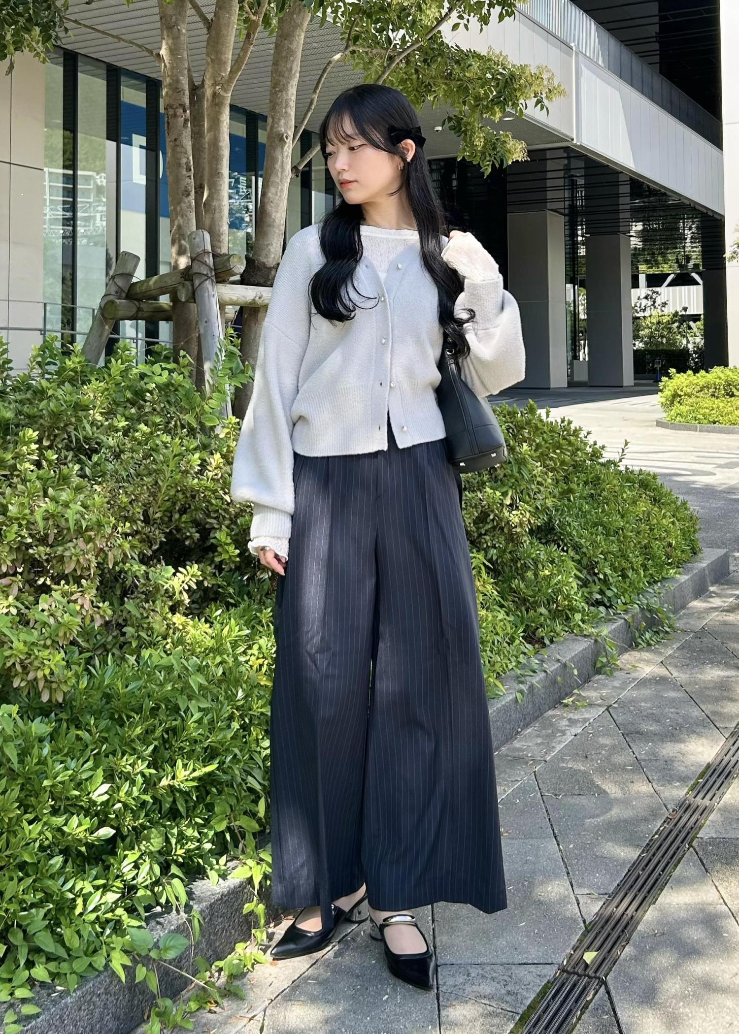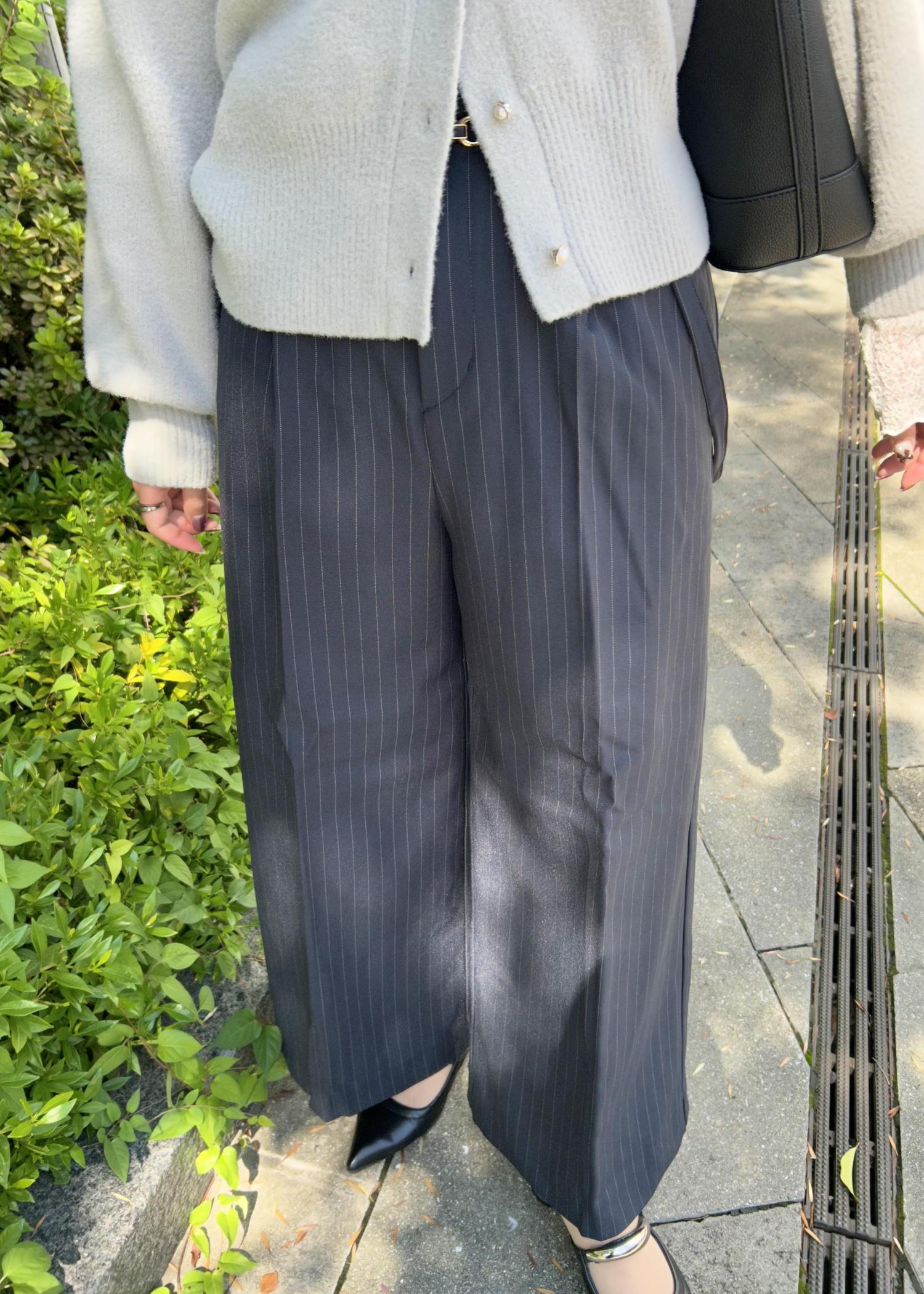 ボトムはストライプのワイドパンツで縦ラインを強調し、