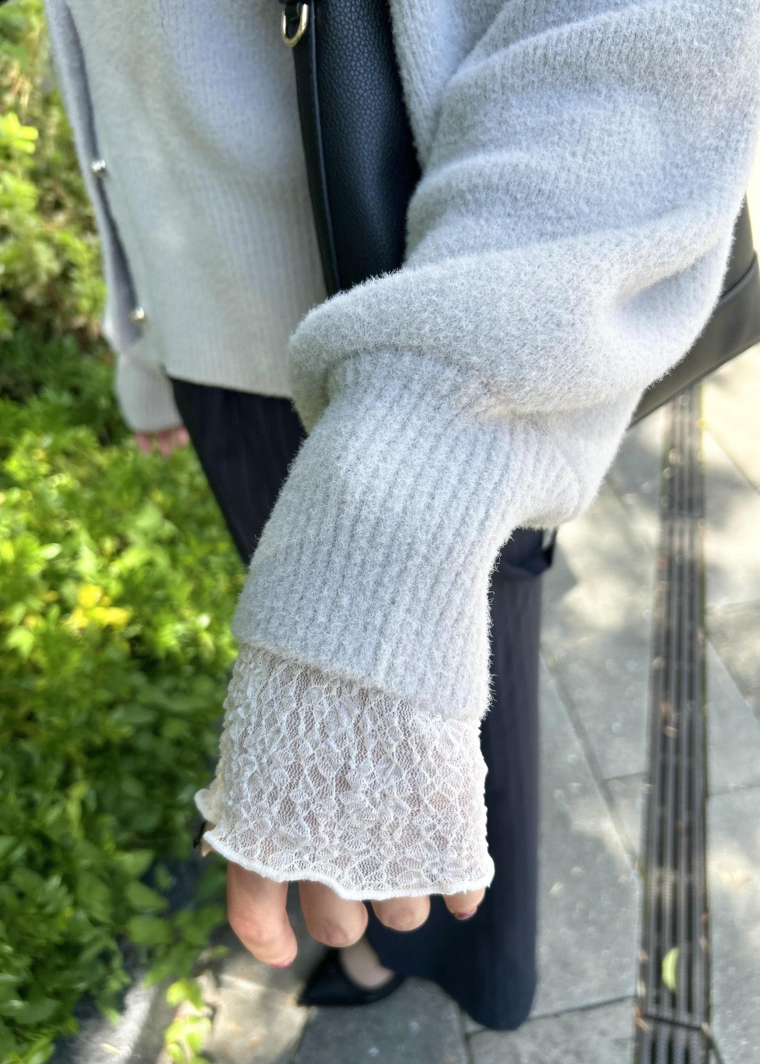 ゆるめのカーディガンに、透け感のあるレースインナーを合わせて、