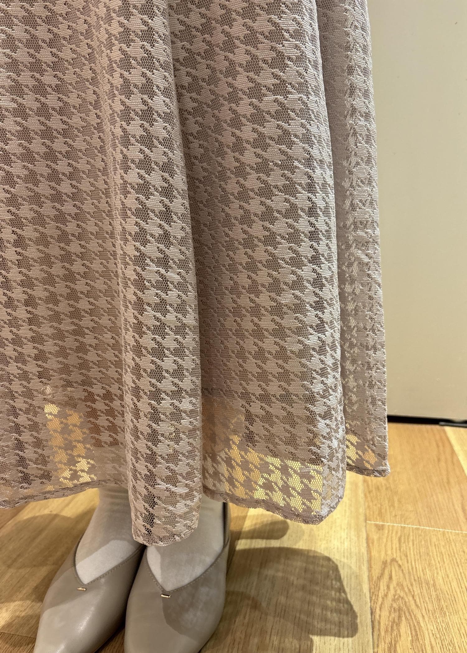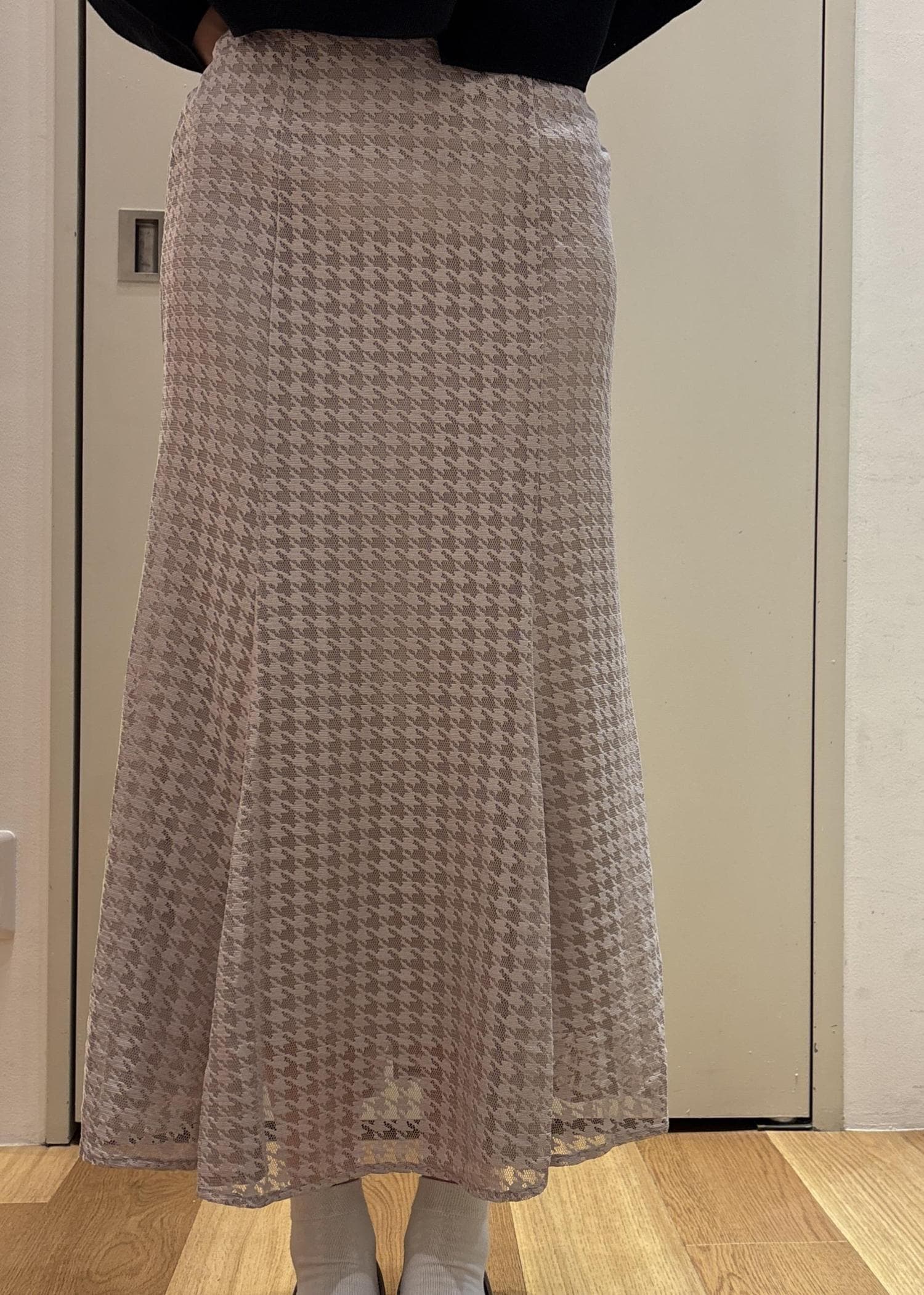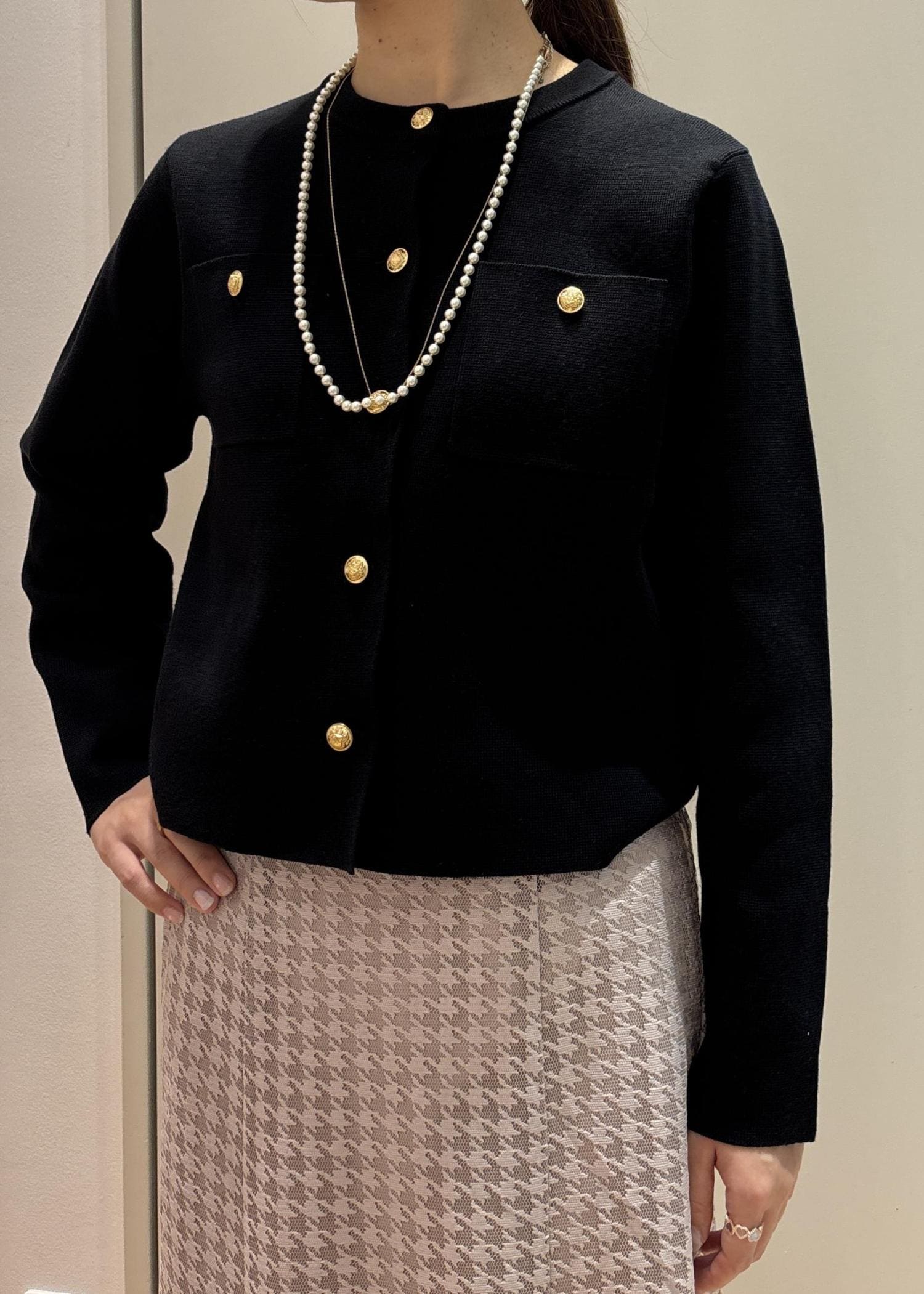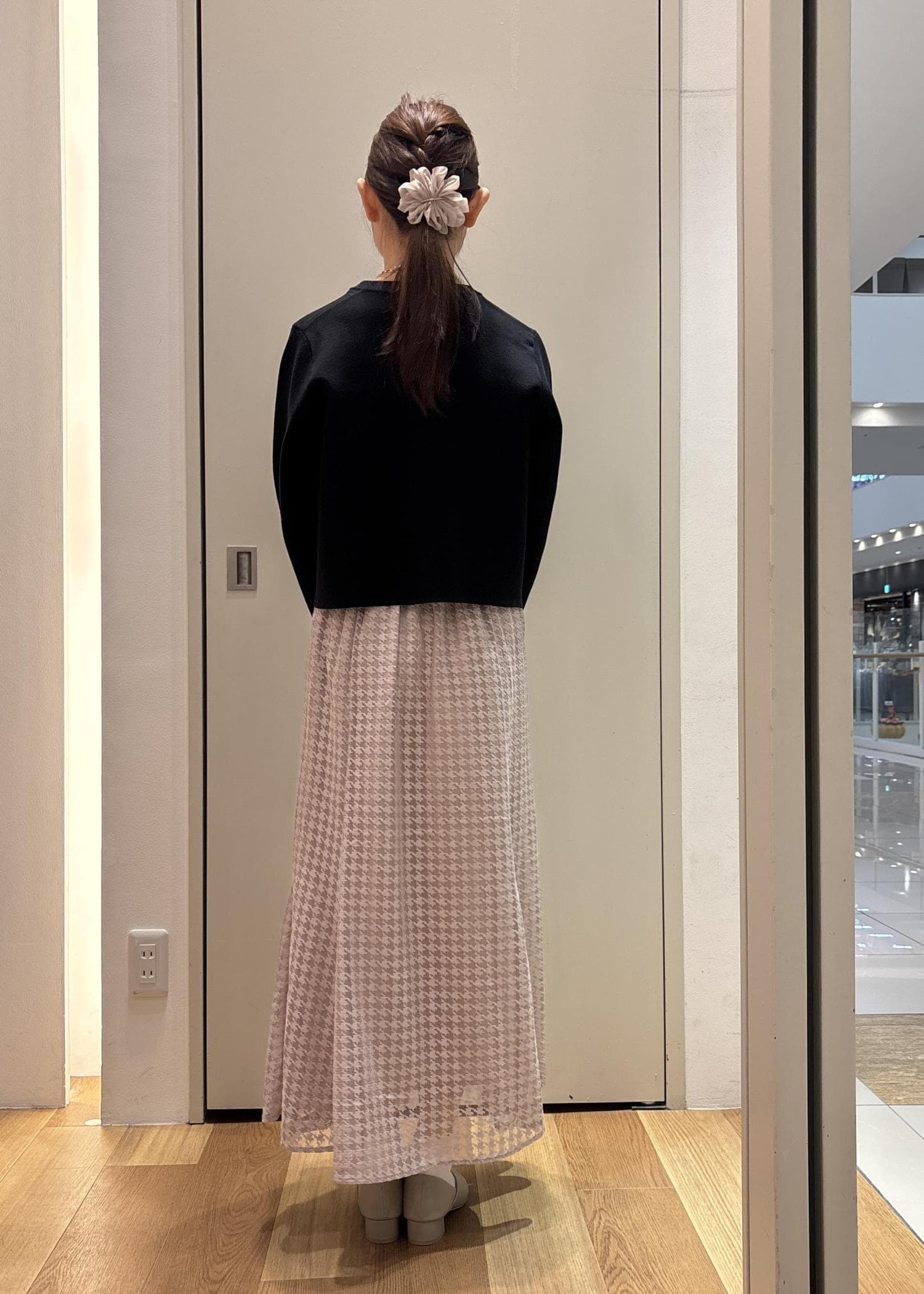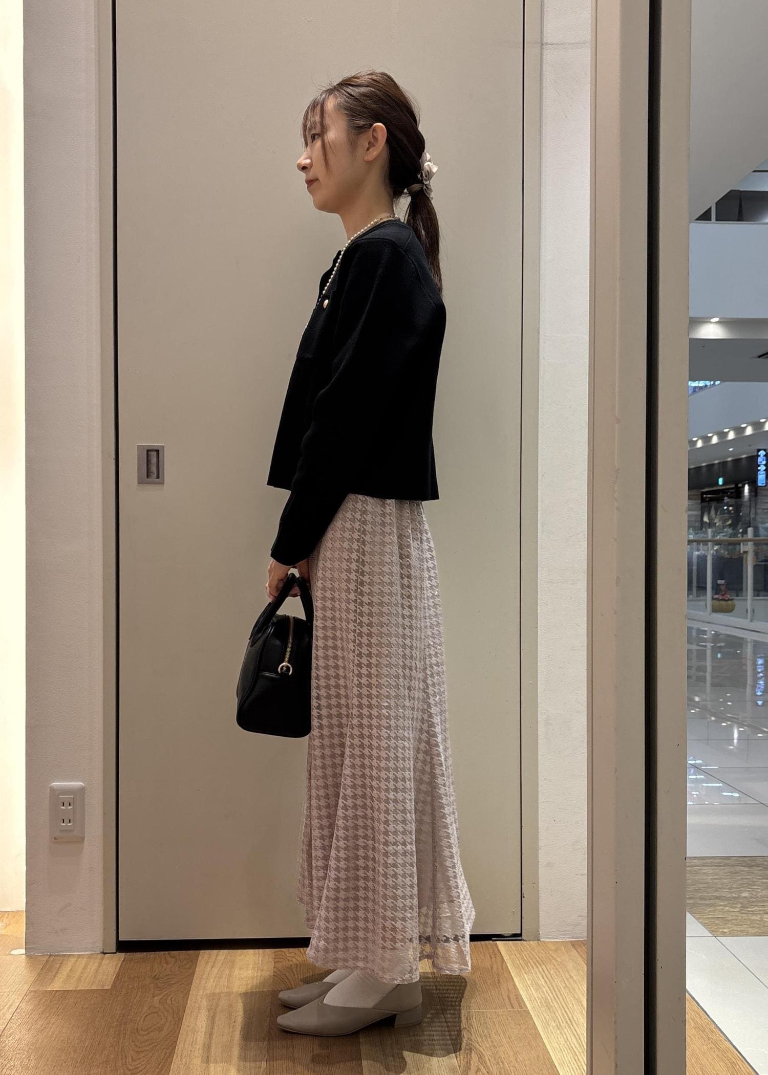 ブラックのミラノリブカーディガンにベージュの千鳥柄スカートを合わせ上品な色合わせにしました。