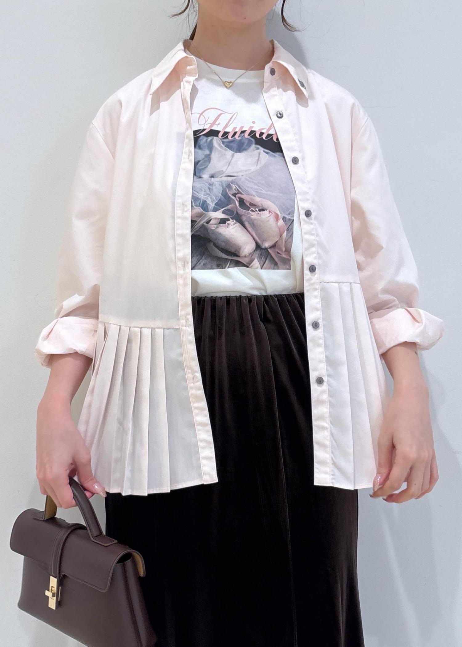 1枚でも着映えするシャツを羽織で使い、フォトプリントが可愛いロングTシャツと合わせて、足元も厚底ブーツで少しカジュアルにしました。