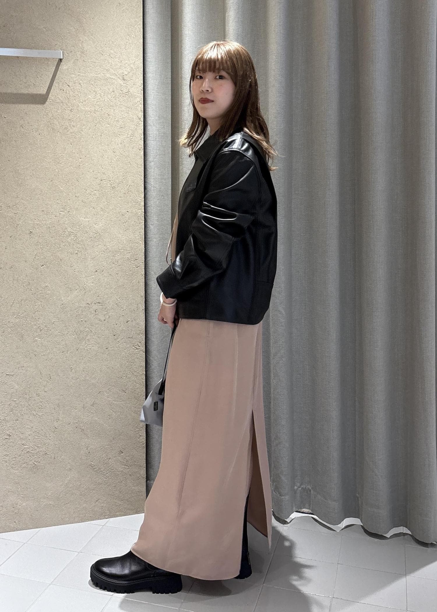 ブルゾンのシルエットになるので、ゆったりサイズのトップスも着る事ができます◯