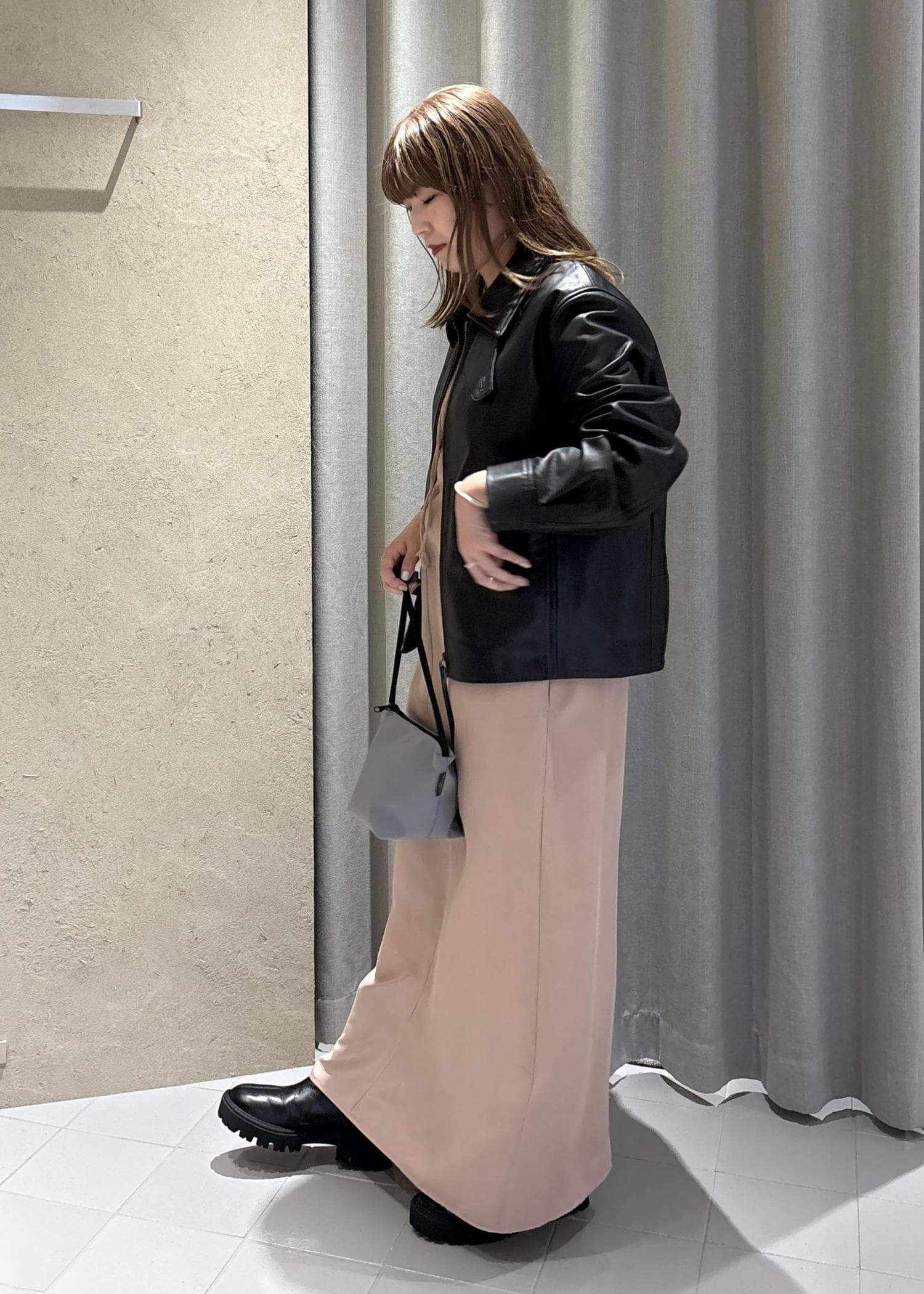 コートを着るギリギリ手前まで着用できるレザージャケット。