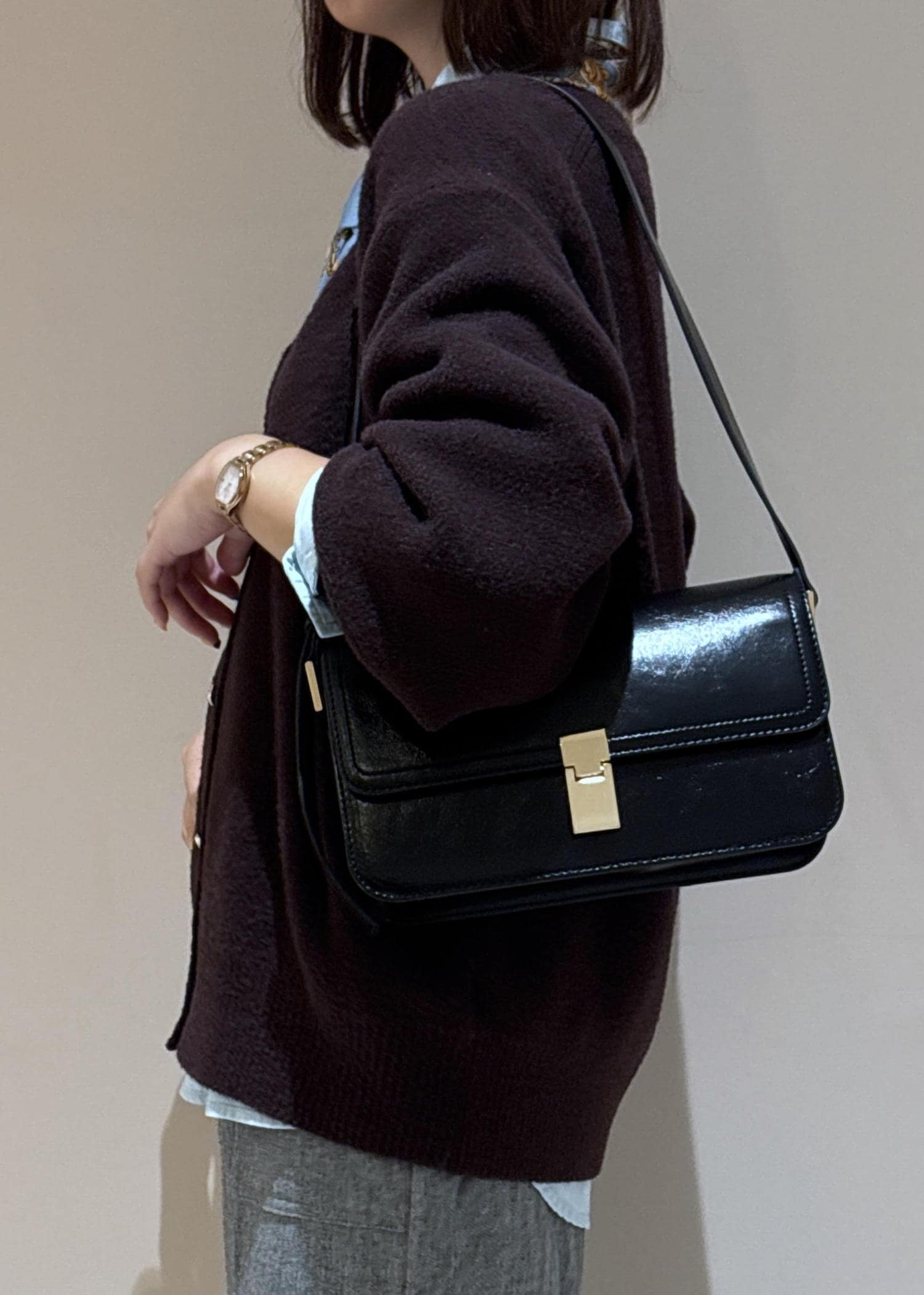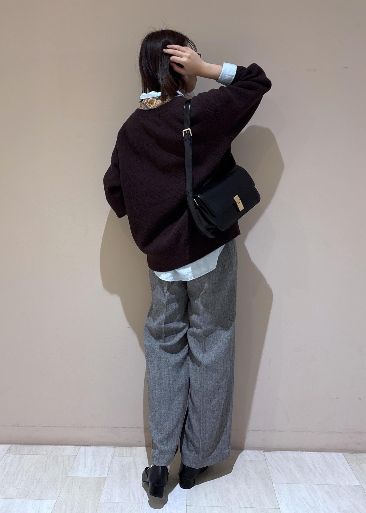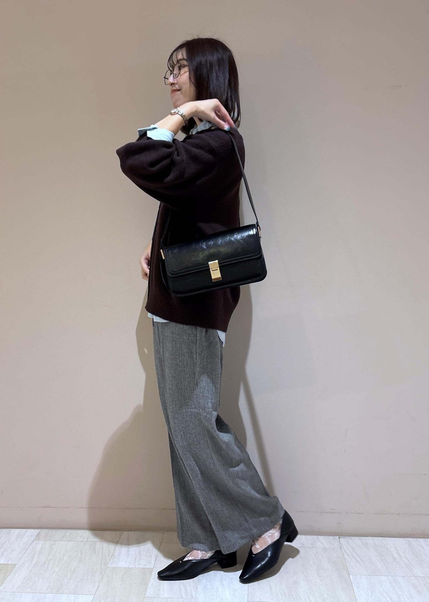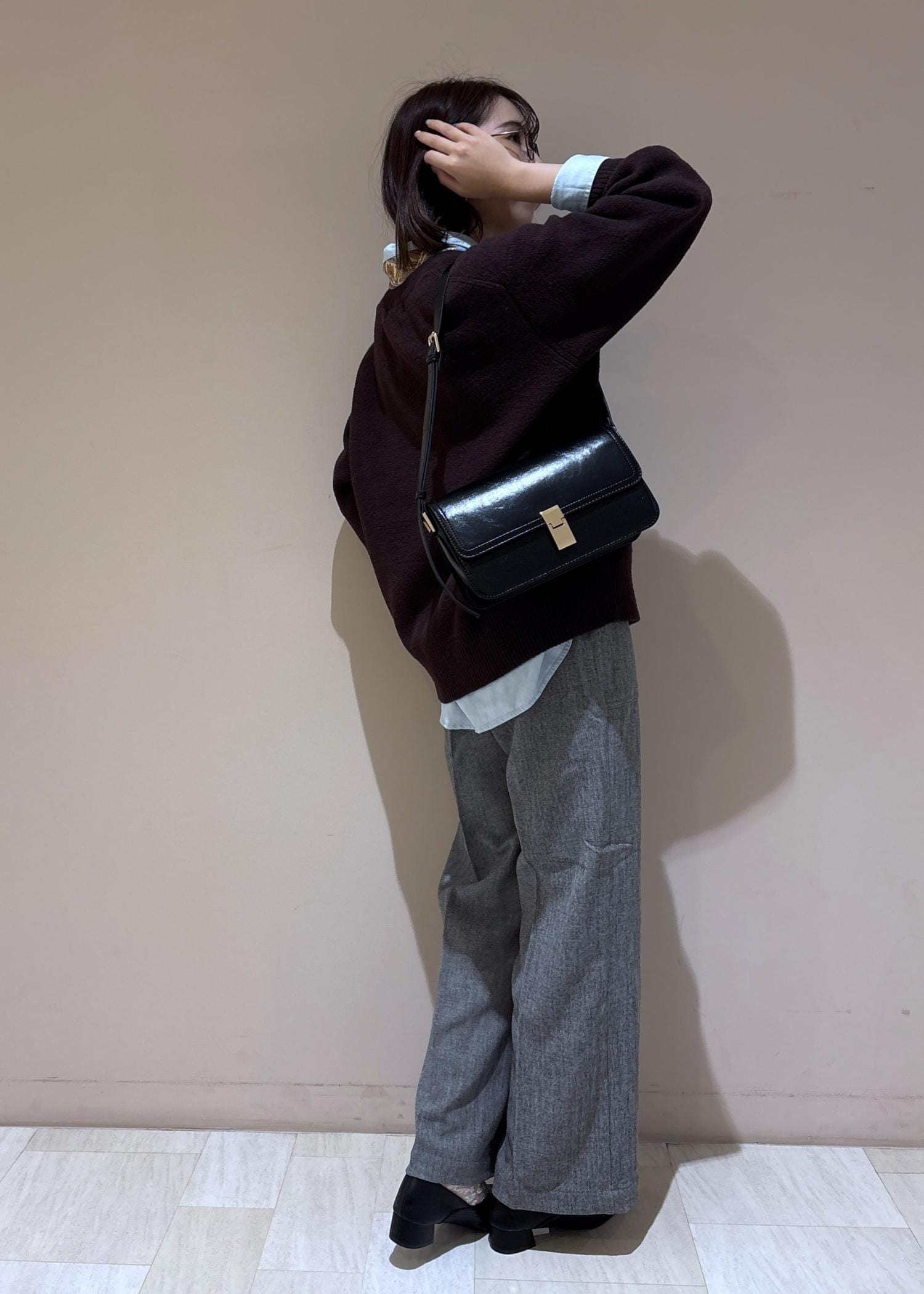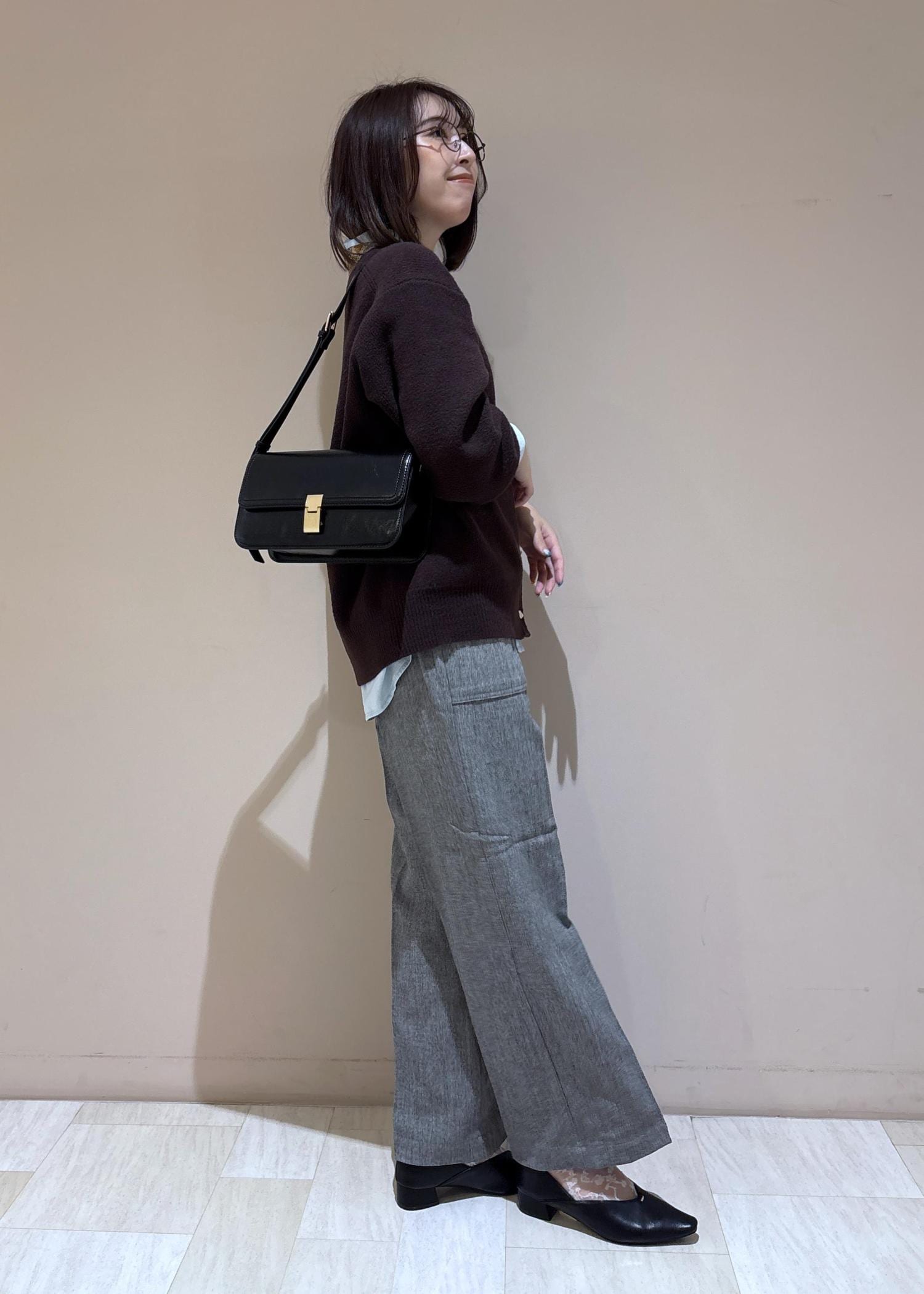 足元のバブーシュとバッグはブラックで統一を。