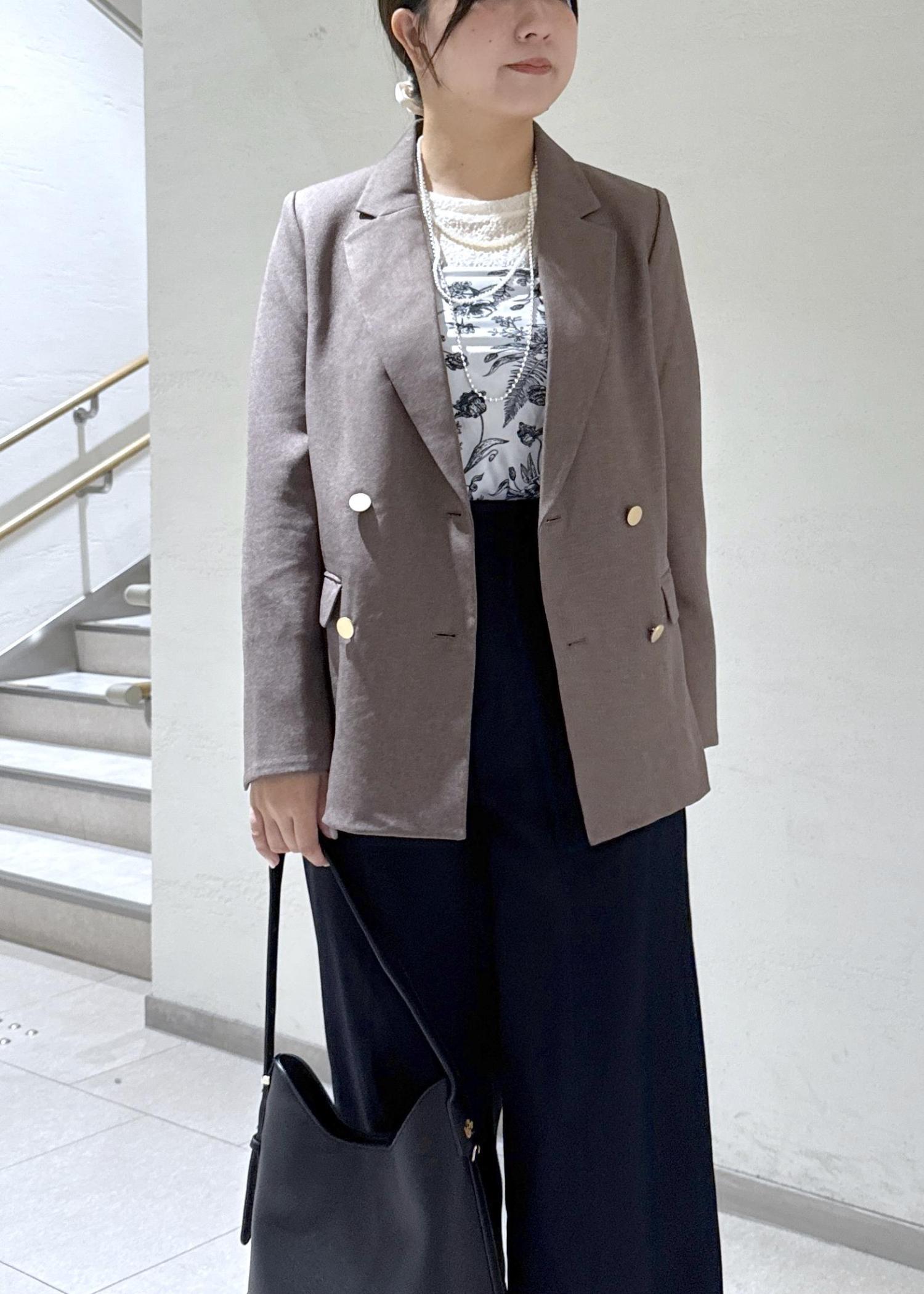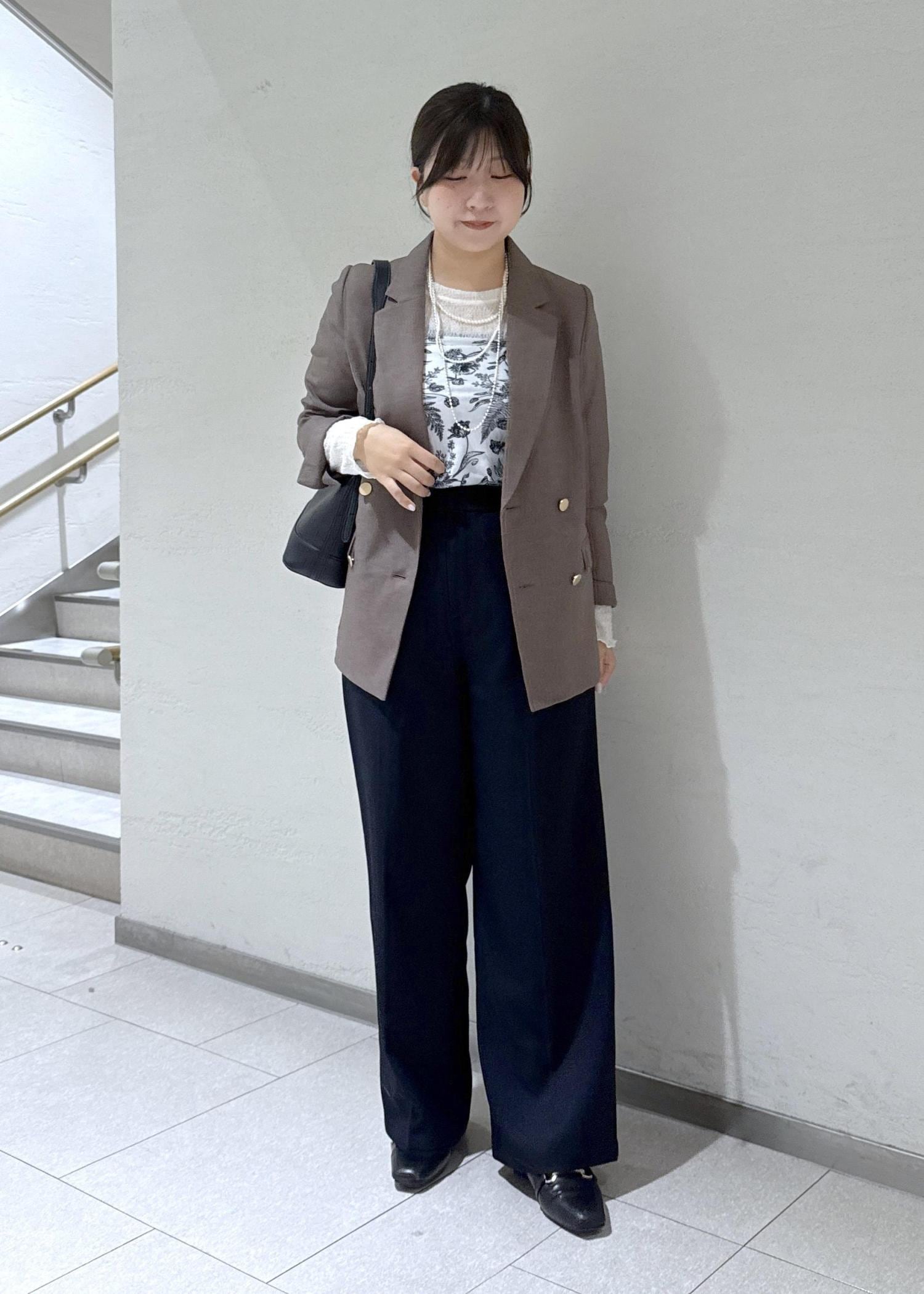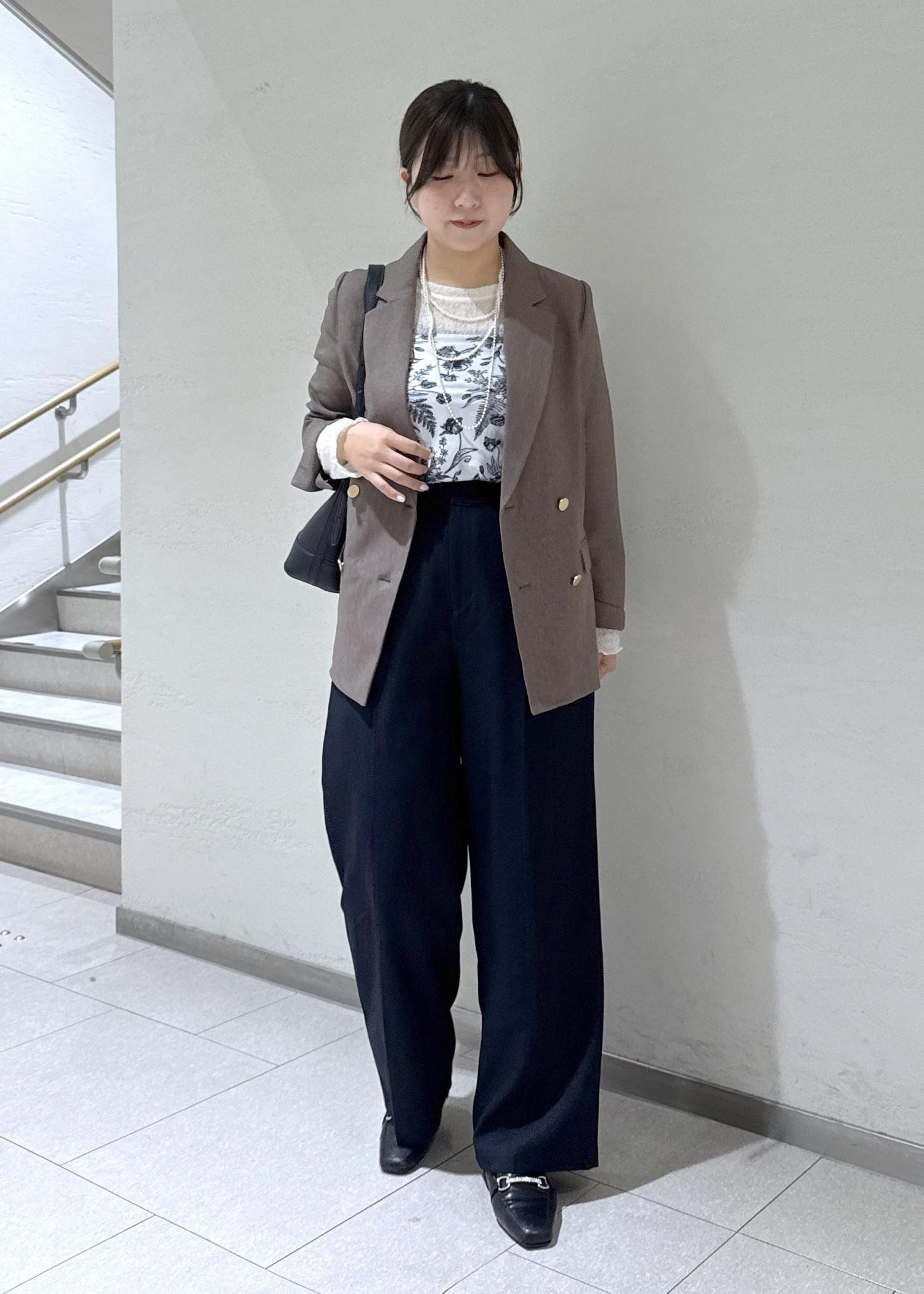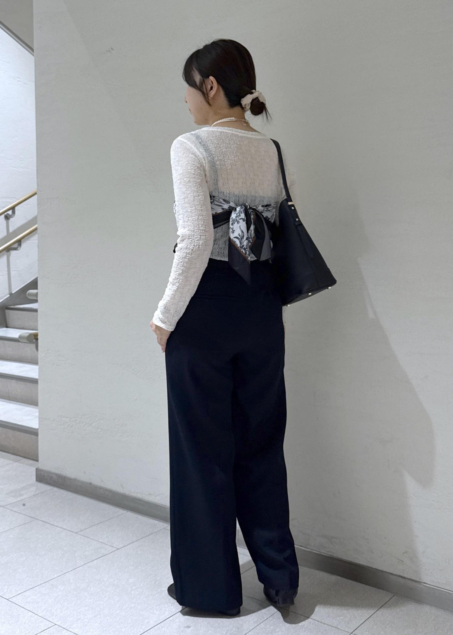 ジャケットが大きい分、インナーはフィット感のあるレースインナーとスカーフで引きしめました。