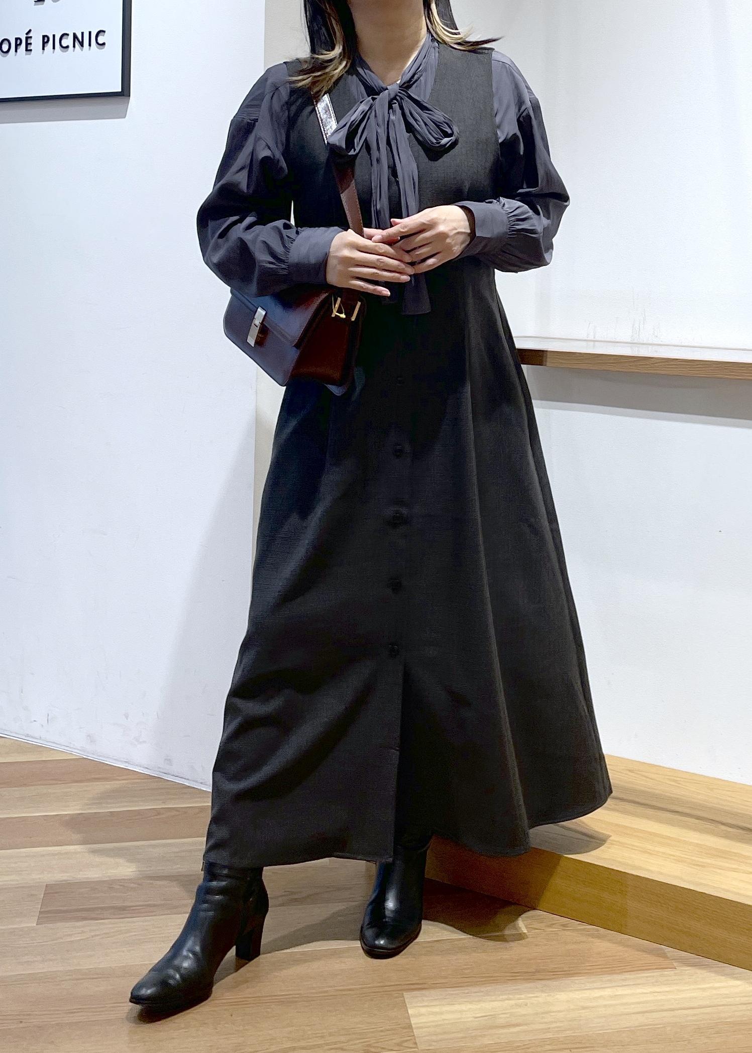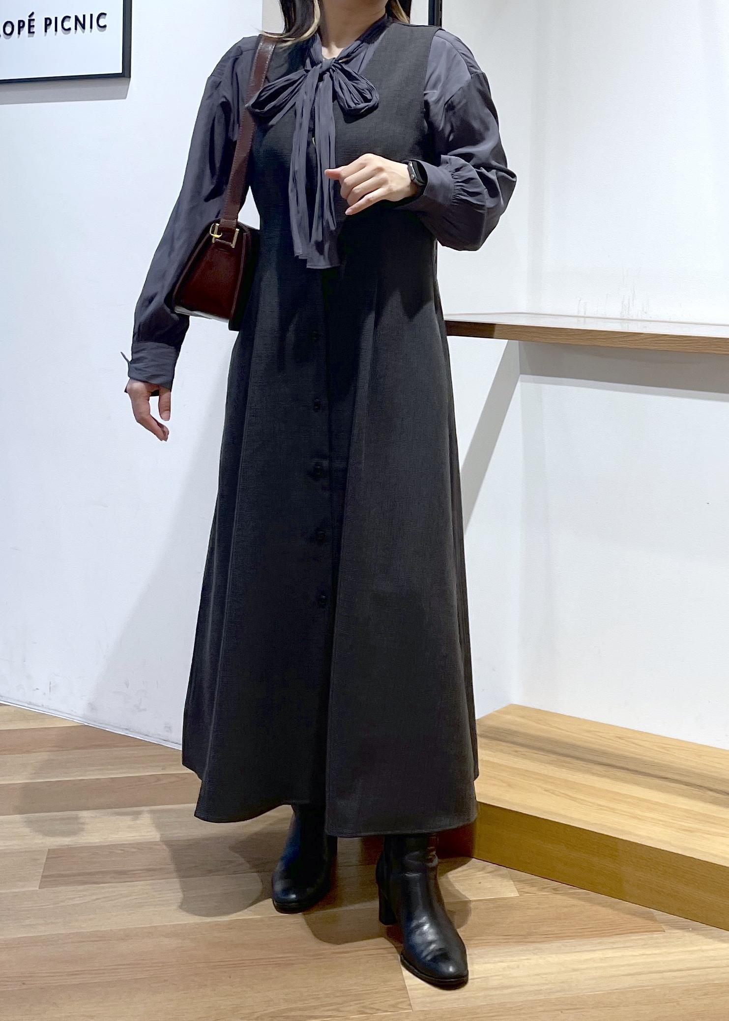 ワンピースとしてはもちろんロングジレとしても着用していただけます。ラインがとても綺麗でカッコいいと可愛いどちらでも使える万能ワンピースです。