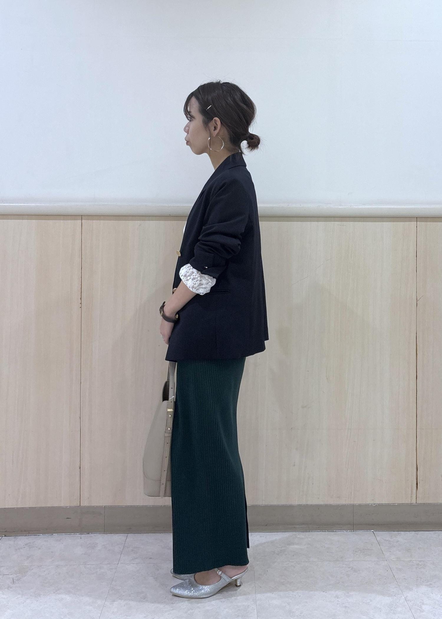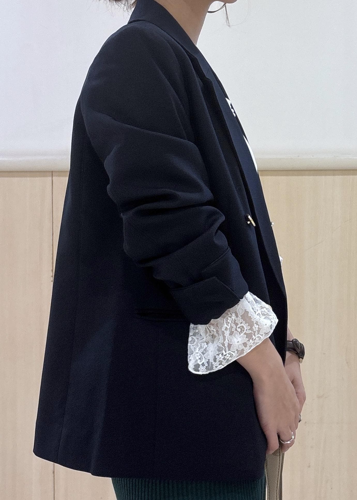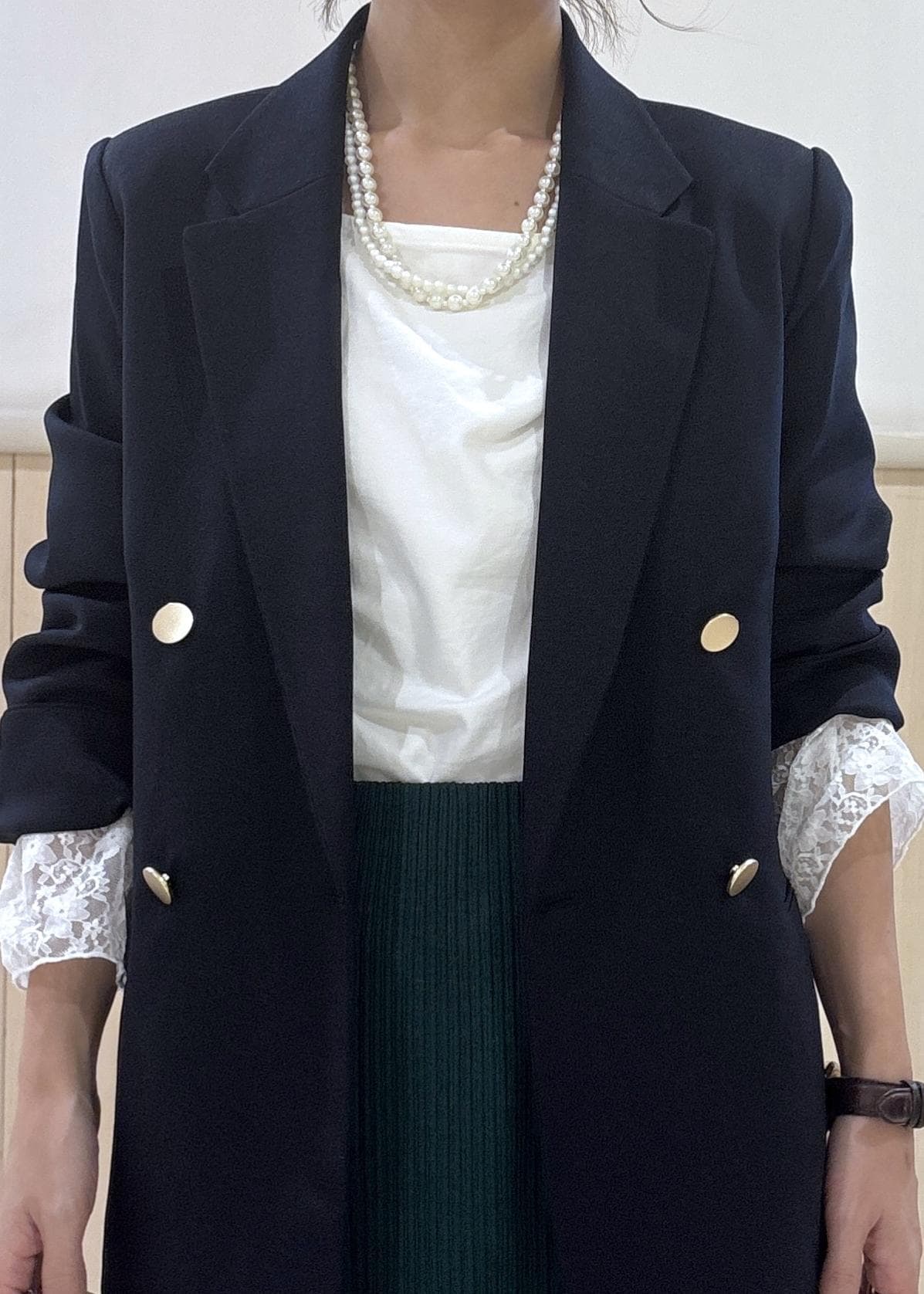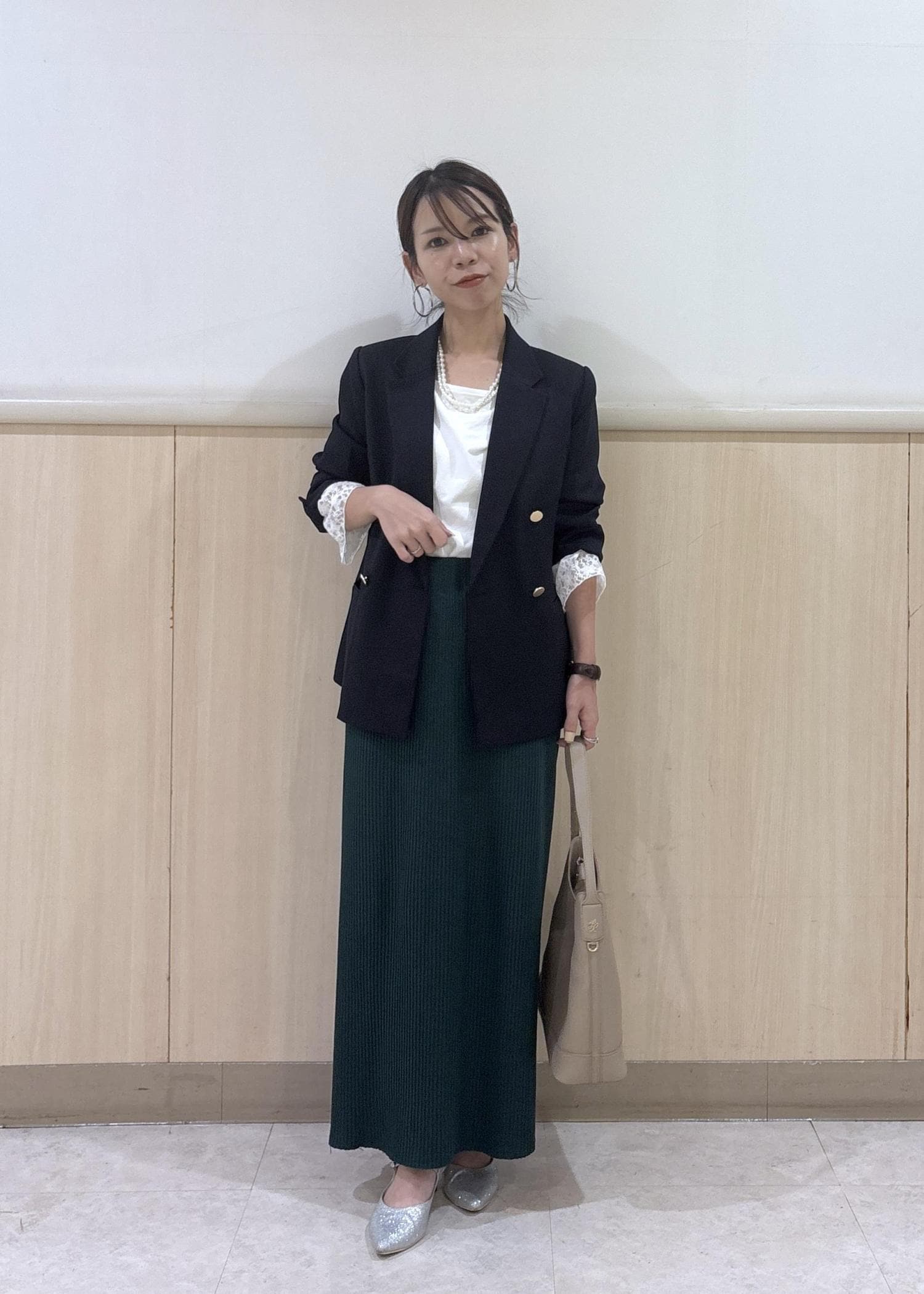 毎年人気の金ボタンジャケットにアイラインスカートと袖レースのトップスを合わせて