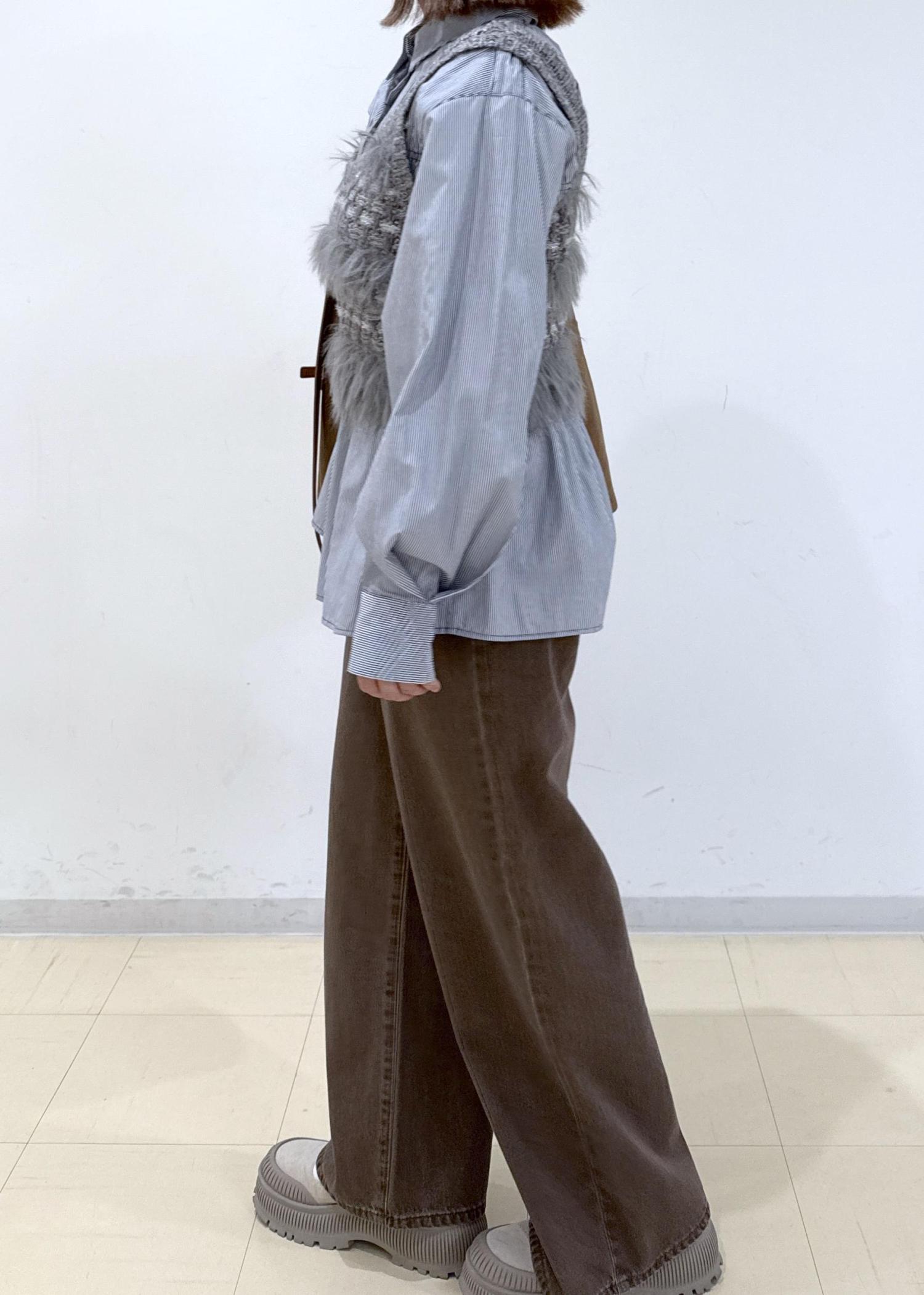 ブルーのシャツにブラウンのデニムとバッグを合わせたトレンドの色合わせを意識したコーディネートにしました♩