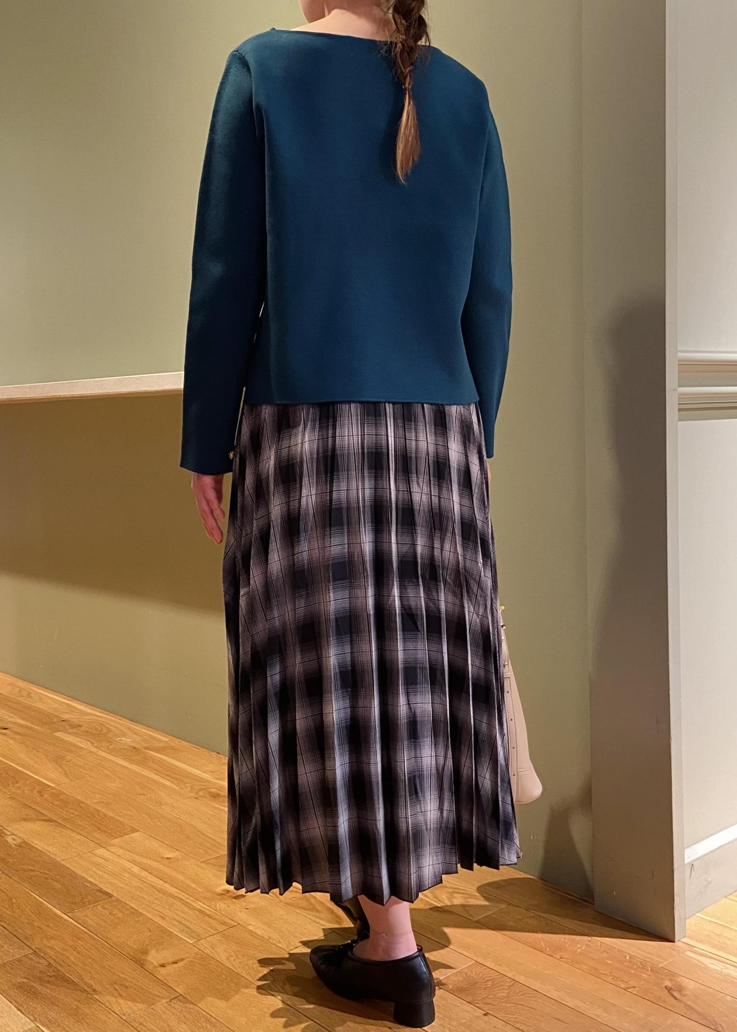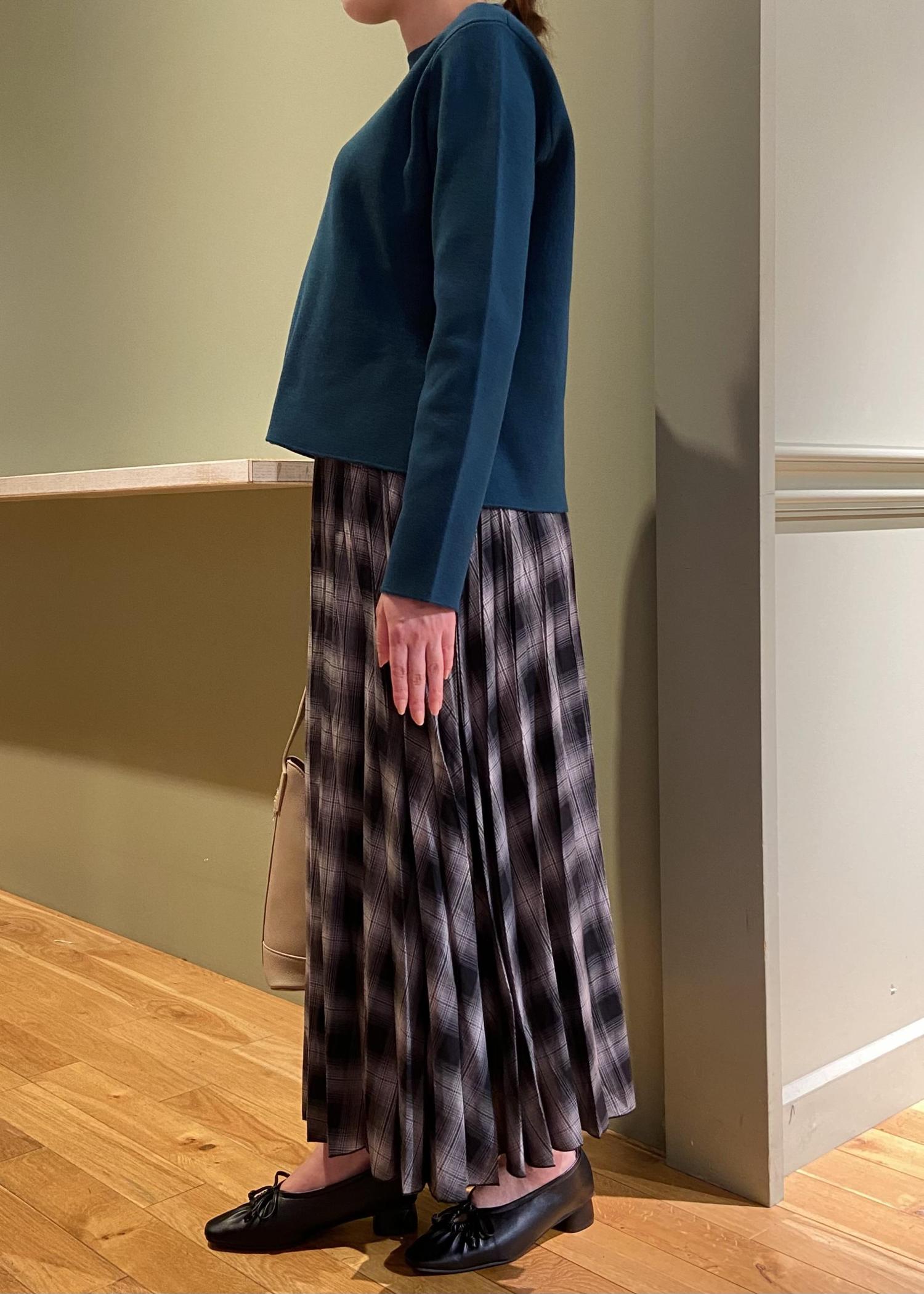 深みのあるグリーンのニットにグレーを基調としたチェック柄のスカートを合わせた大人カジュアルなコーデにしました。
