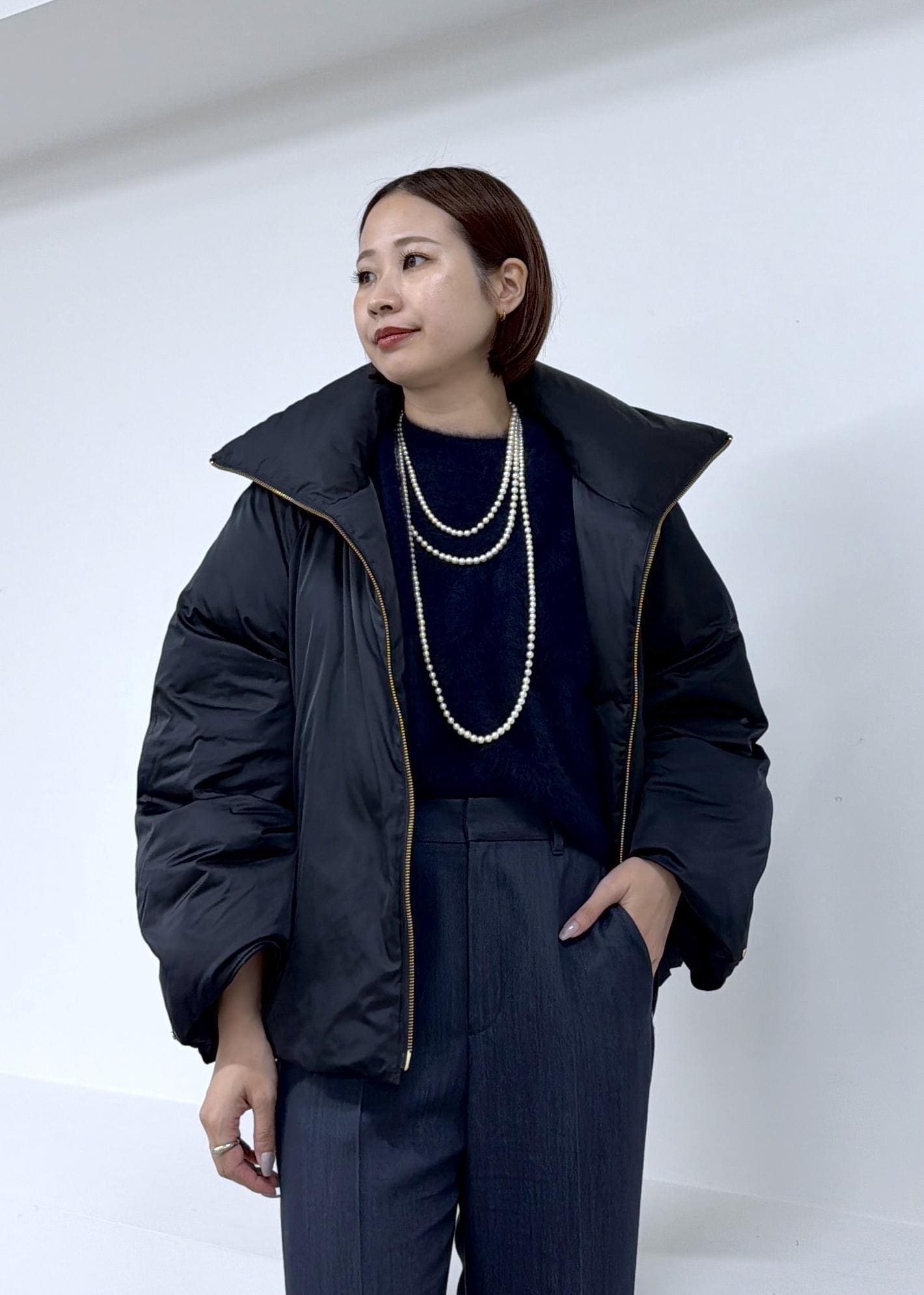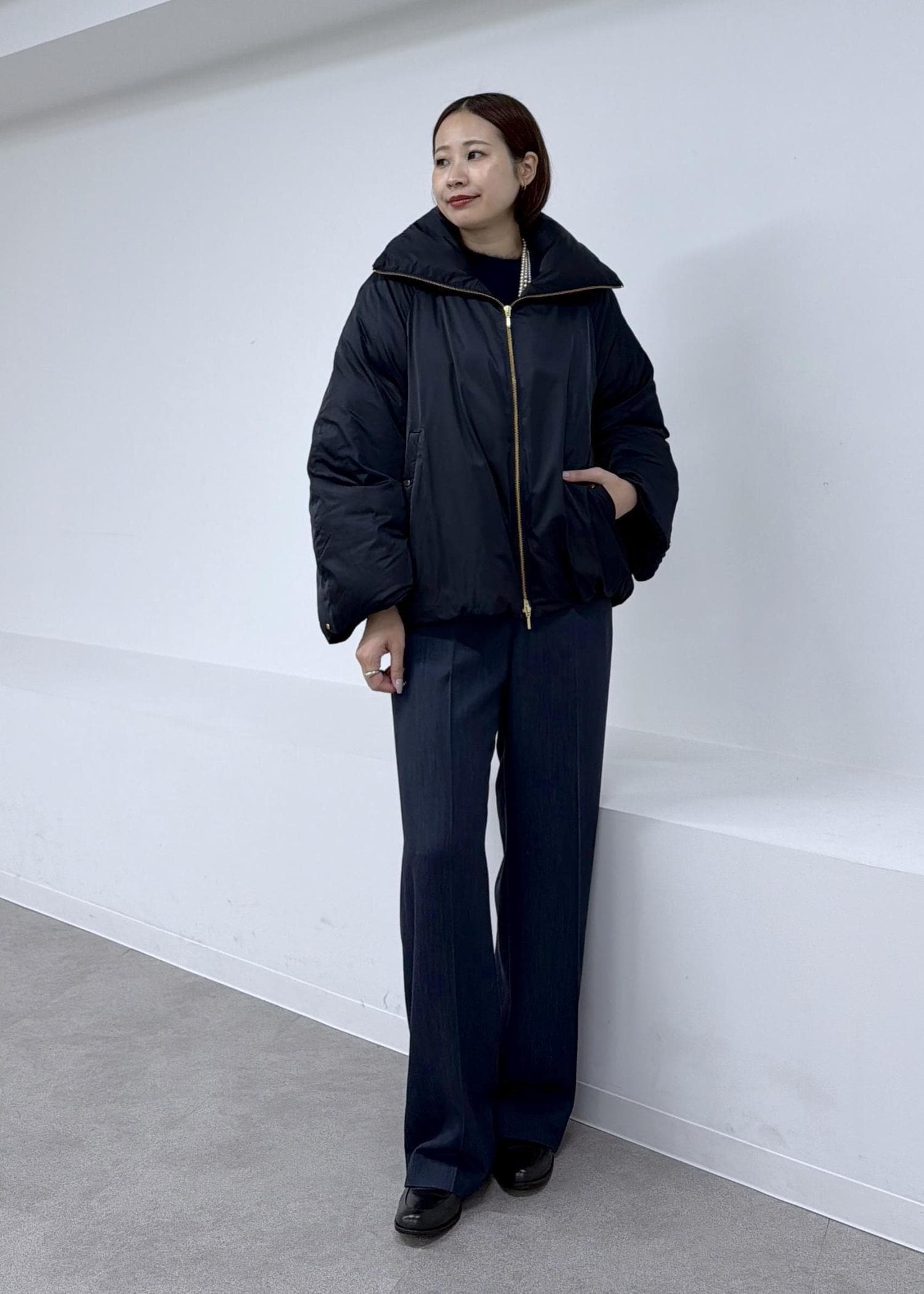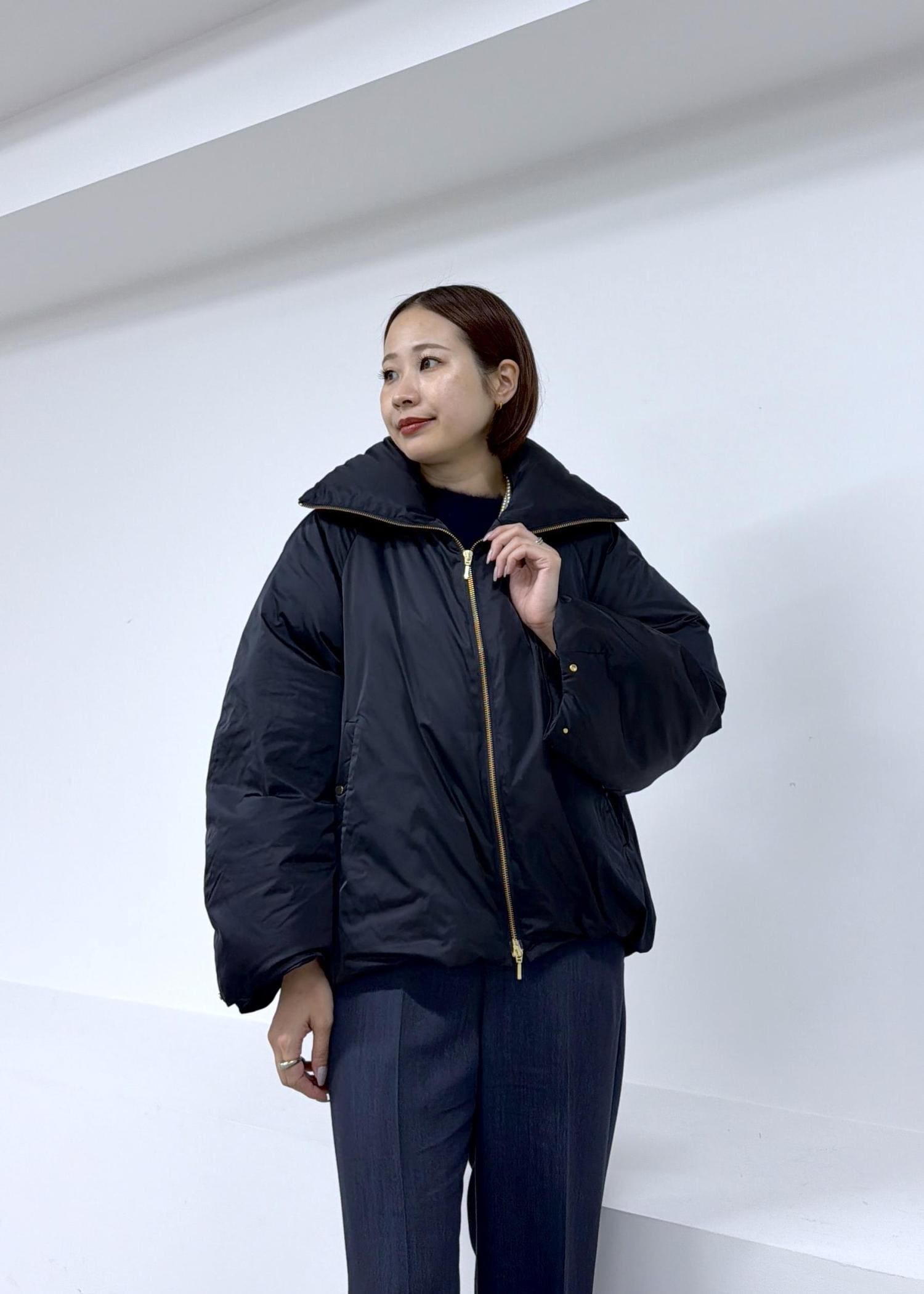 NEW!ROPÉハイネックジップショート丈ダウンコート/イージーケア・撥水ネイビー / F¥53,900レビュー161cmフリーサイズ着用。