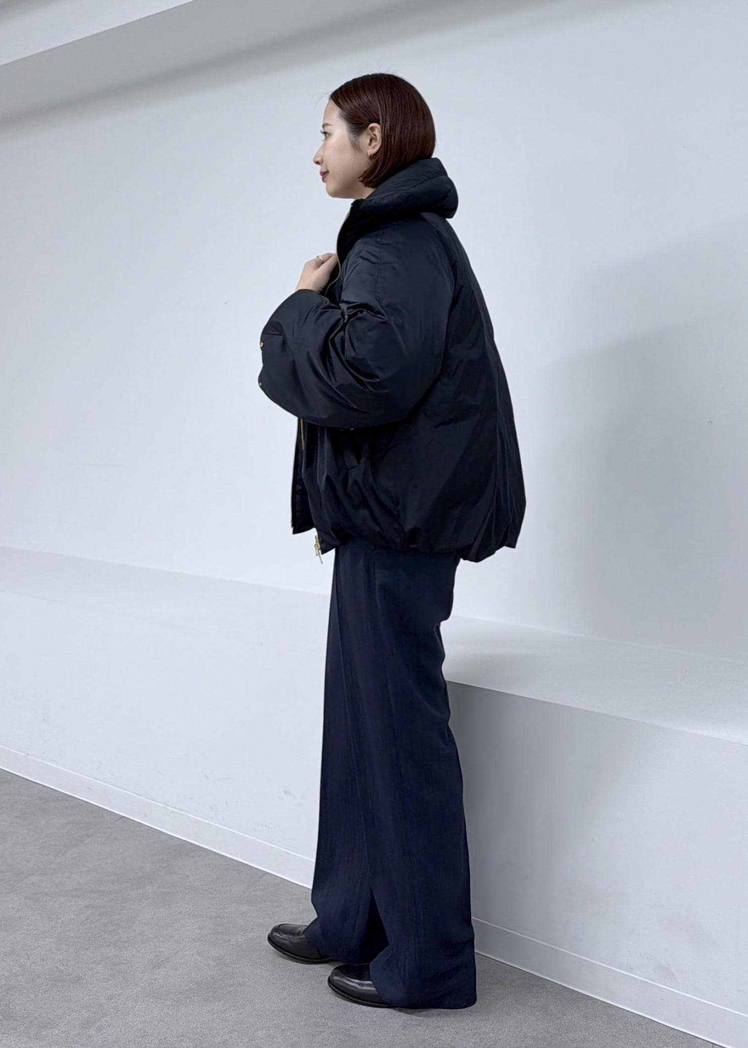 アーム、身幅はゆとりのあるサイズ感なので生地感が厚めのニットなどを着ても窮屈感なく羽織ることができます。