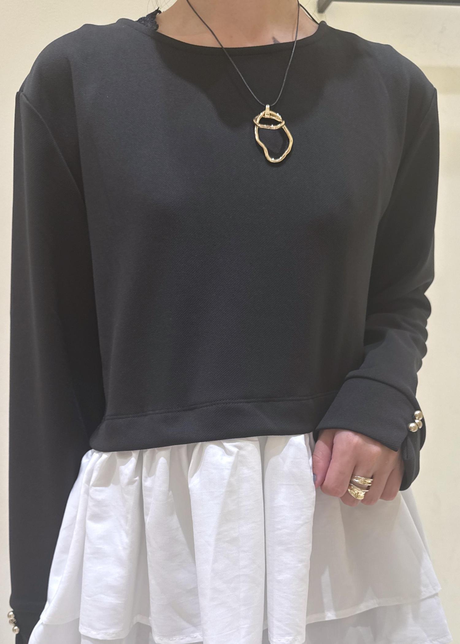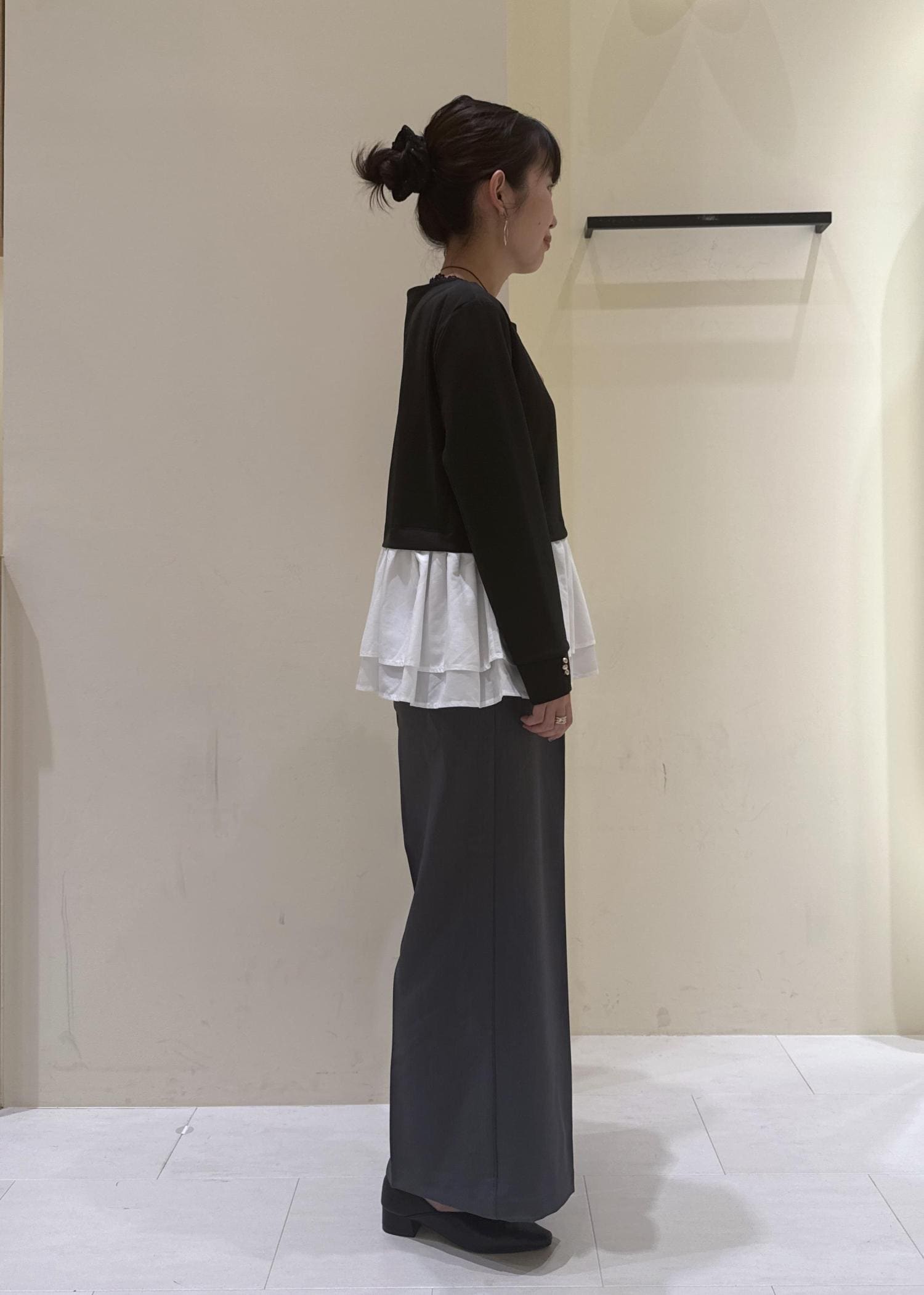 レイヤード風のドッキングトップスにシンプルなワイドパンツを合わせたシンプルコーデです。
