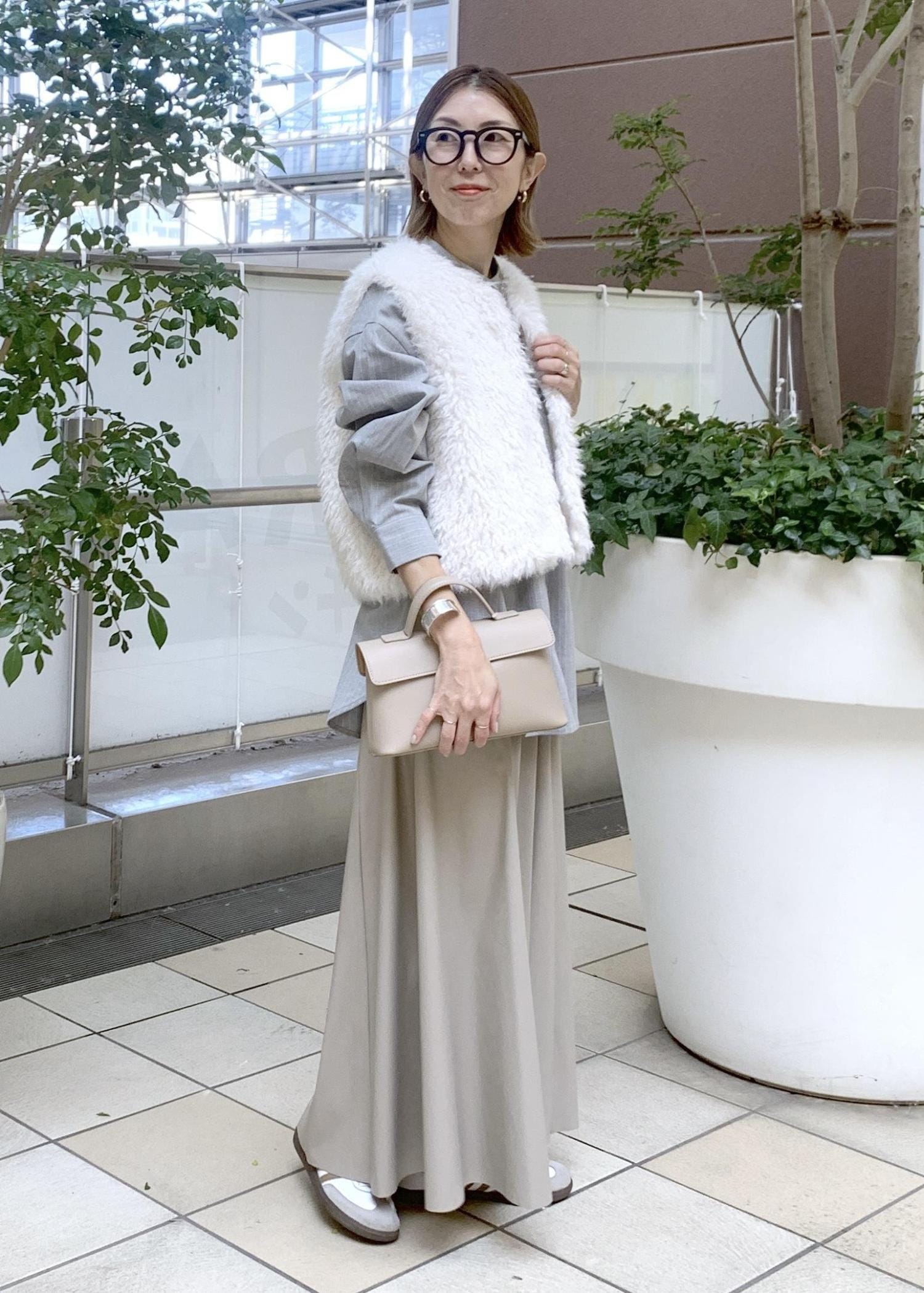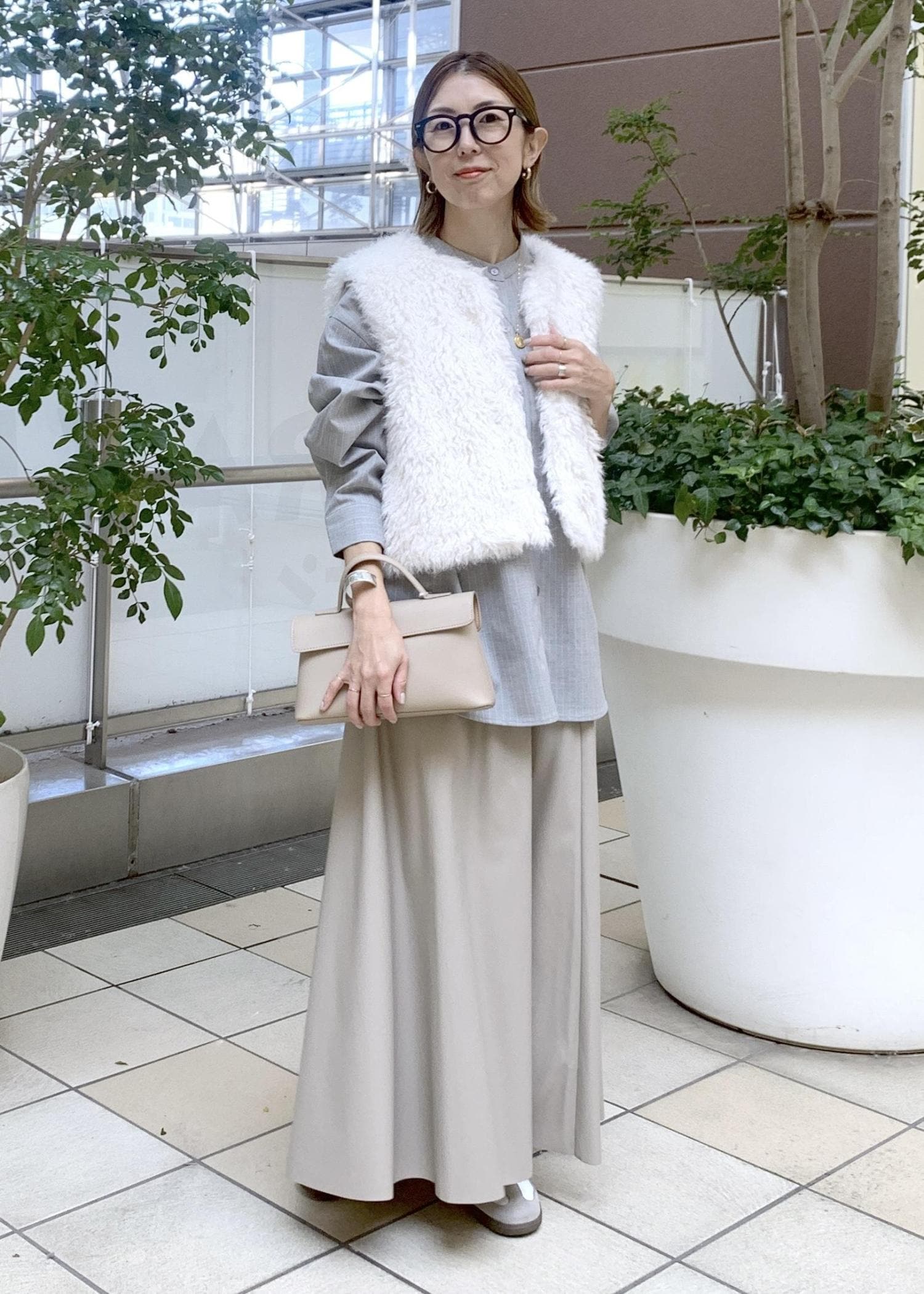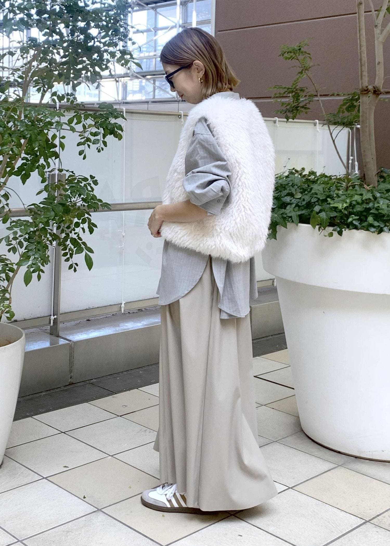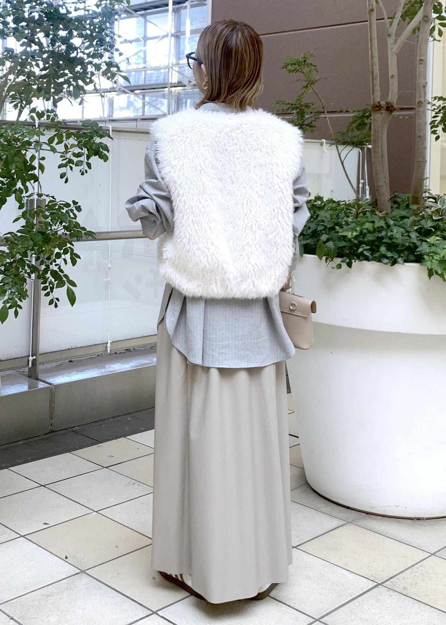 シンプルなスタイリングにプラスするだけでこなれたコーデになるフェイクファーベスト。