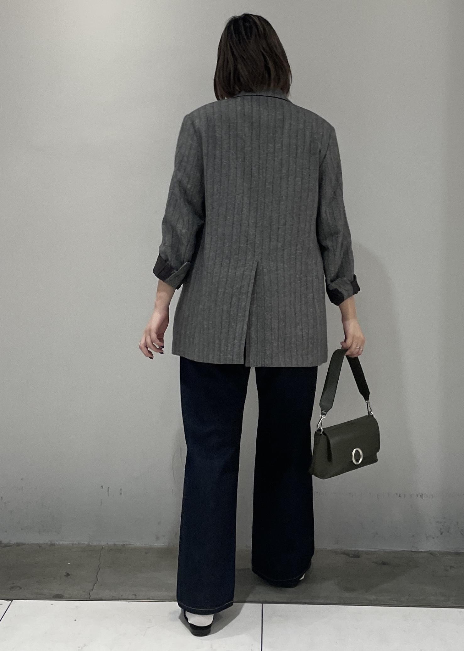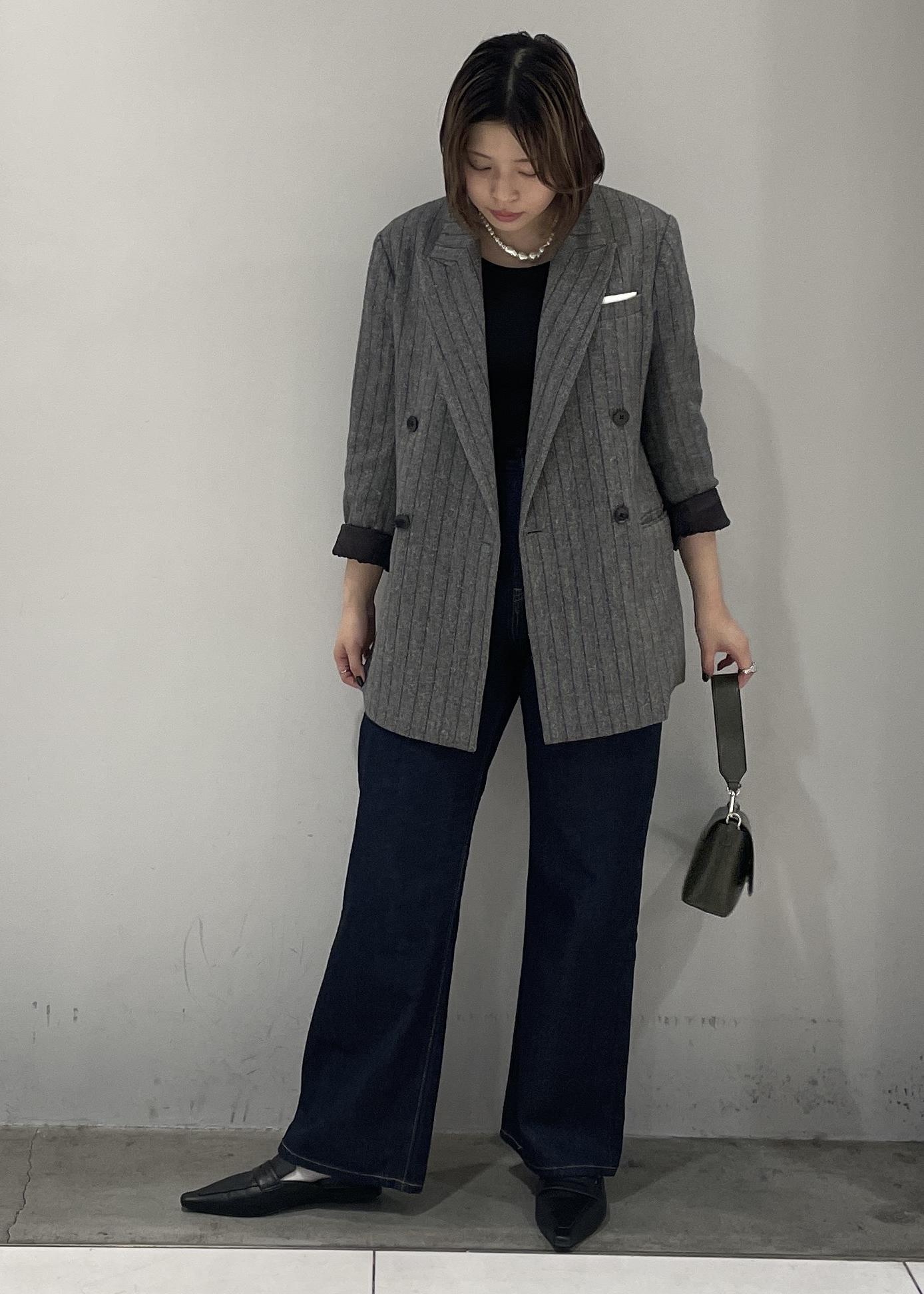 ジャケットにデニムジーンズという、シンプルな合わせではありますが、ジャケットの生地感やストライプのデザインが程よく個性を引き出してくれています◎