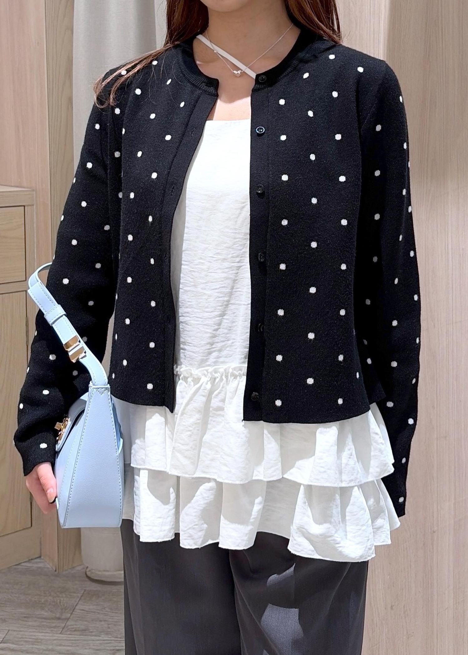 VISドットジャガードカーディガンブラック系 / F¥5,929レビュー程よくゆとりがあるサイズ感でシャツなどをレイヤードする余裕もあります!丈感も程よくコンパクトですっきりと着れます◎