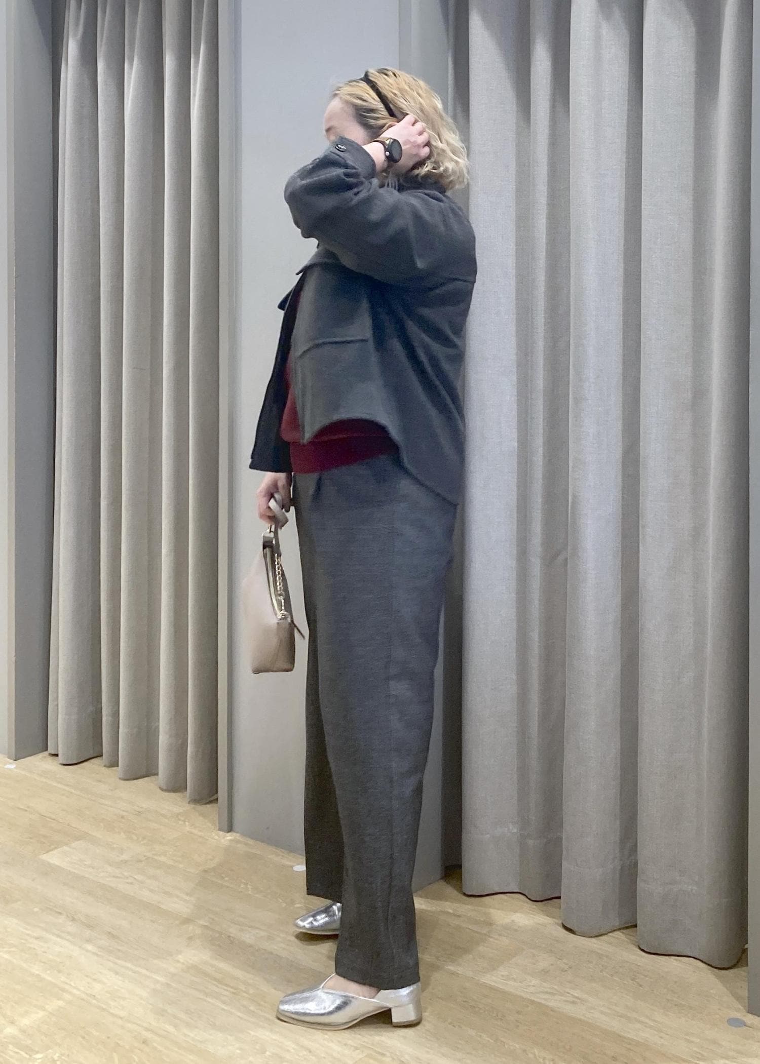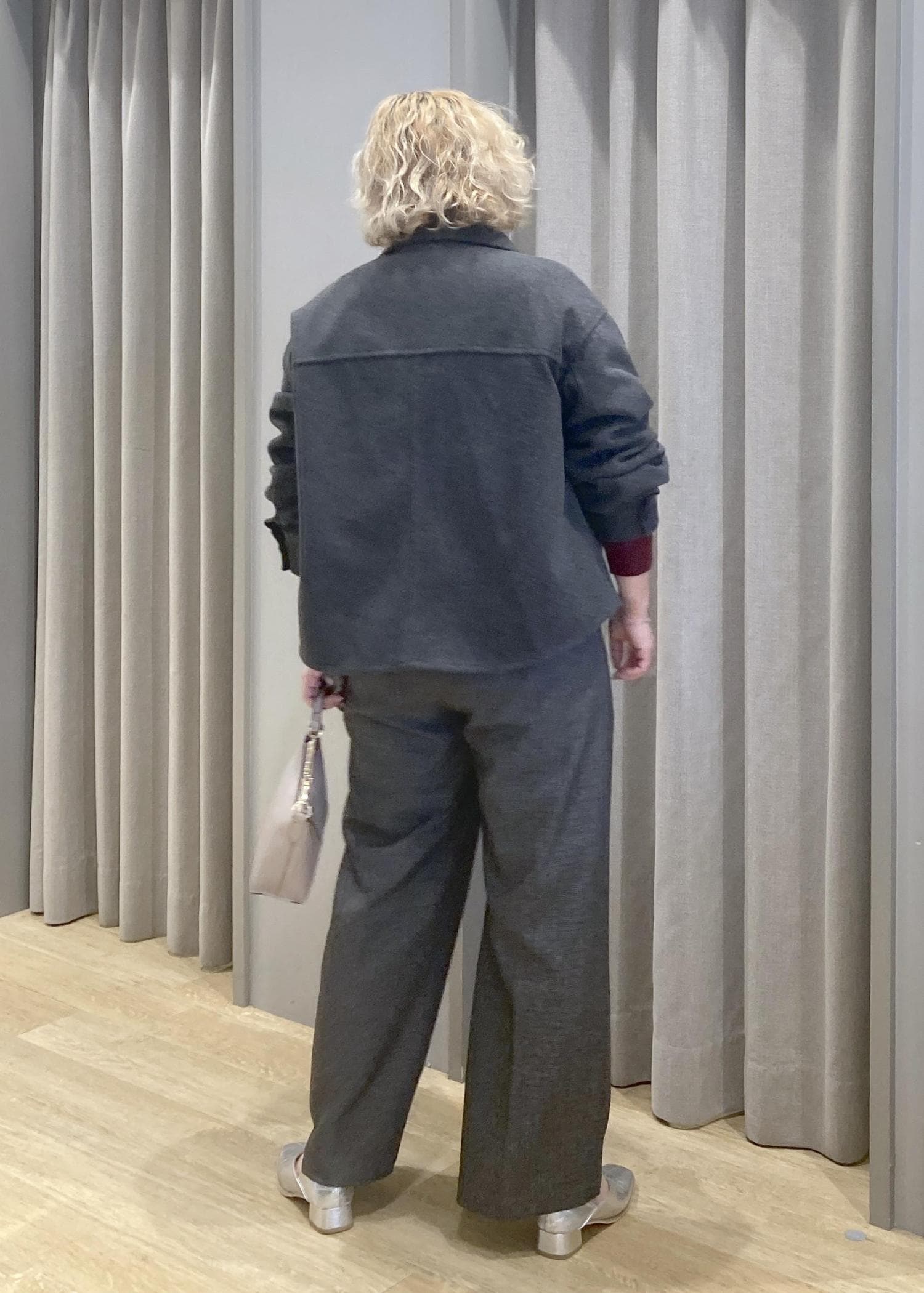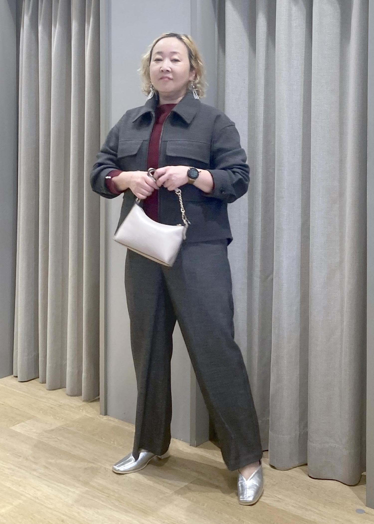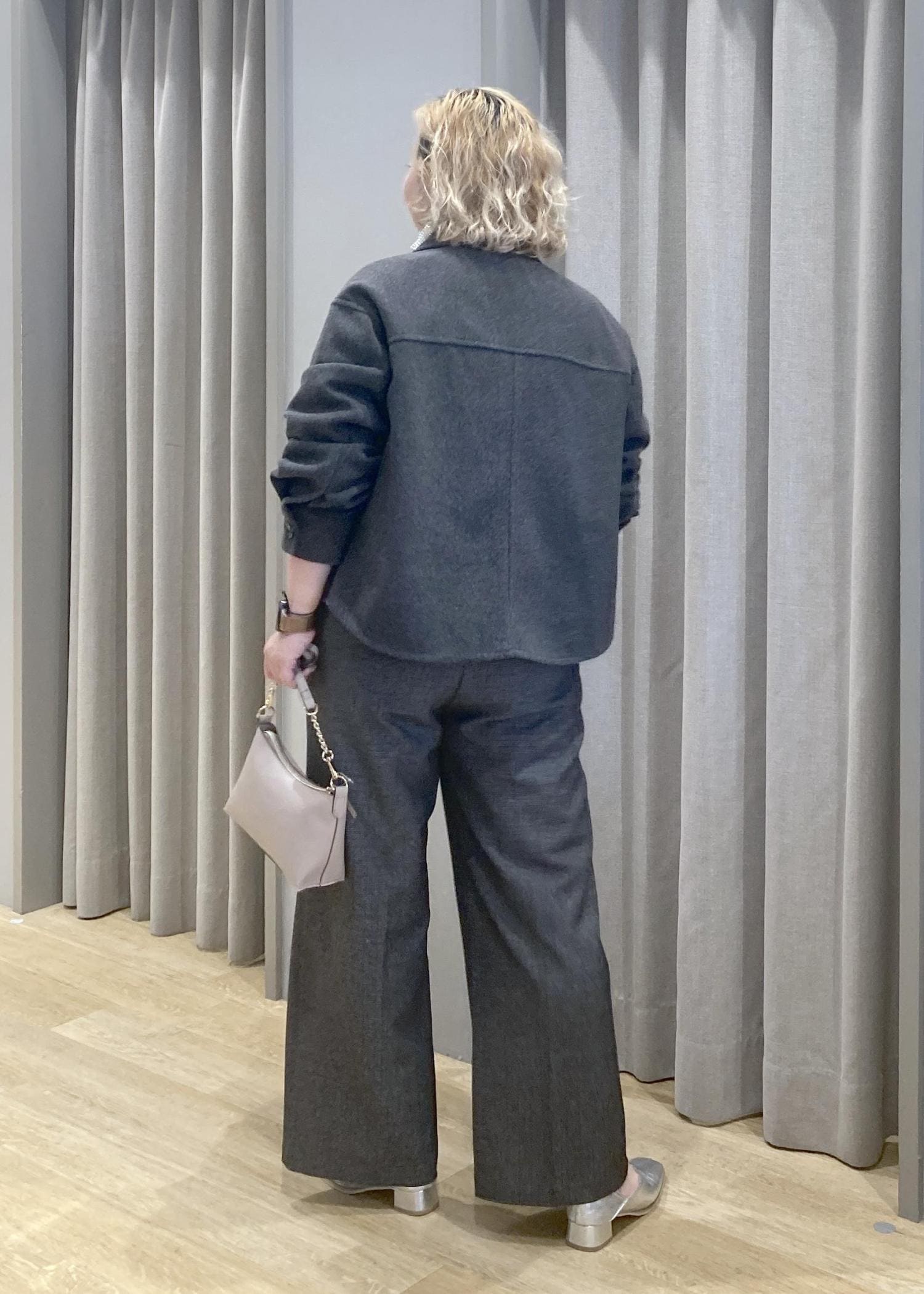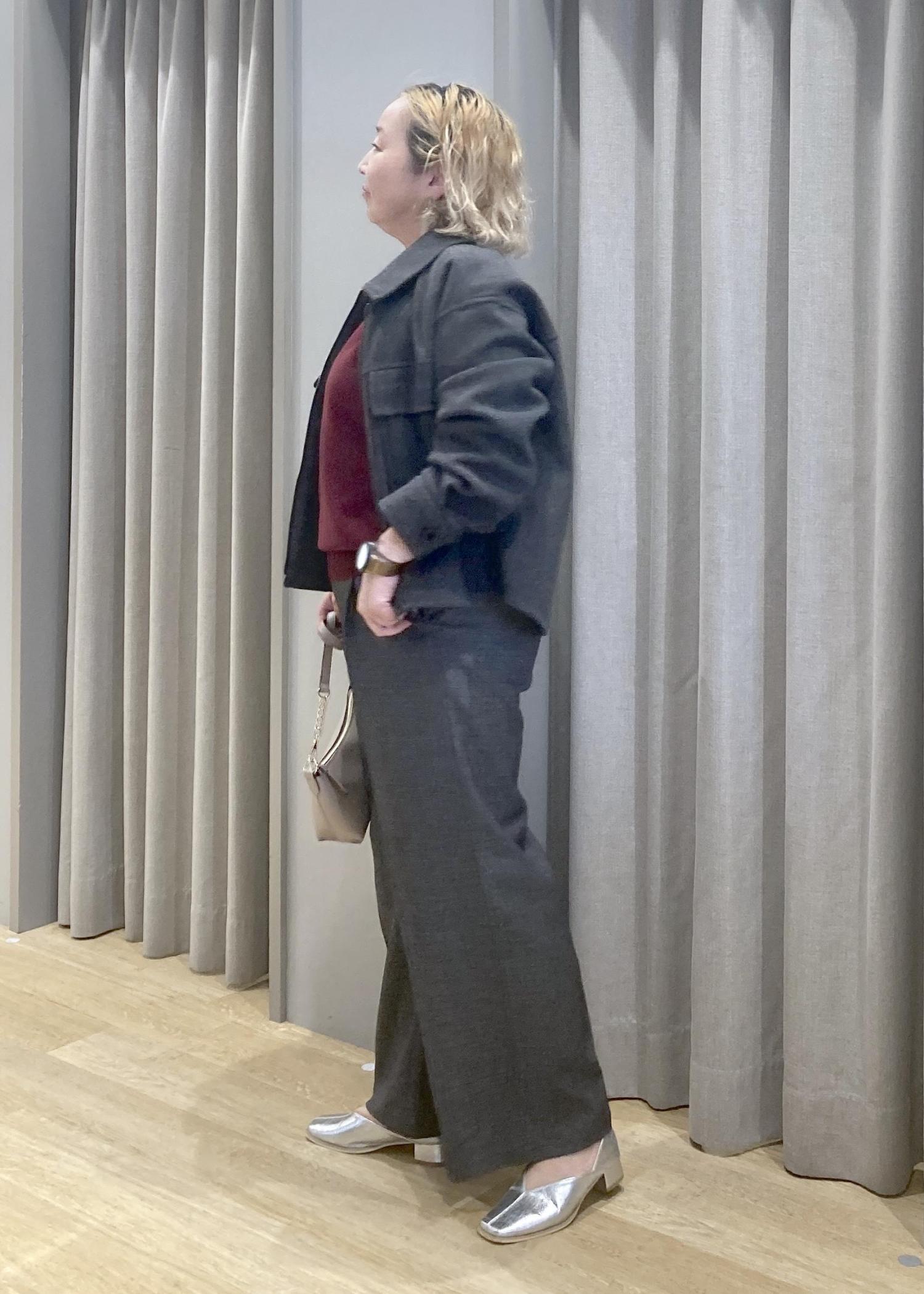 ゆったりシルエットのジャケットとパンツで、さりげなく体型カバー。