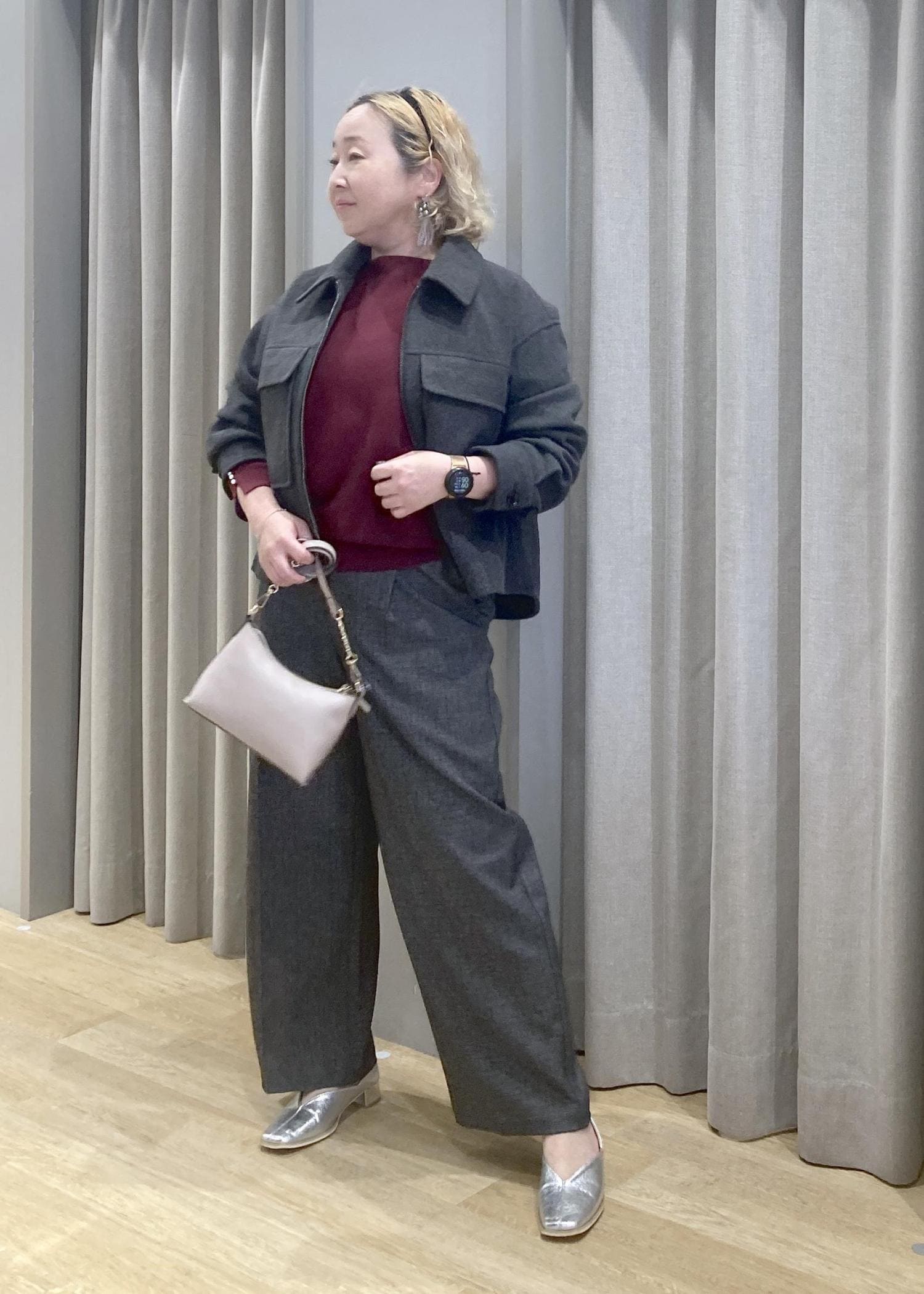 深みのあるバーガンディのトップスを差し色にすれば、ぐっと上品な印象になります。