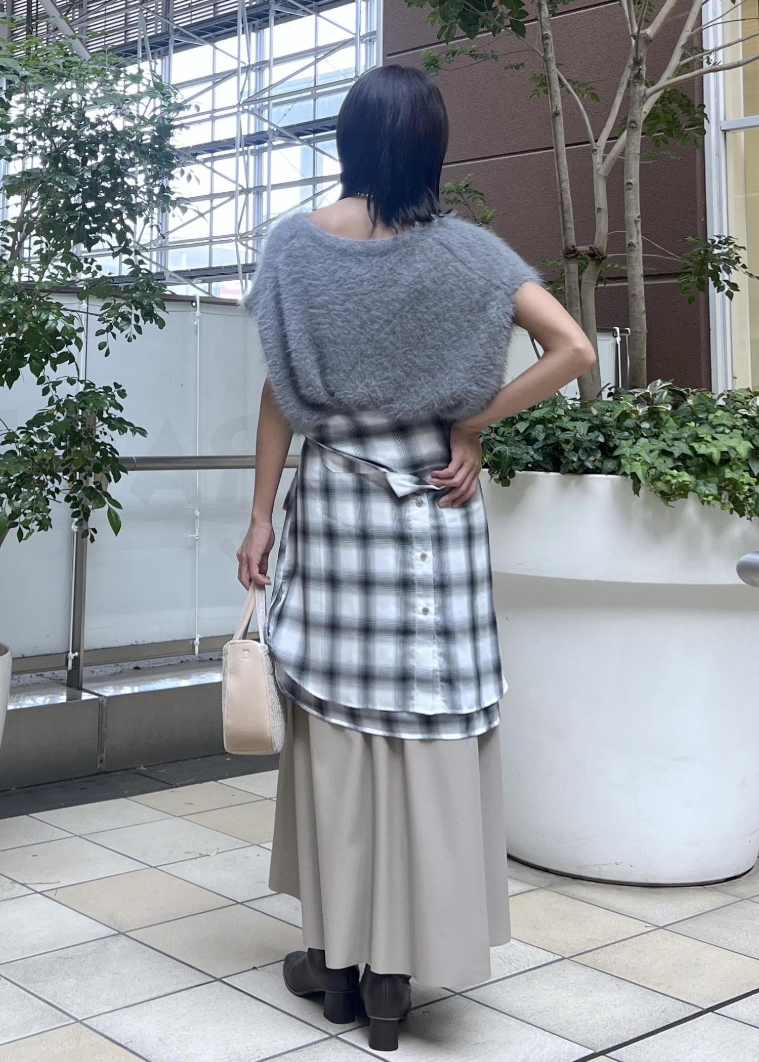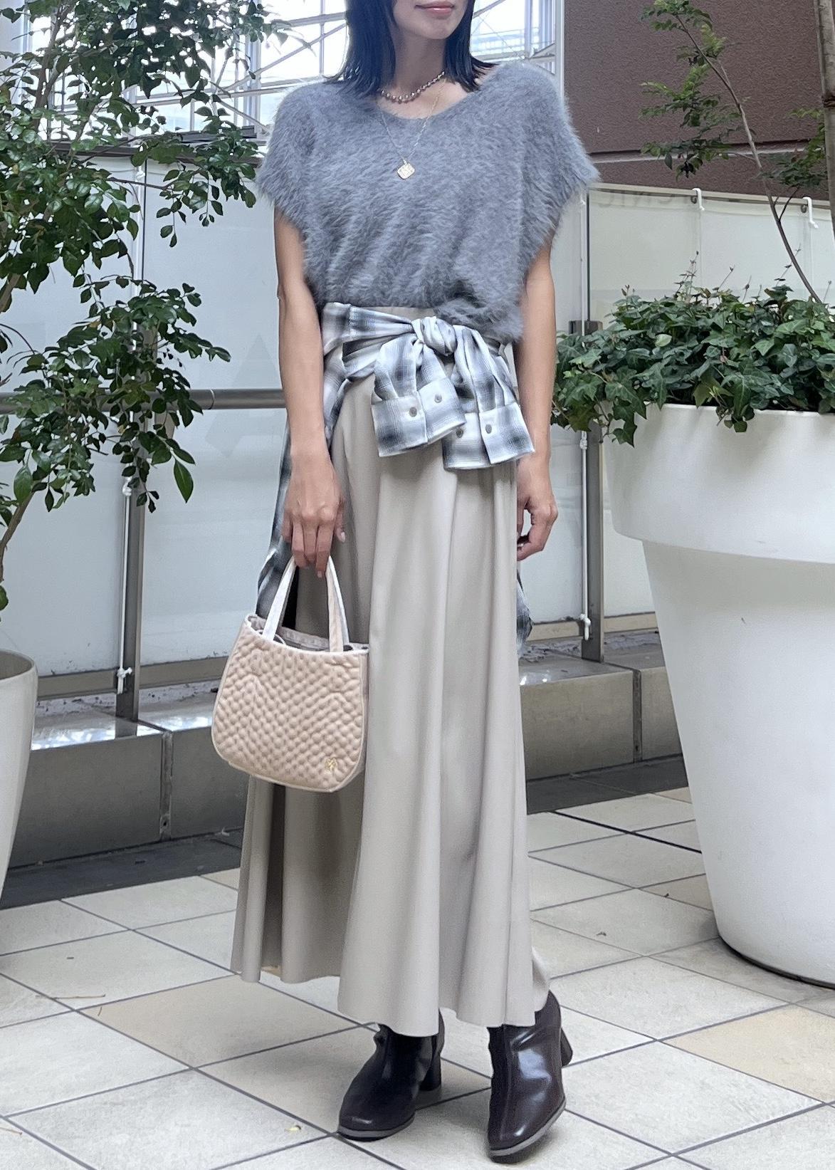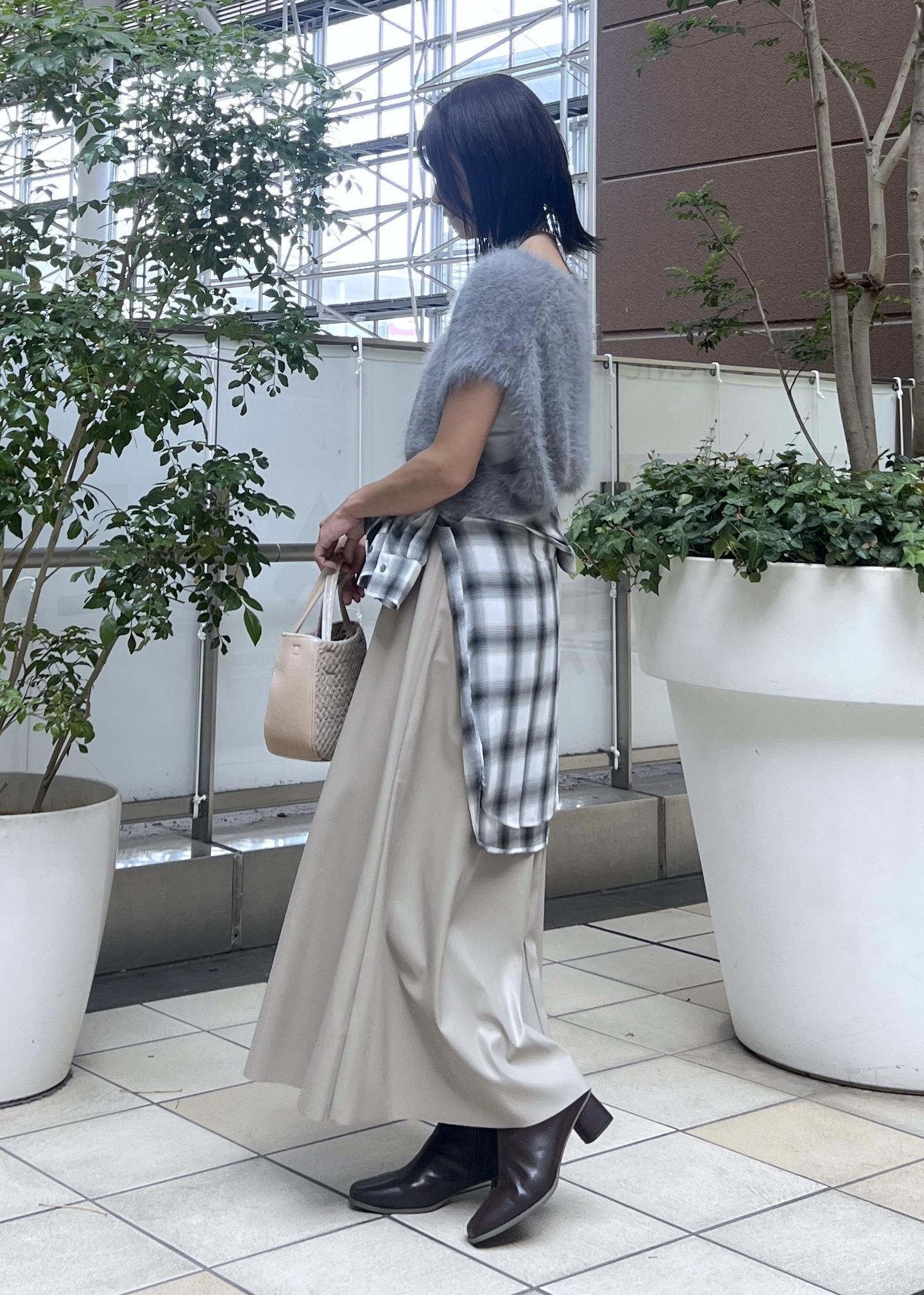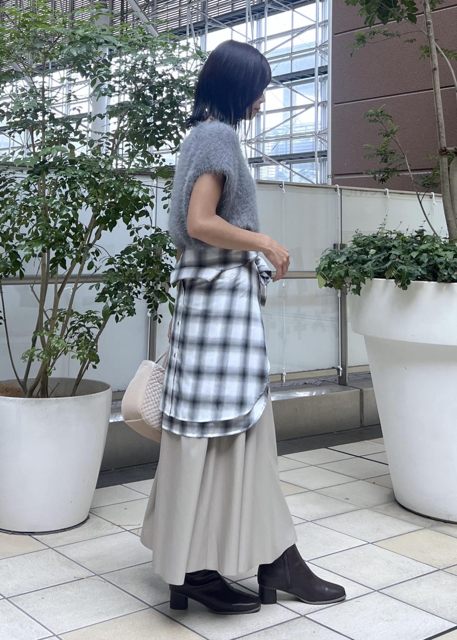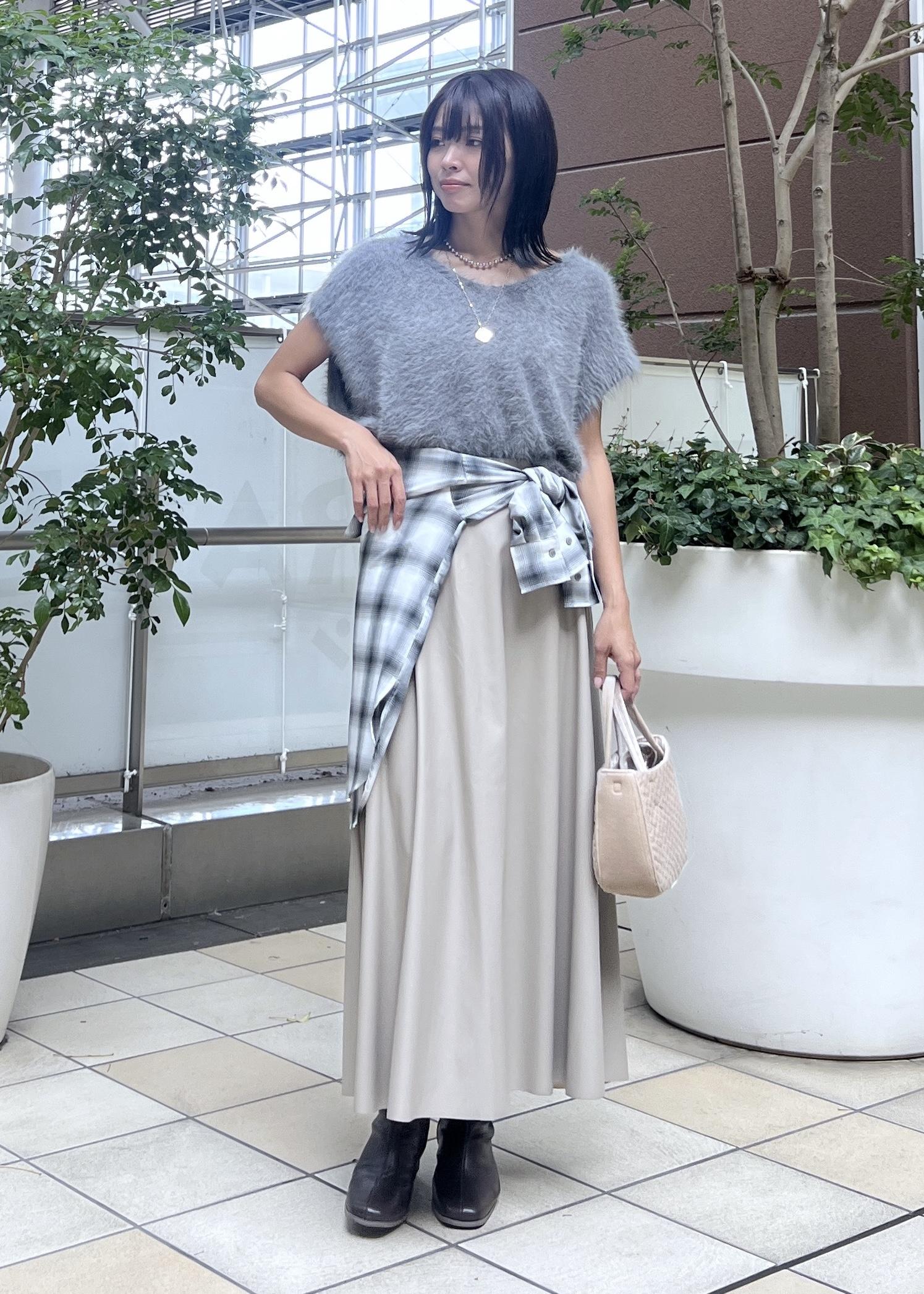 ふんわりした肌触りのフェザーニットのベストは、レザースカートと合わせて秋スタイルに。