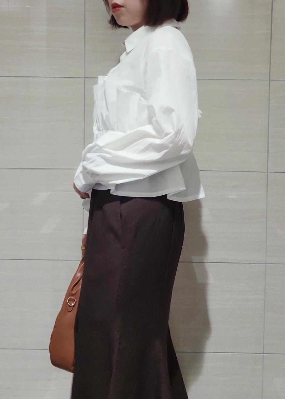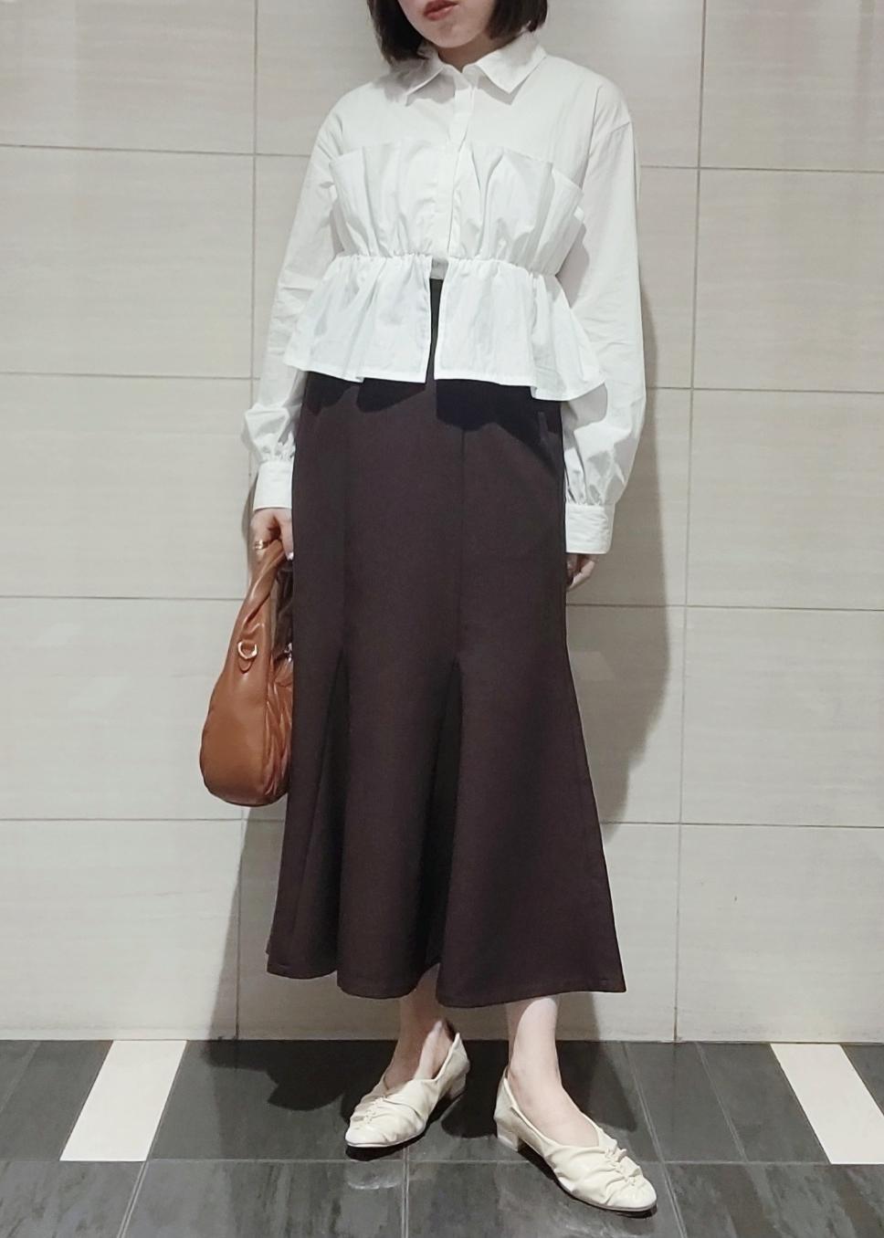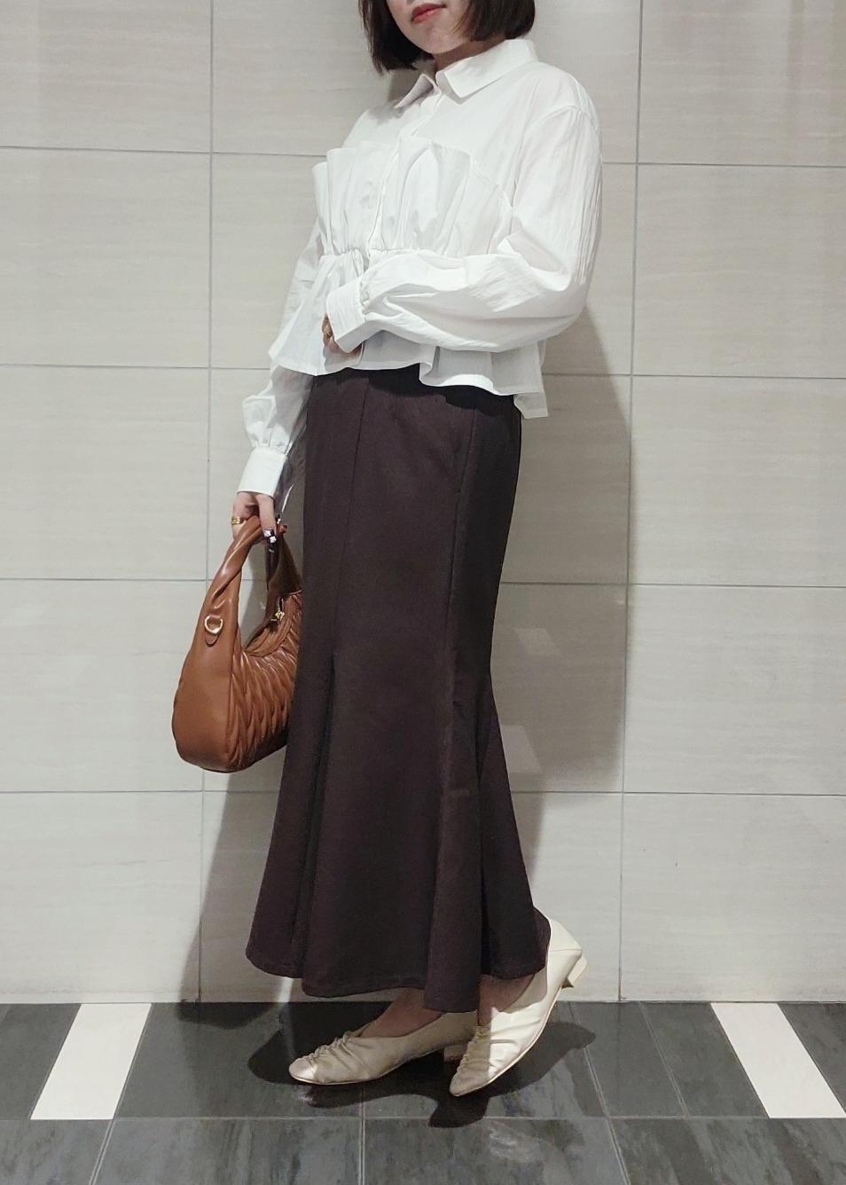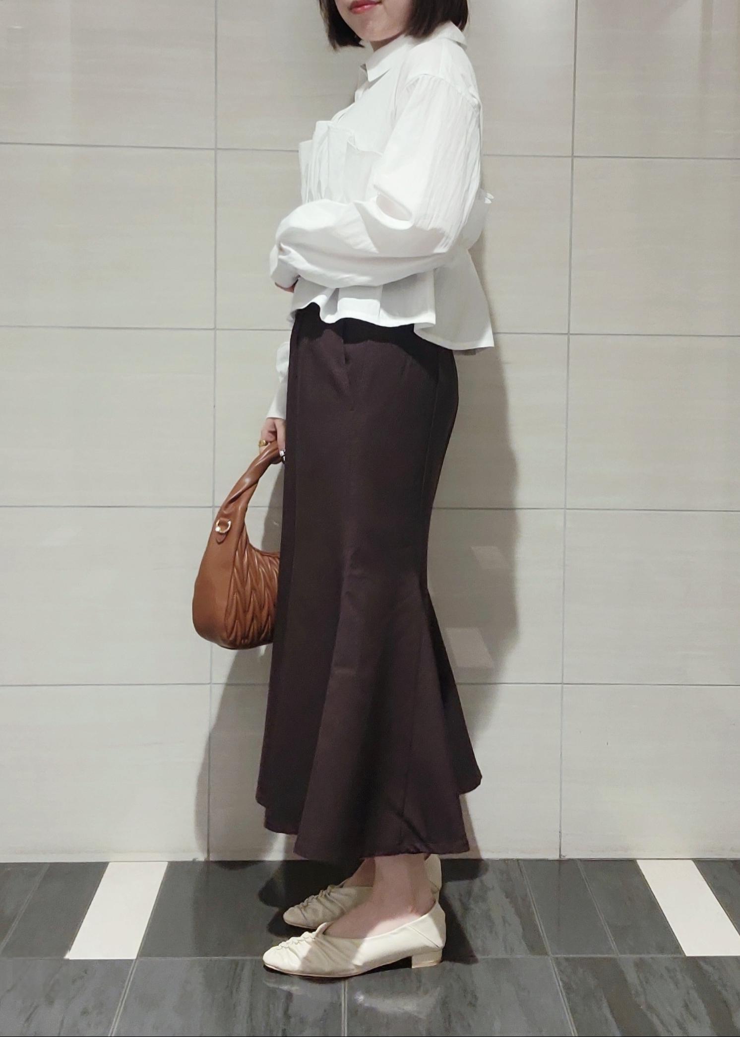 デザイン性のあるブラウスにマーメイドスカートを合わせてシンプル見えしないきれいめコーデにしました!