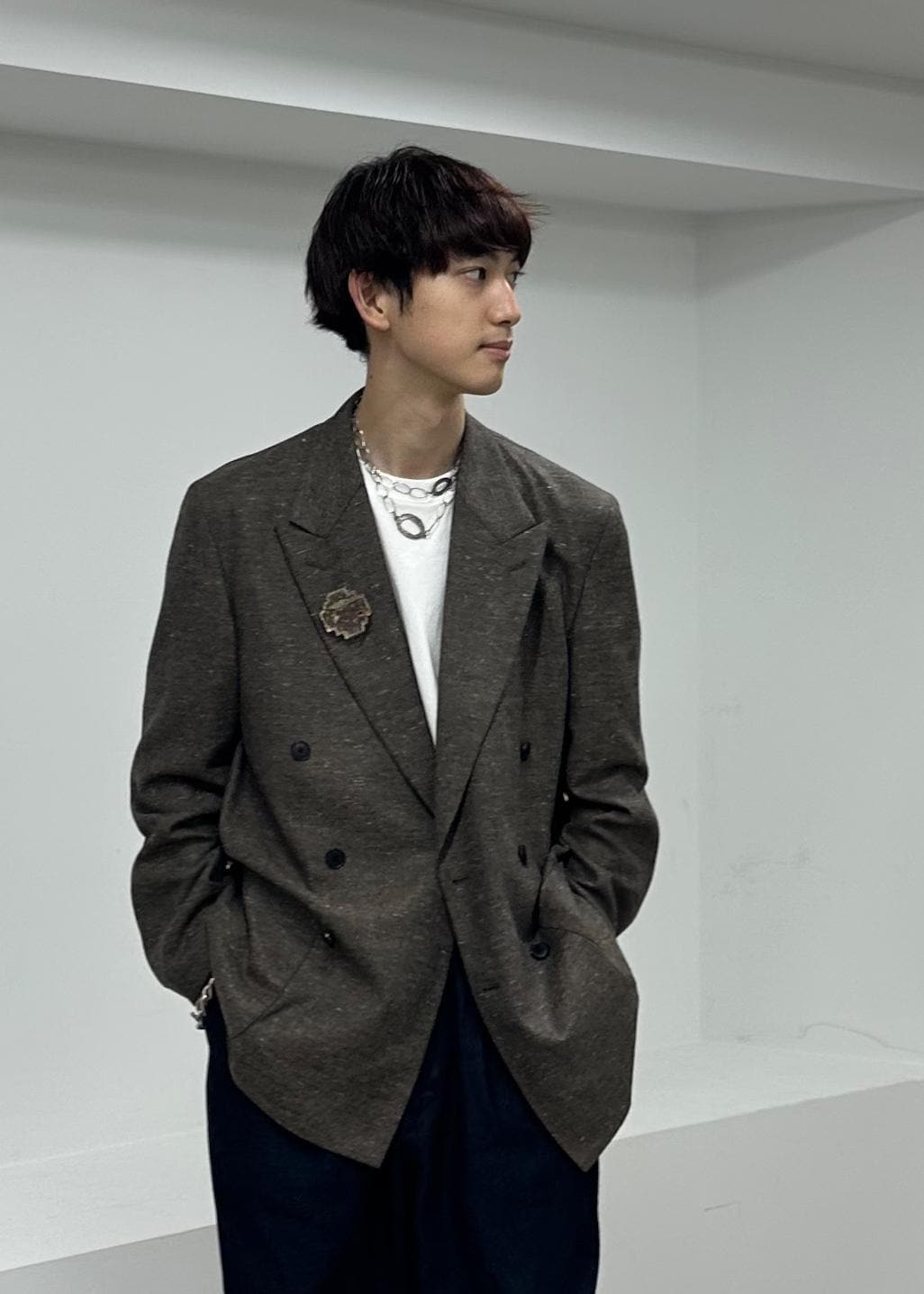 ボックスシルエット、ピークドラペル、ダブルブレストの形でとにかくかっこいいテーラードジャケットです。大きめなので私服使いしやすく、ちょっぴりカジュアルに寄っています。 -