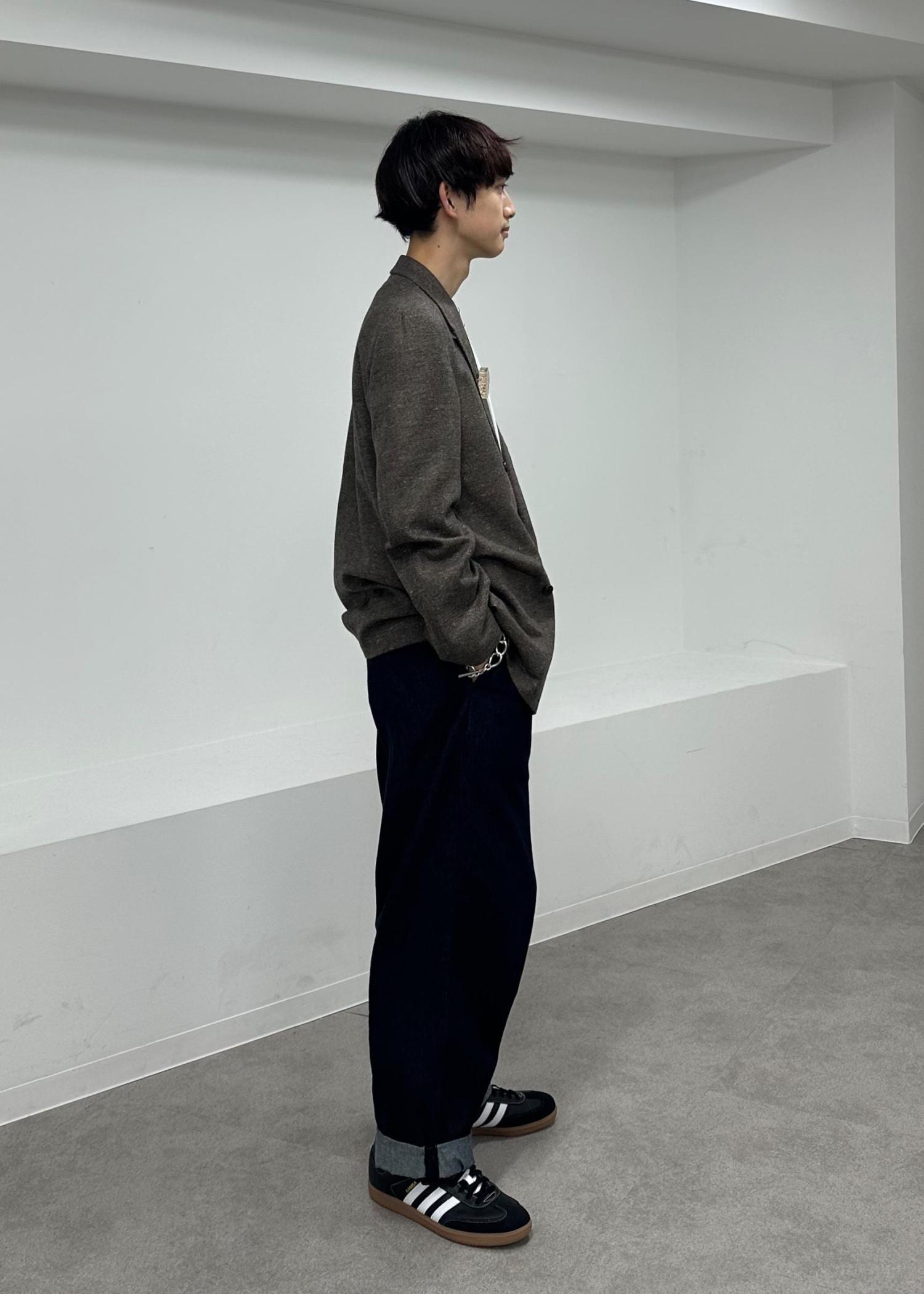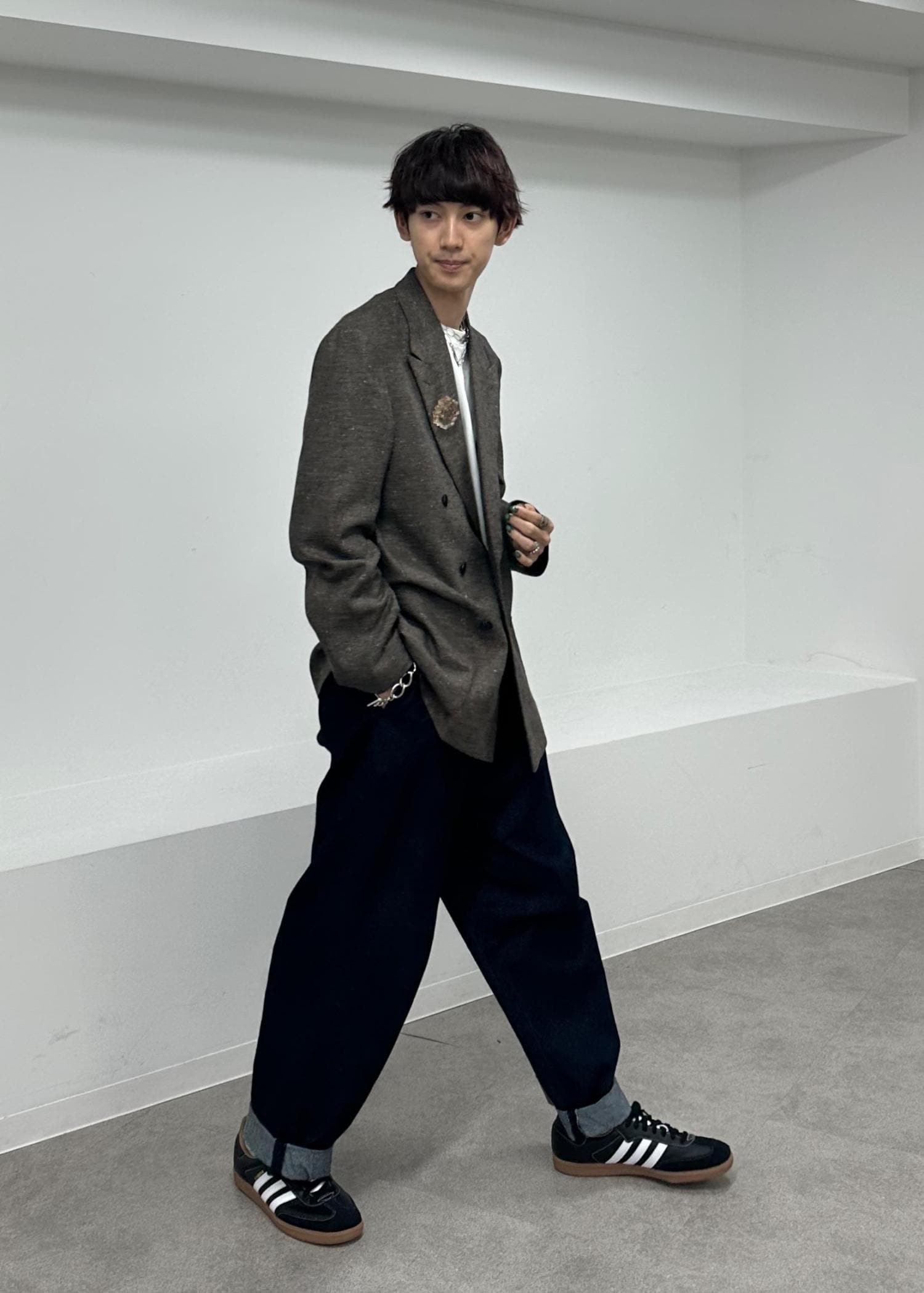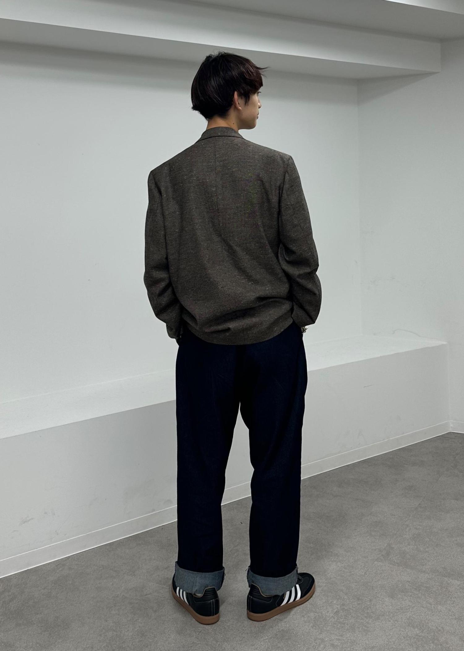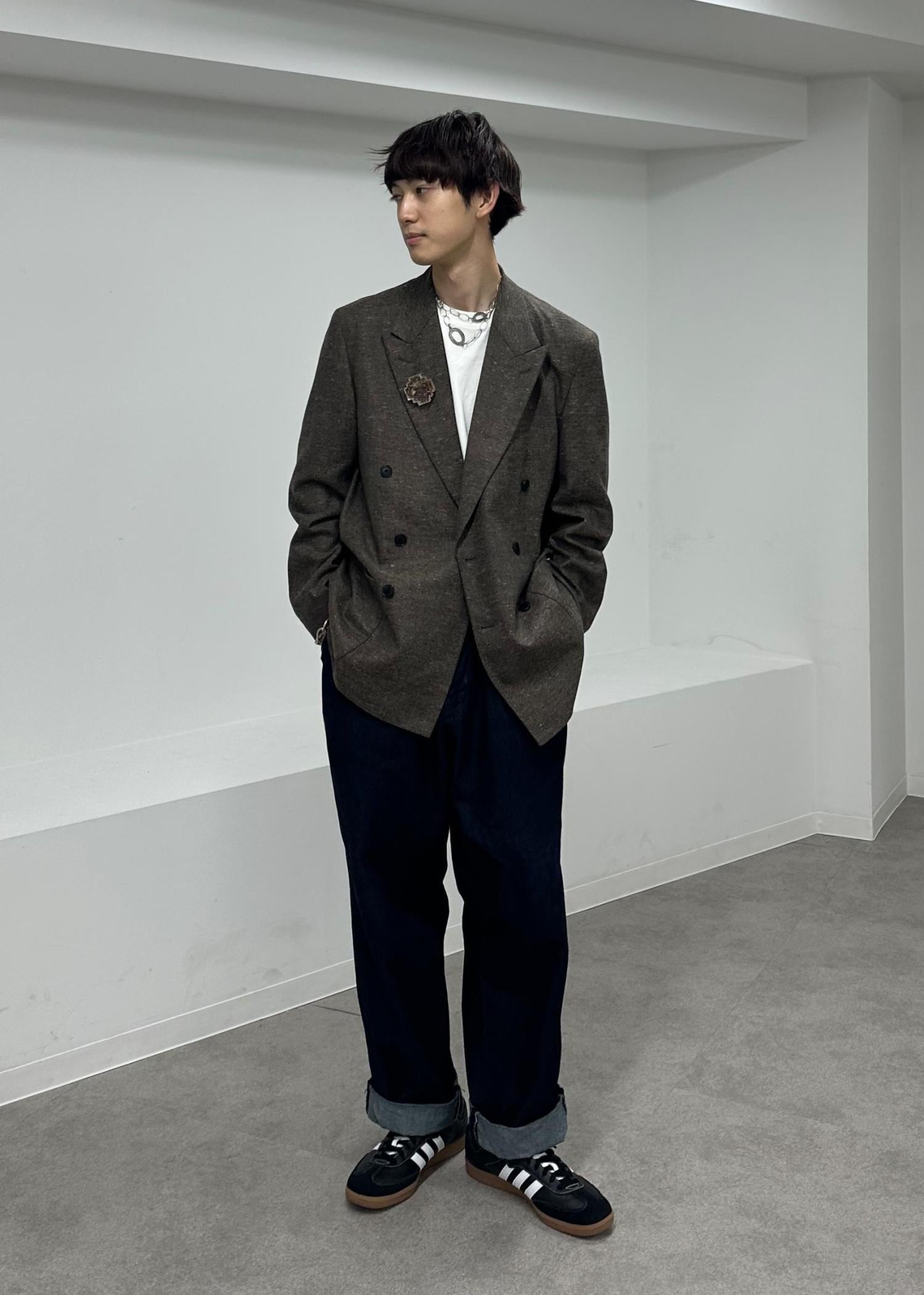 クラシカルでラフなカタチなテーラードジャケットにネイビーデニムを合わせたちょっぴりヨーロピアンな雰囲気のコーデ。足元をadidas Originalsのスニーカーでスポーティながらも上品に。インナーのTシャツの色も拾いつつで色のバランスをとりました。SAMBA OG ADAM ET ROPÉ、履きやすくて上品さもあり、スポーティすぎずでおすすめです。