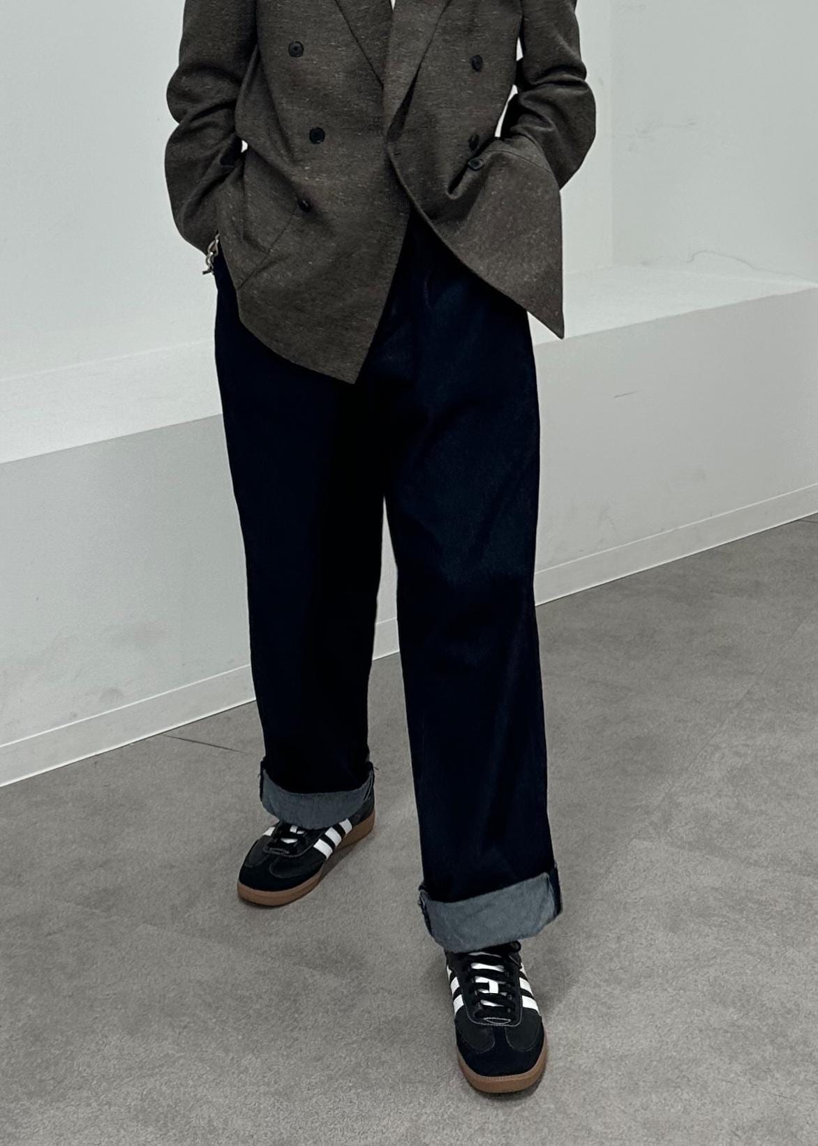 やや長めの丈感、センタープレスが入ったキレイなシルエットのパンツです。あえて大きく履いてロールアップしてもカッコいいです。ダークトーンでシックな印象。デニムというカジュアルな素材ながらもキレイで上品に感じます。腰元は紐がついていて、ゴムも入っているので履き心地も良いです。