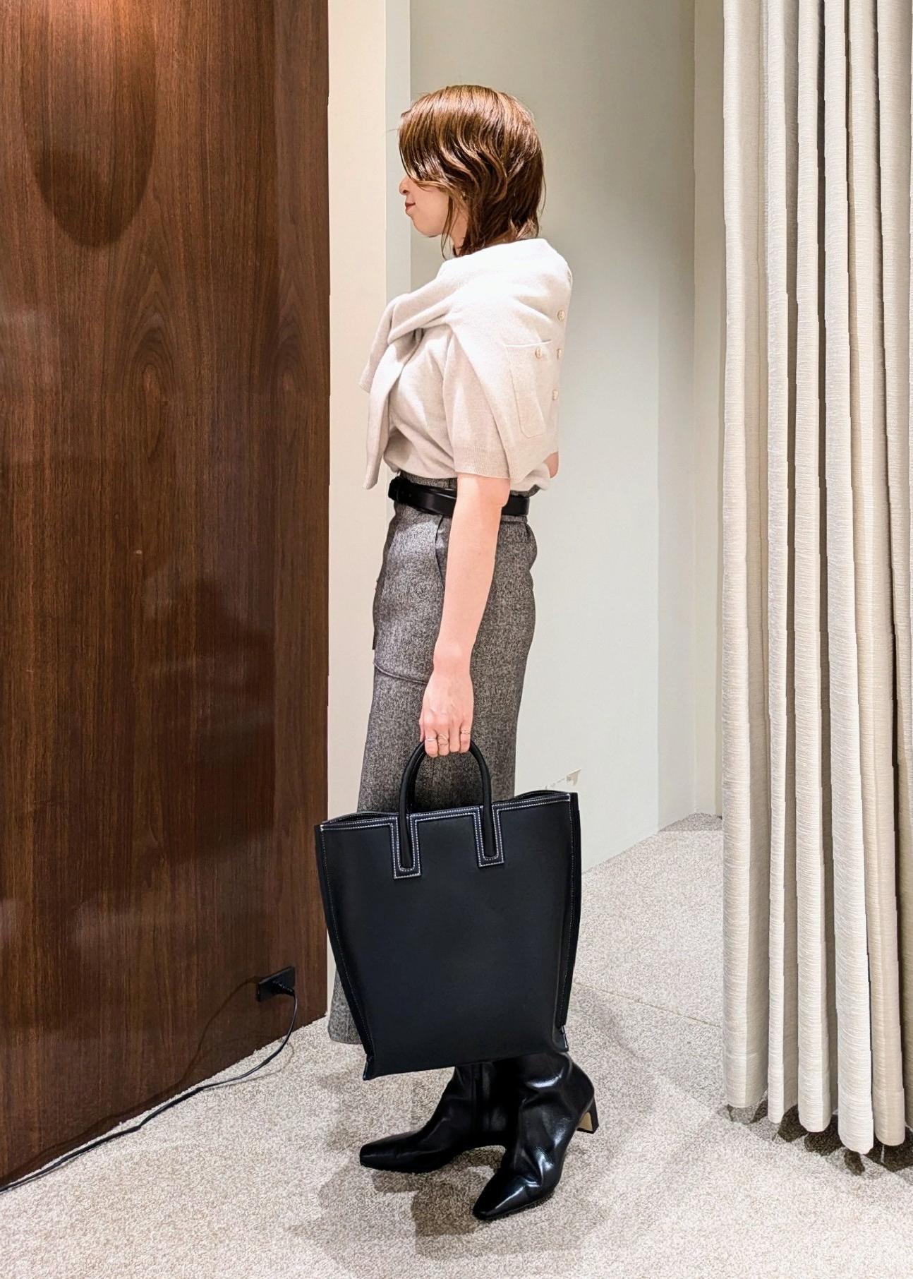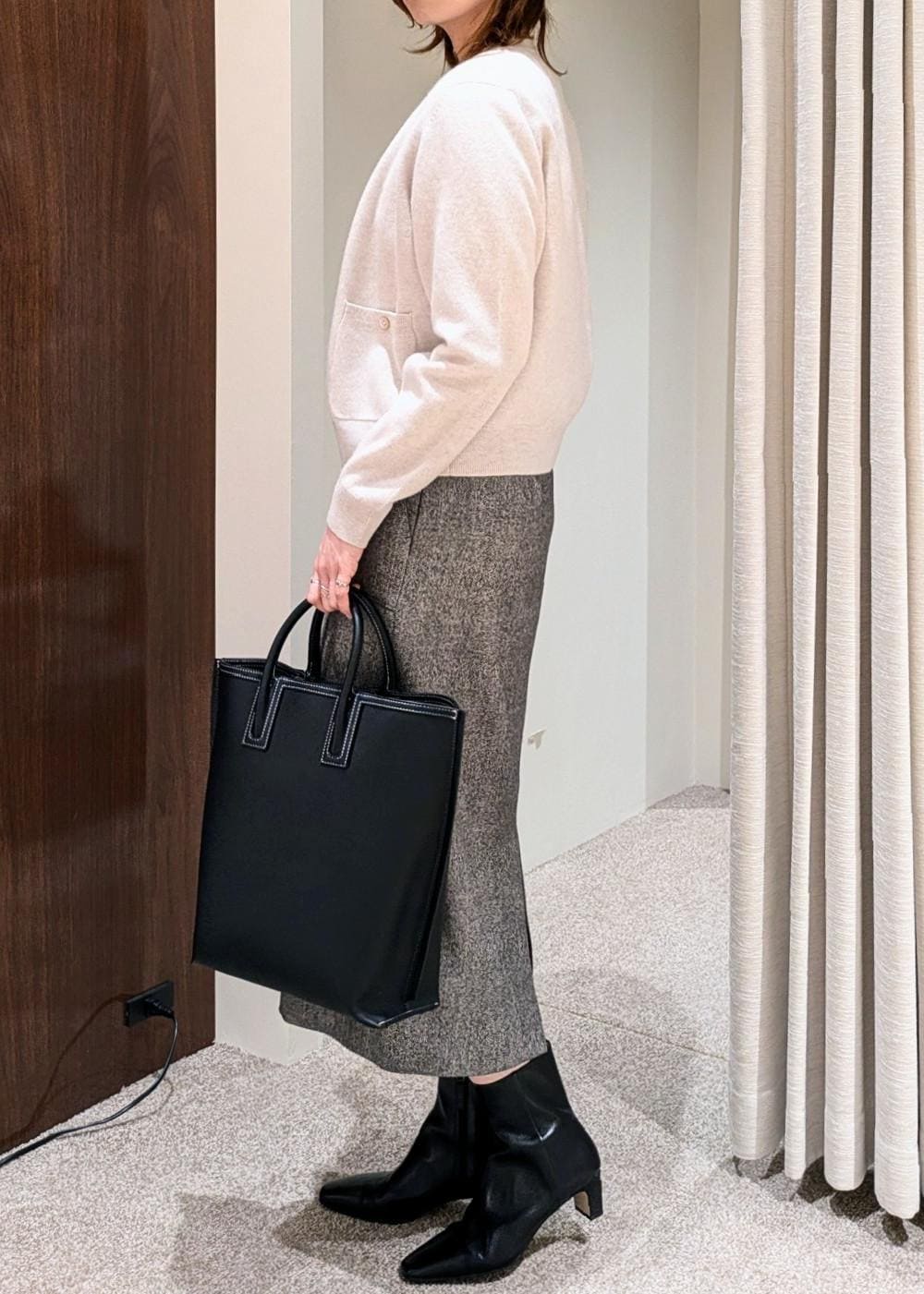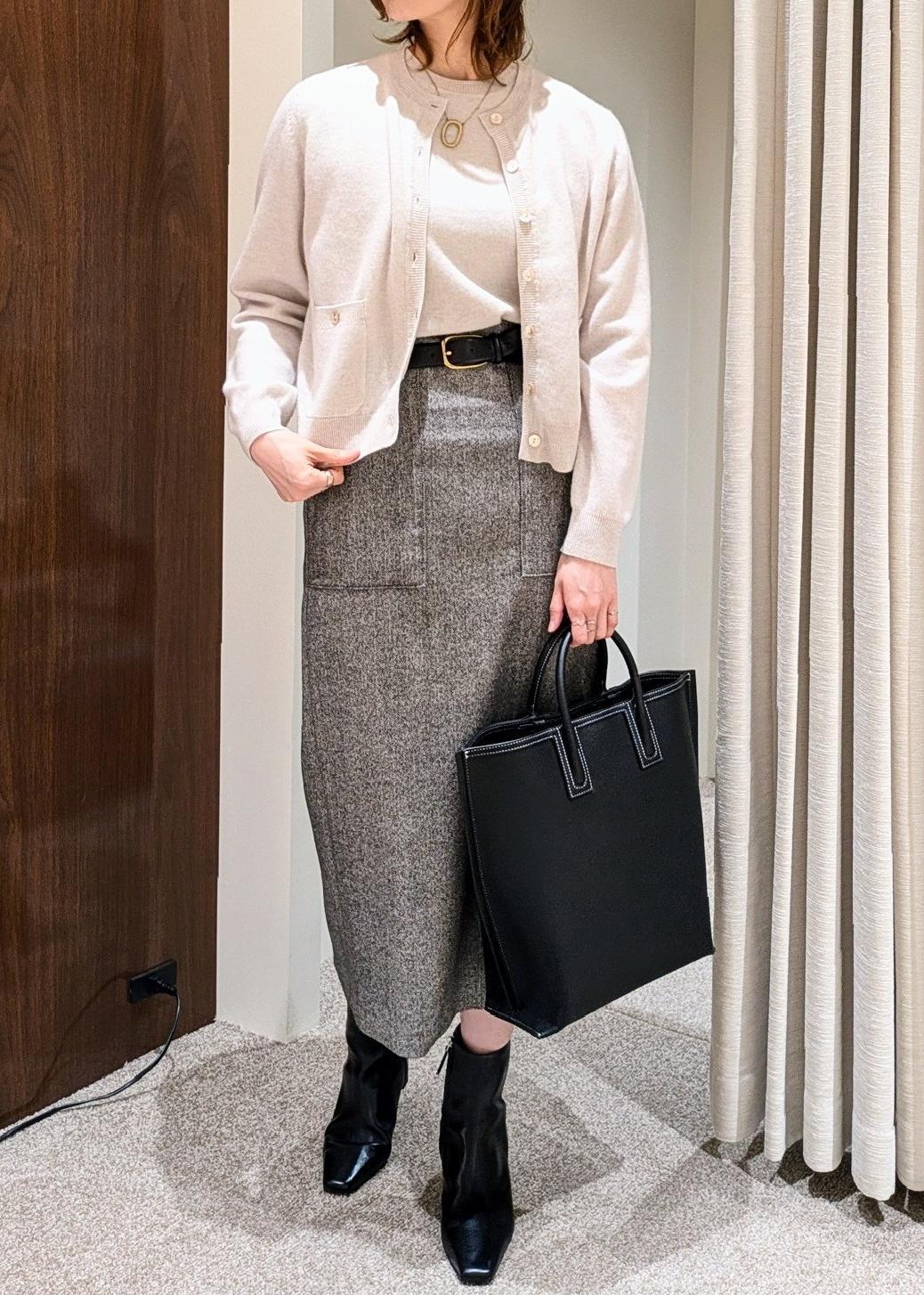 ヘリンボーン柄のタイトスカートと合わせて、秋のオフィスカジュアルスタイルにしました。