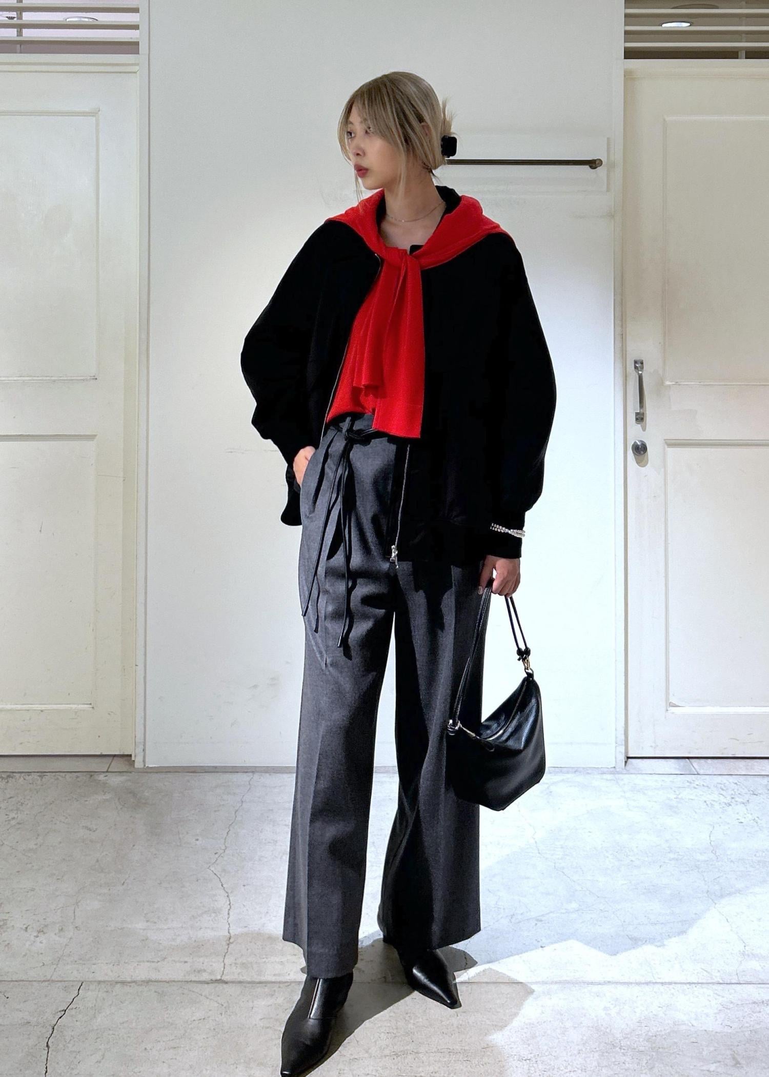 差し色に赤のカーディガンをレイヤードすることで、大人の遊び心あるコーディネートに仕上げてみました。