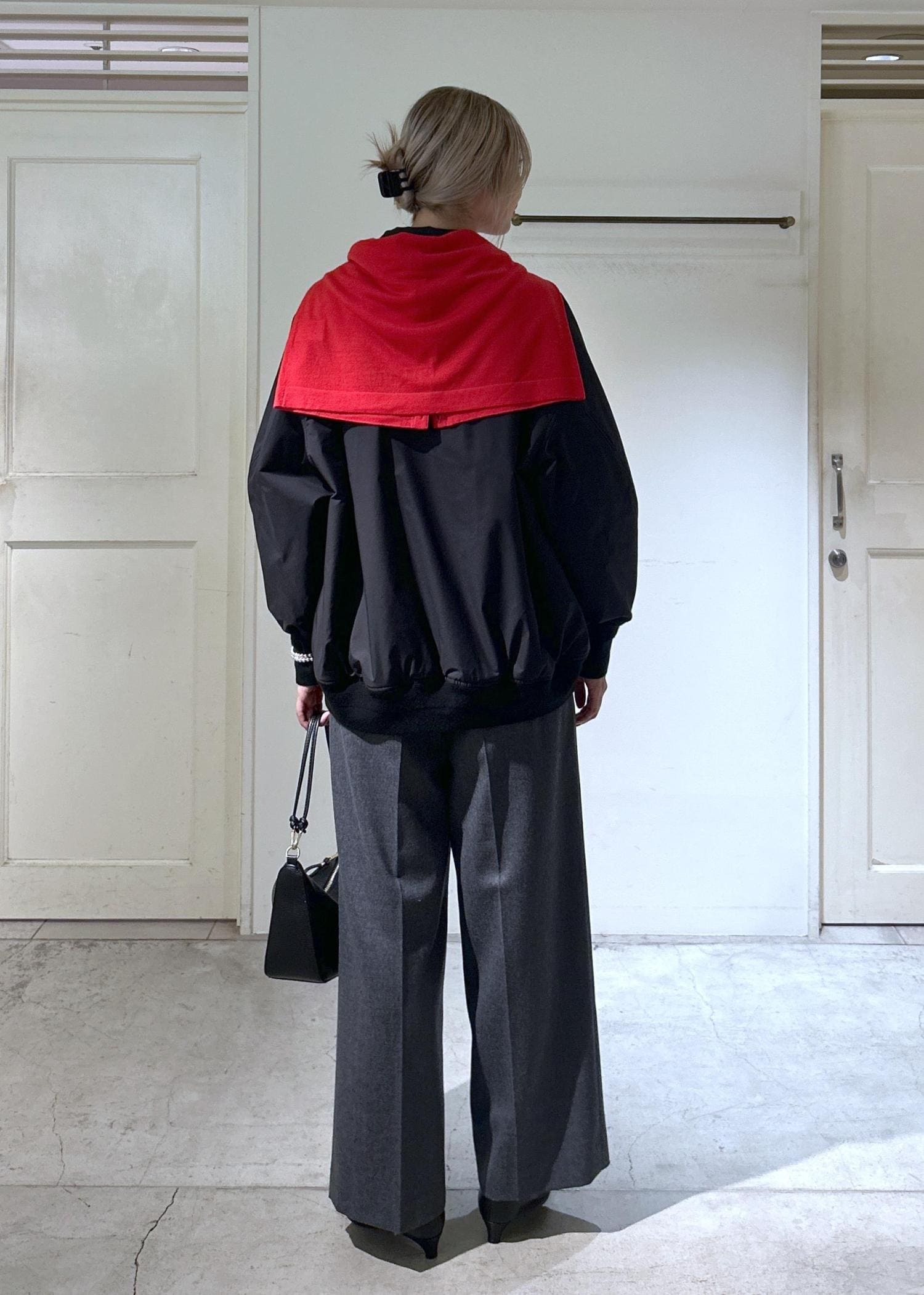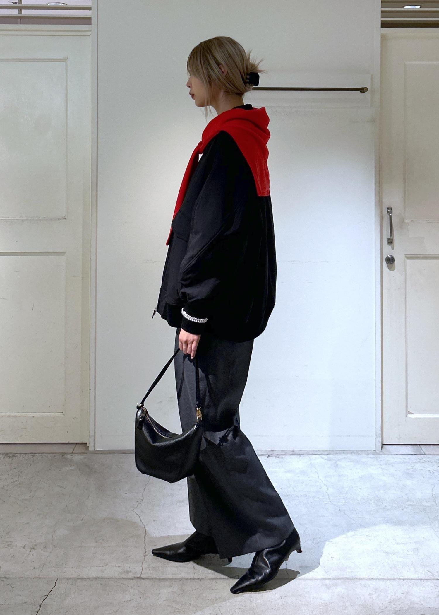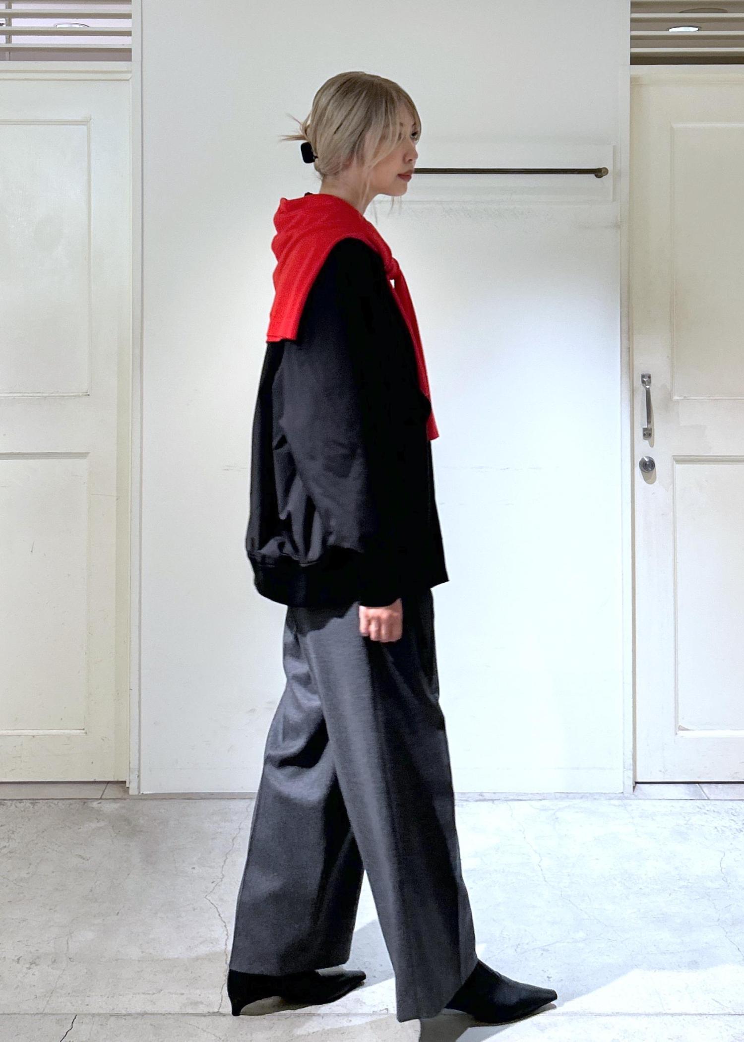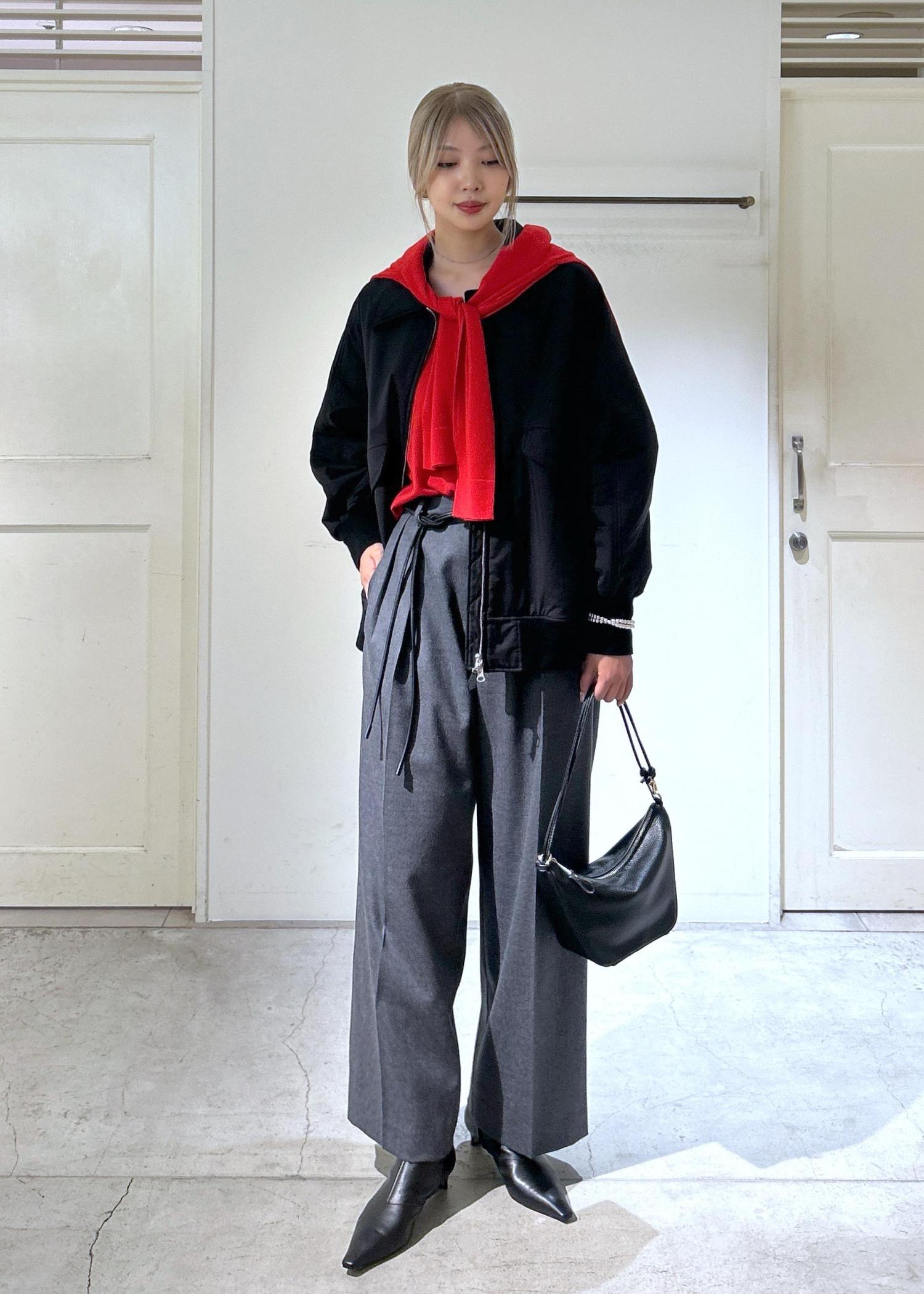 全体的に落ち着いた色味でまとめ、スラックスやポインテッドトゥのブーツを合わせることでシックな綺麗目スタイルになるよう意識しました。