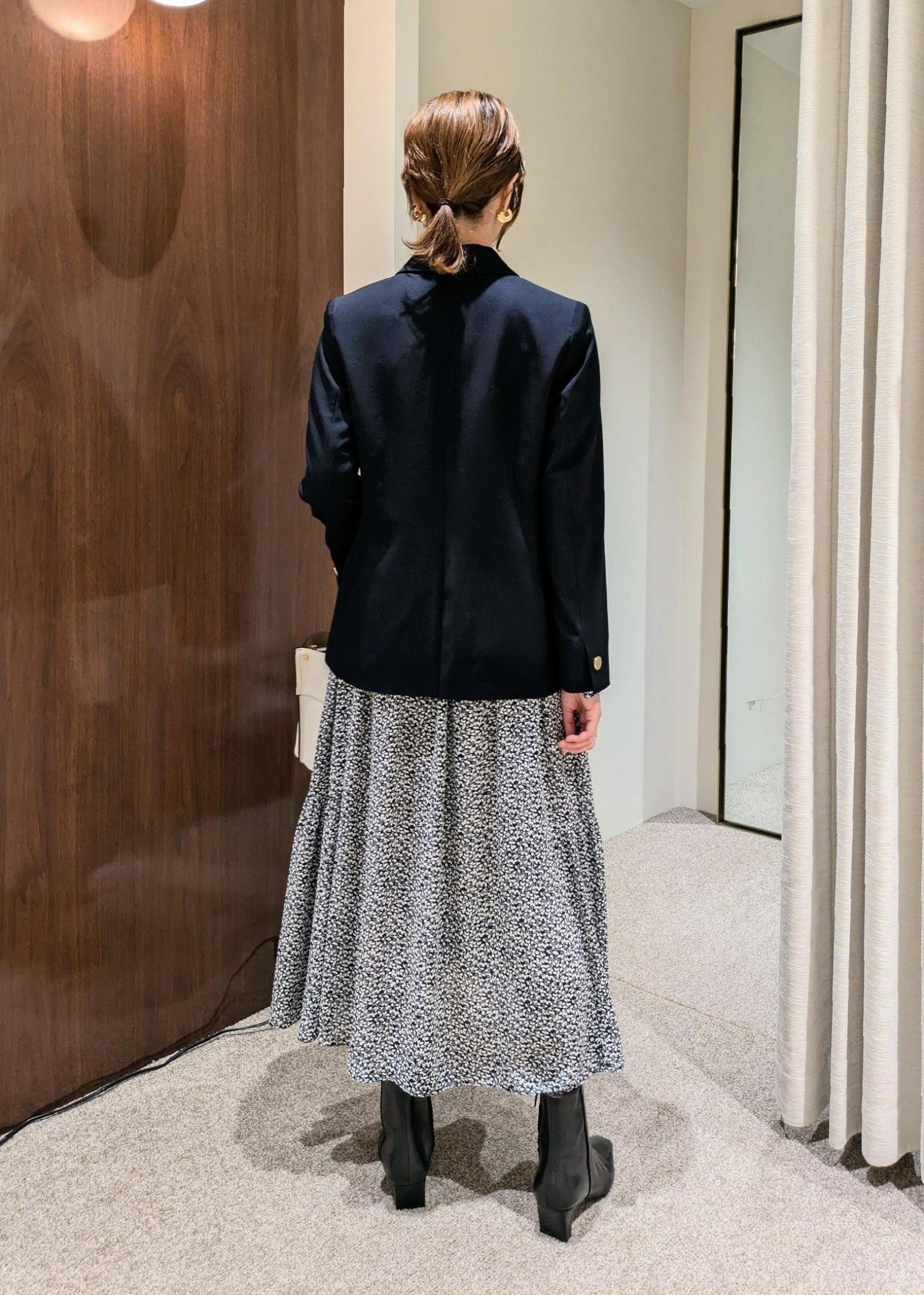 腕まわりは細身で、ウエストが程よくシェイプされたボクシーシルエットです。