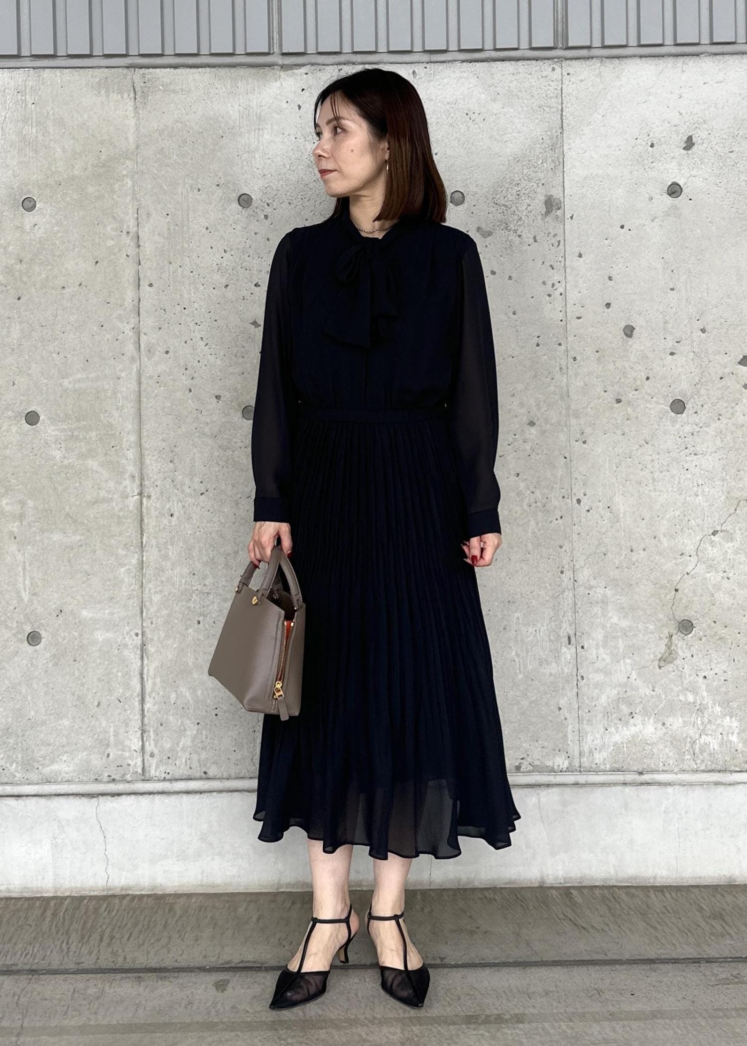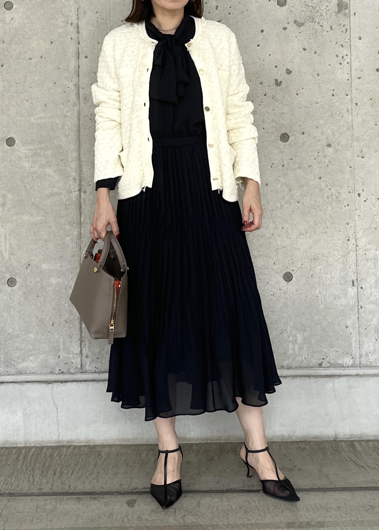 ROPÉジョーゼットシフォンプリーツワンピース・25AWネイビー / 36¥49,500レビュー身長156cm、36サイズ着用。