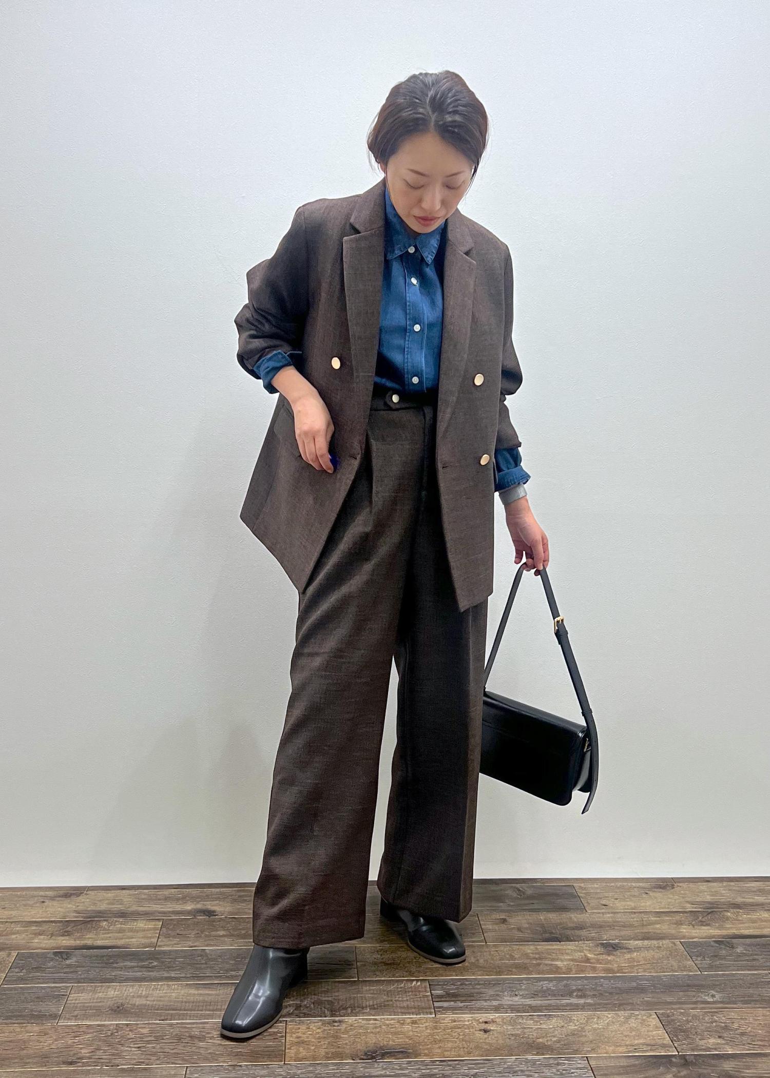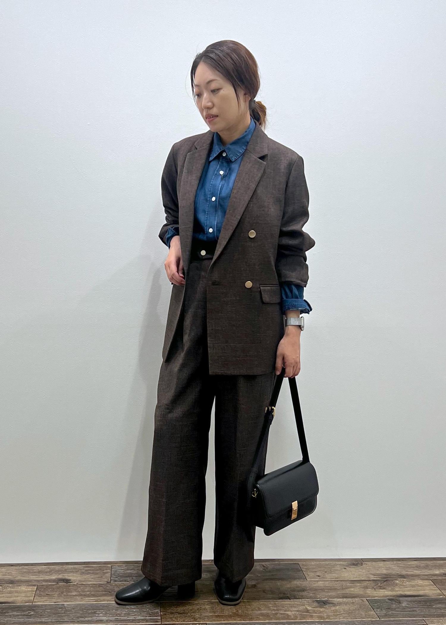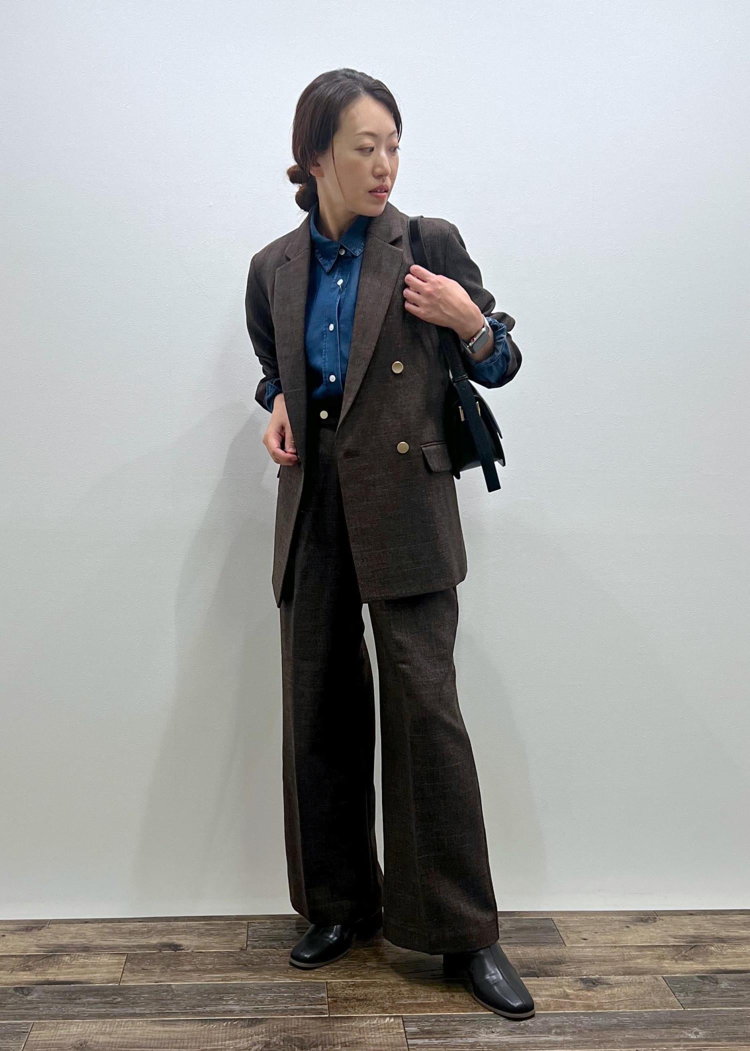 今回はツイードのジャケットにデニムのシャツを合わせたメンズライクなスタイリングで組んでみました。