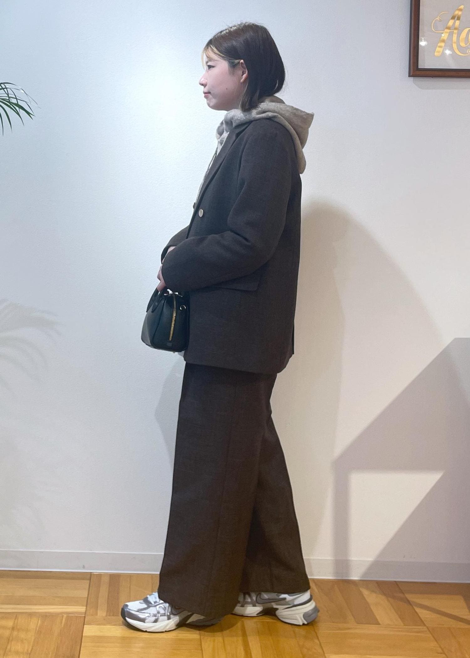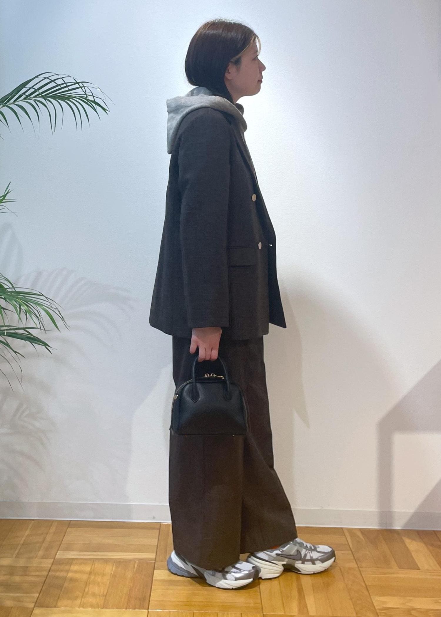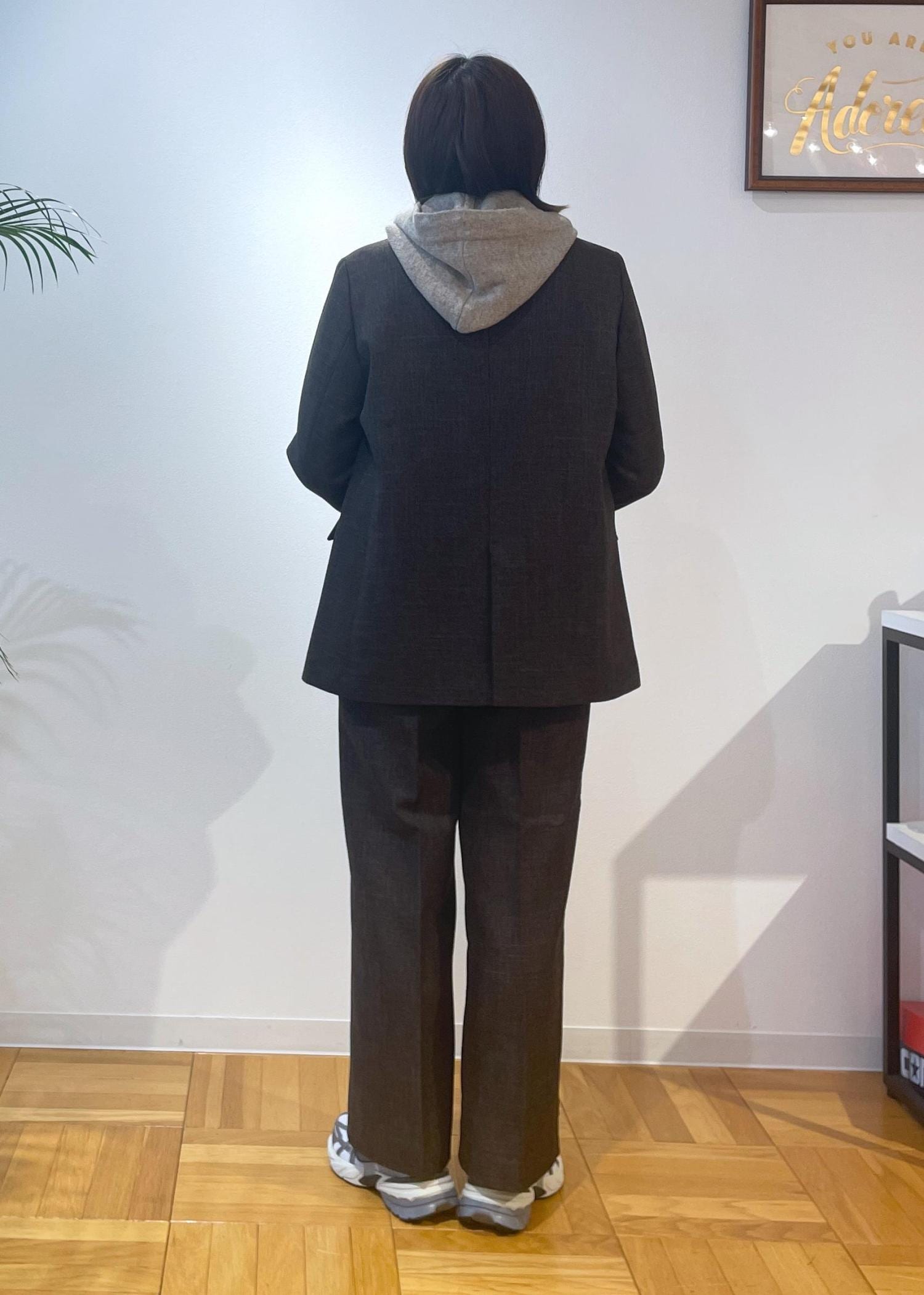 今回は、オンオフで使えるセットアップにフード付きニットを合わせたオフスタイルコーデです♩