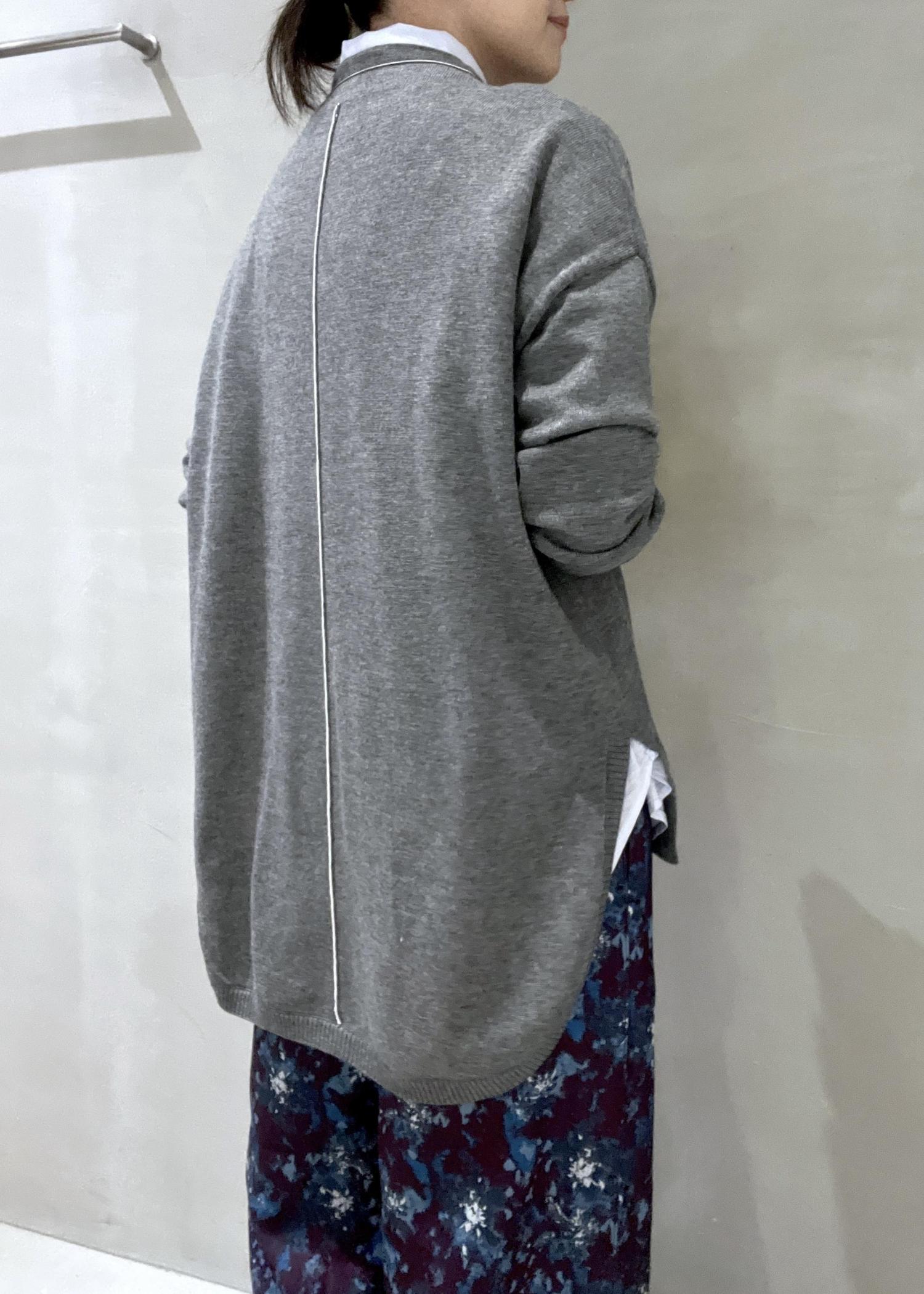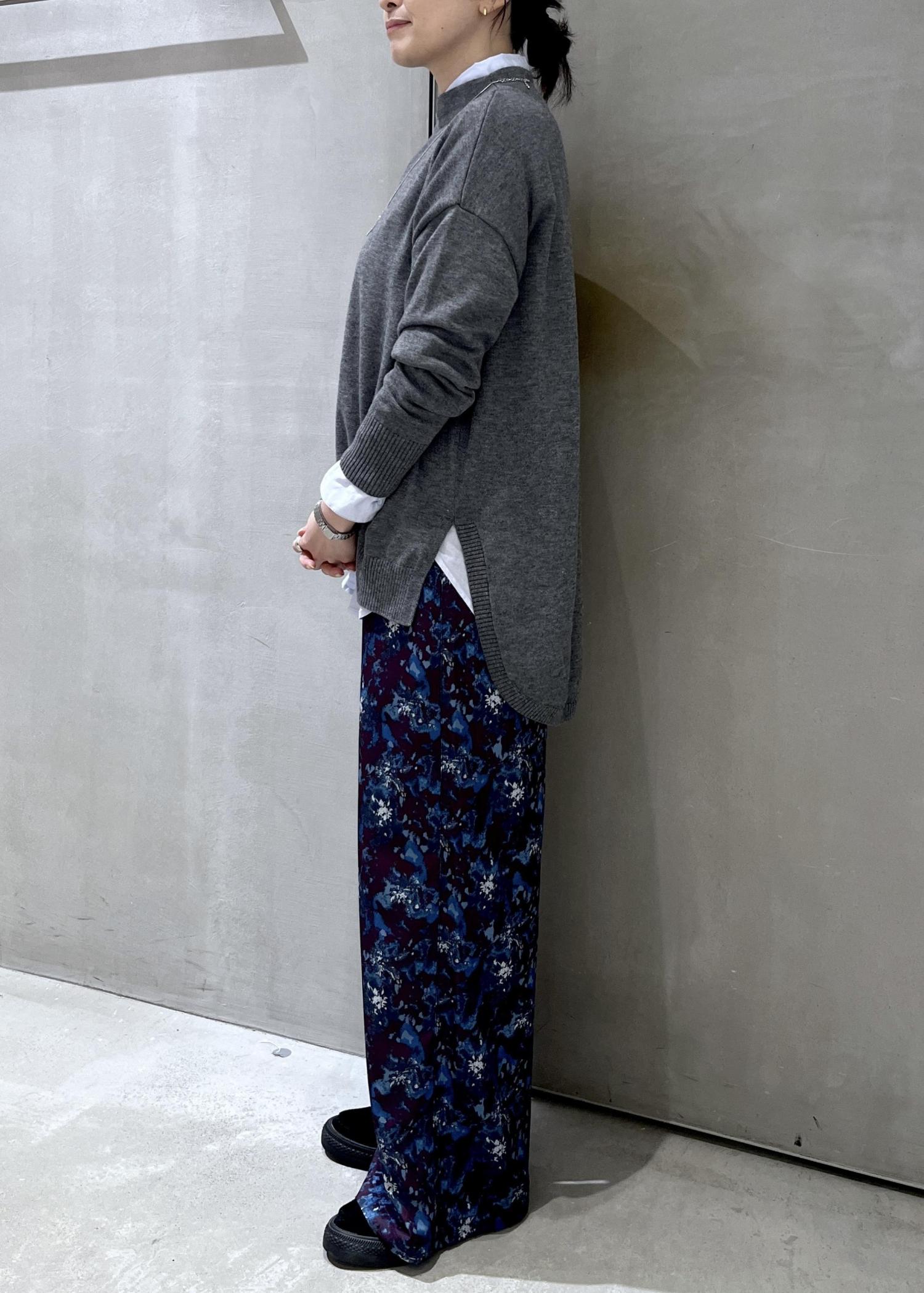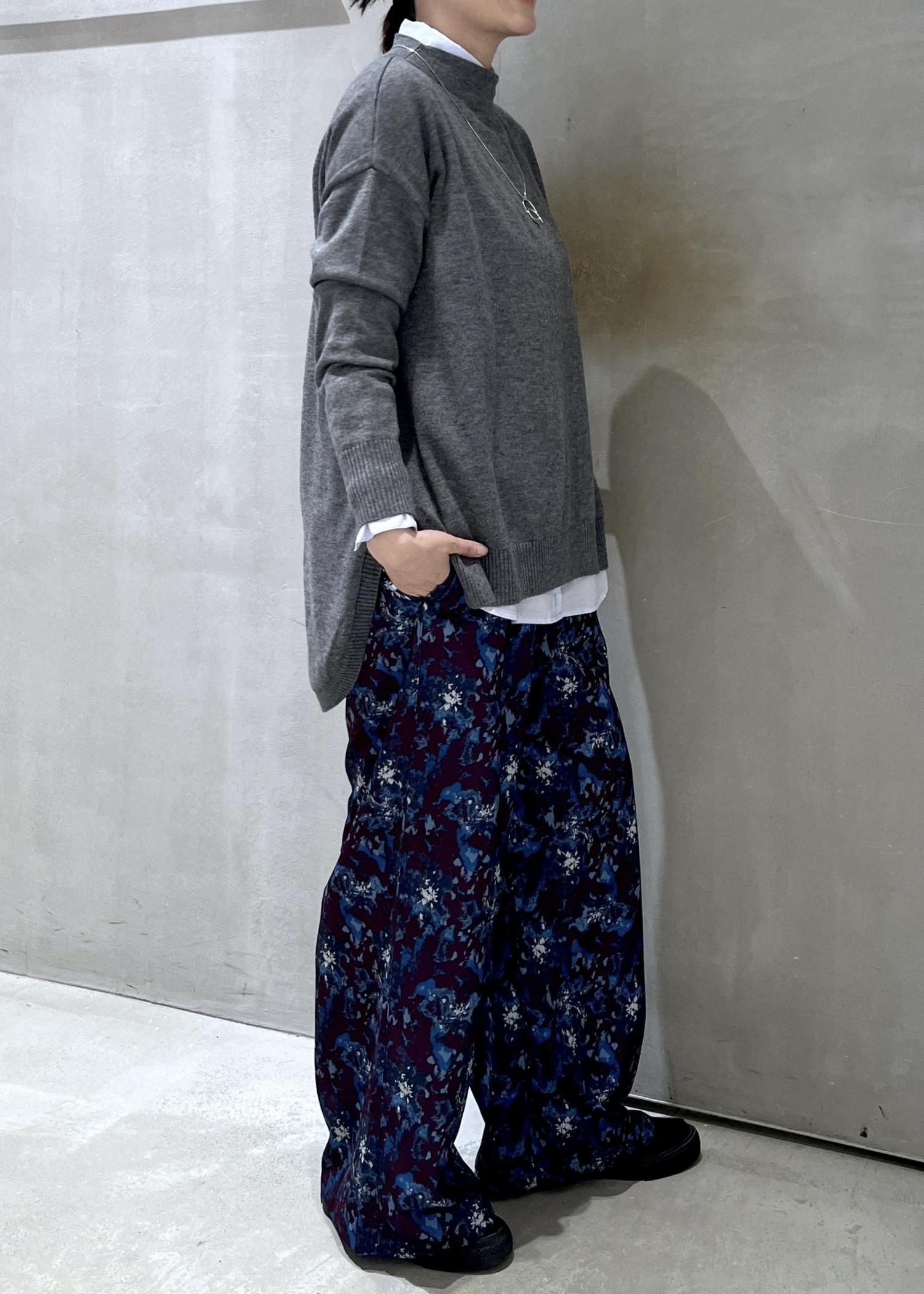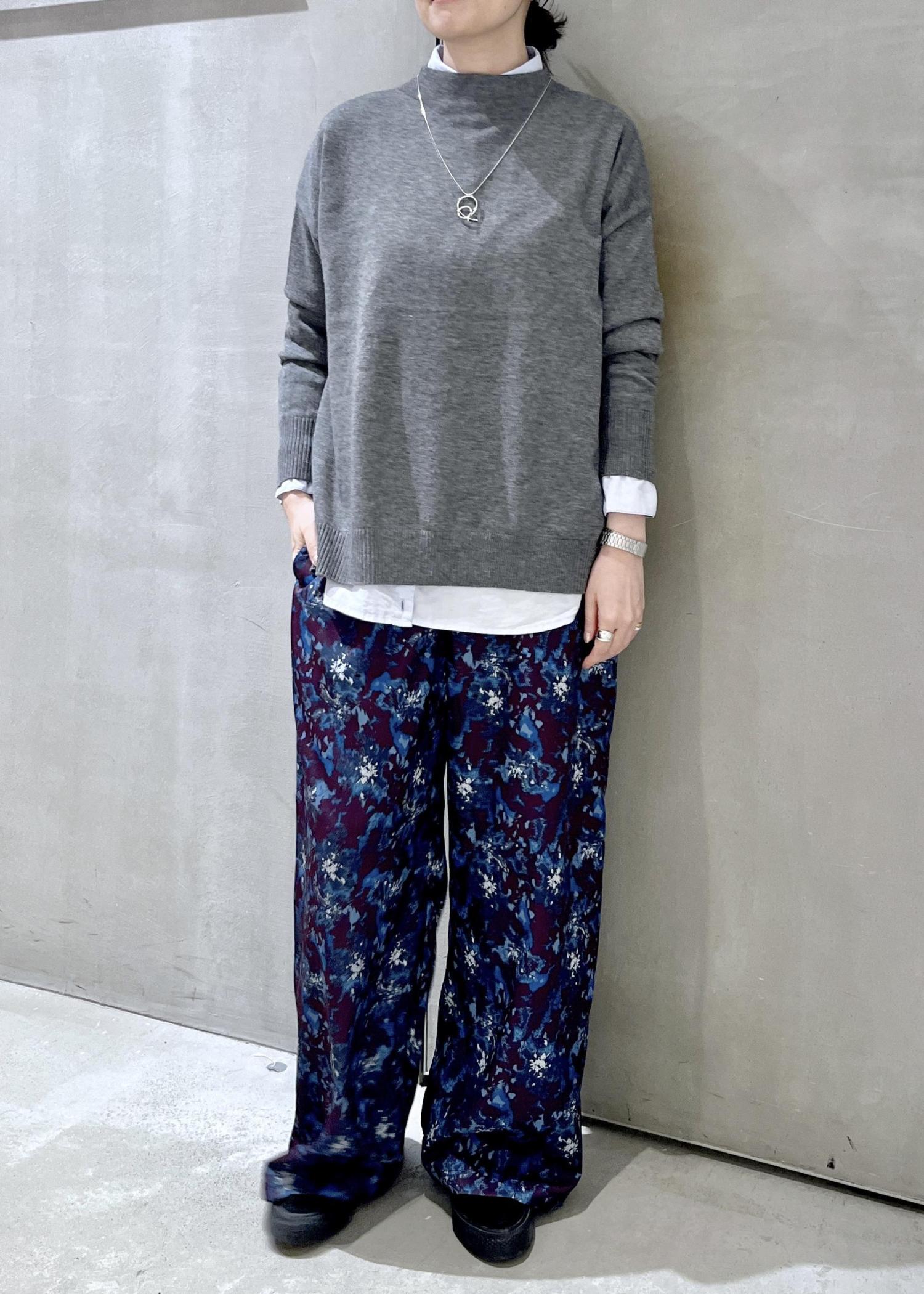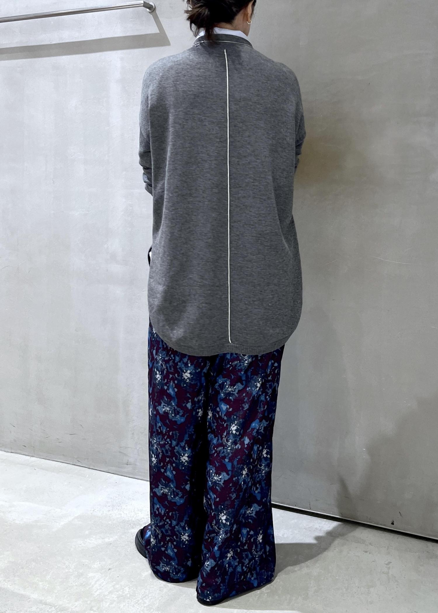 同素材のカーディガンもあるので、アンサンブルでの着用も今っぽくてオススメですが、今回は柄パンツをシックに大人っぽい印象になるようコーディネートしました。