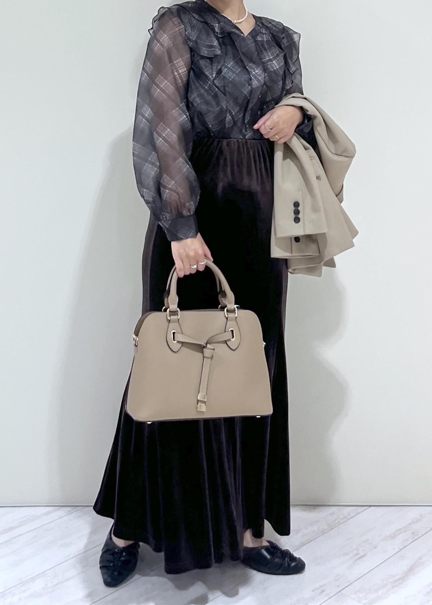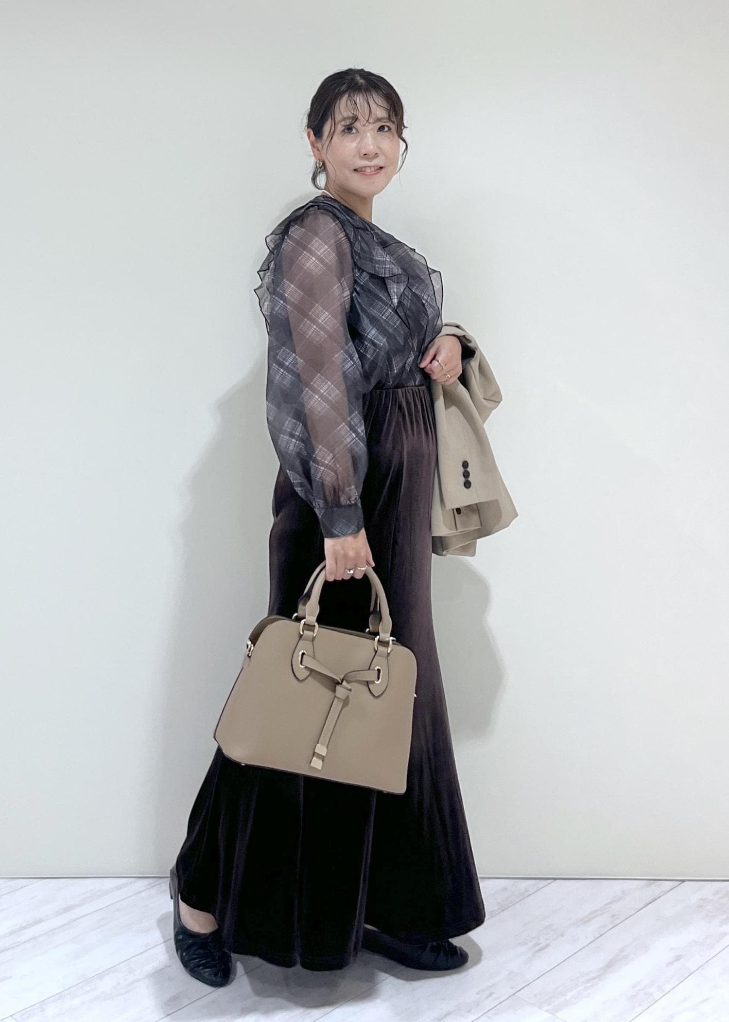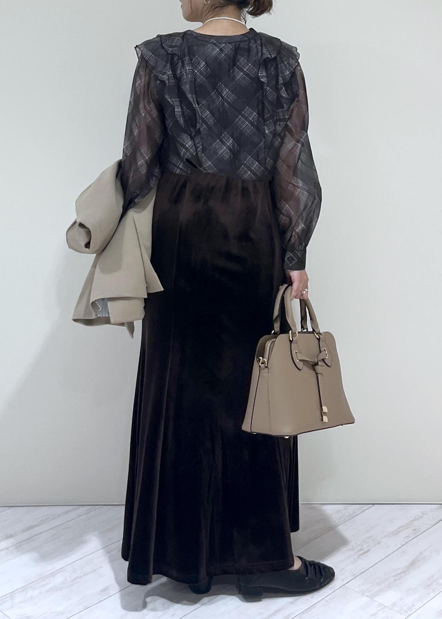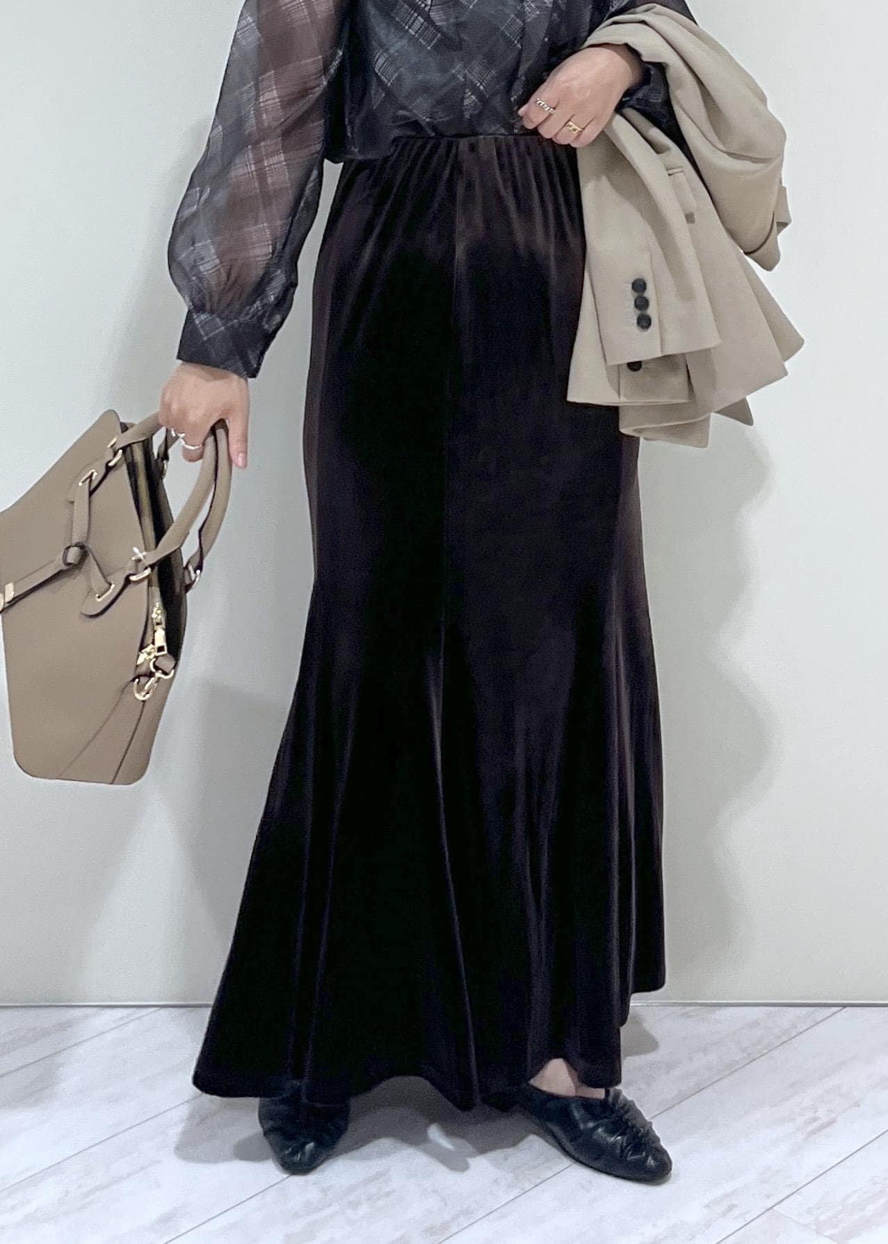 少しキレイめにベロアのスカートと合わせてきちんと感もプラスしました。