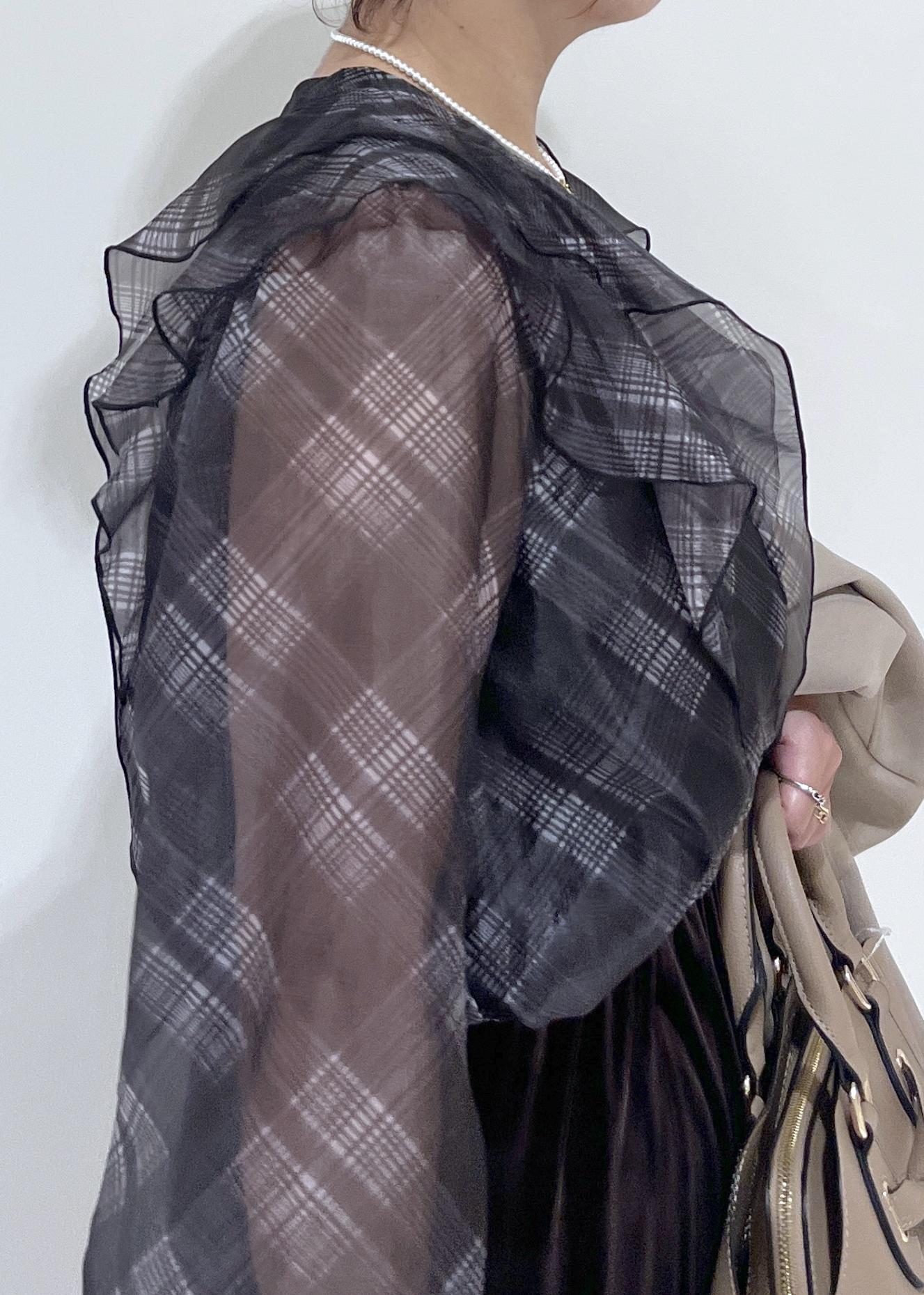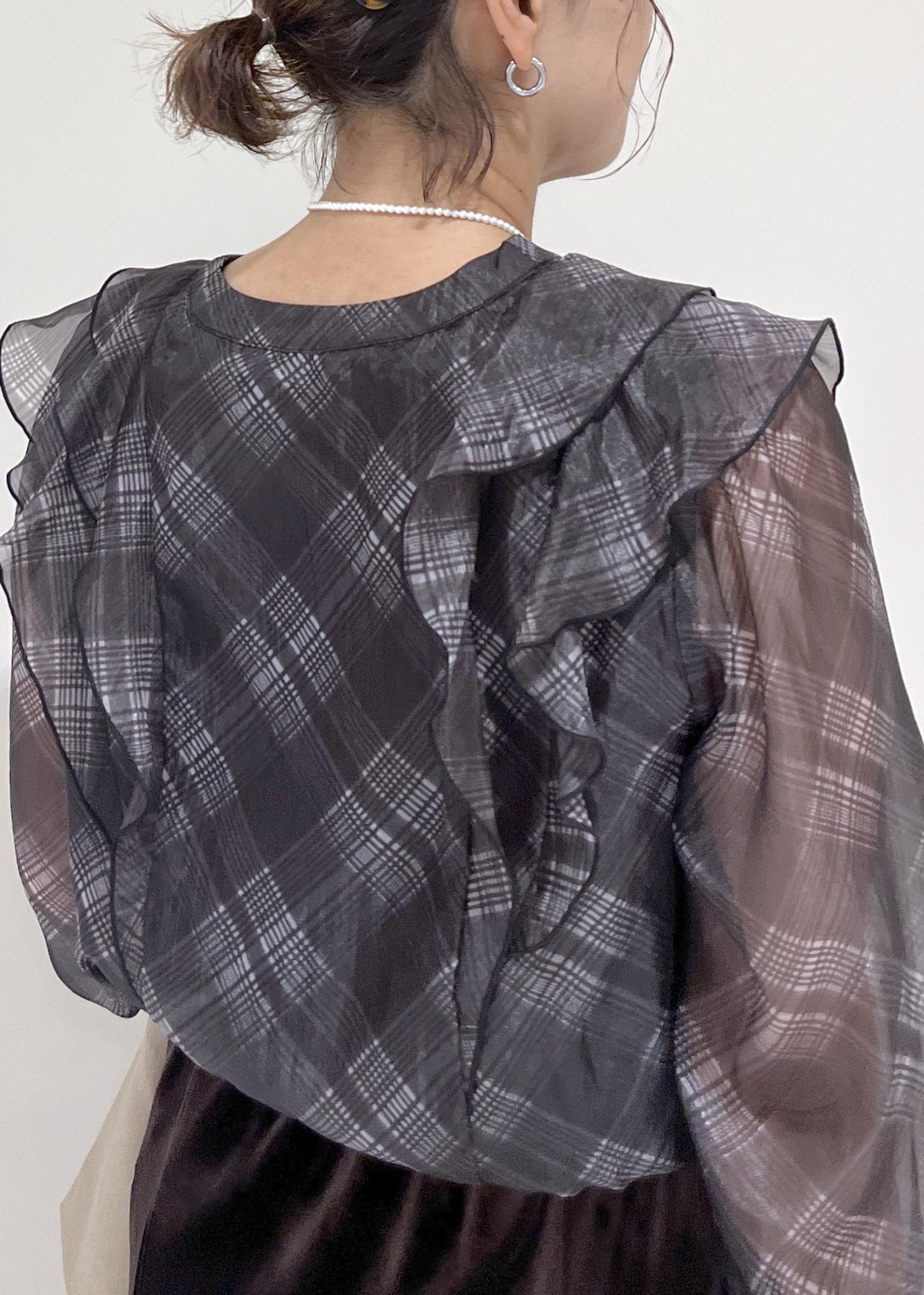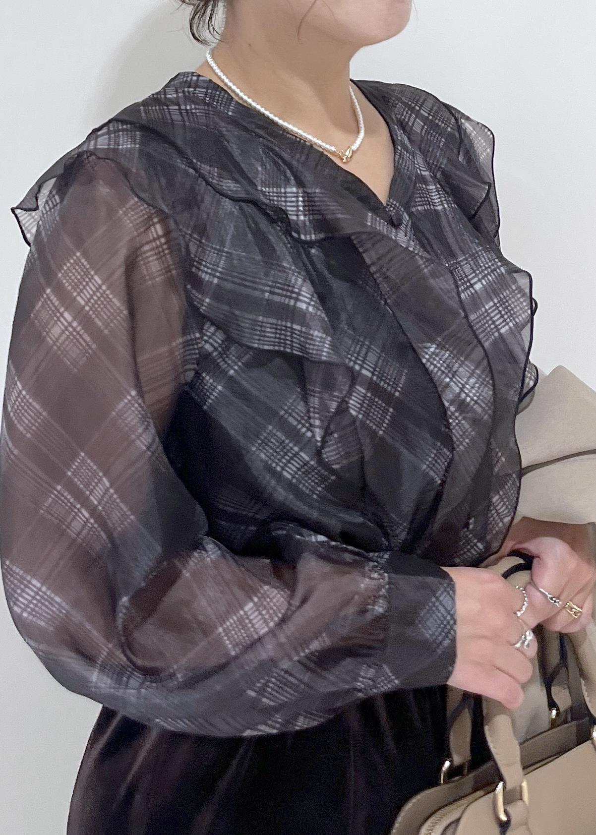 落ち着いたブラックのチェックブラウスですが、シアー素材なので暗い印象にならずに大人でも◎