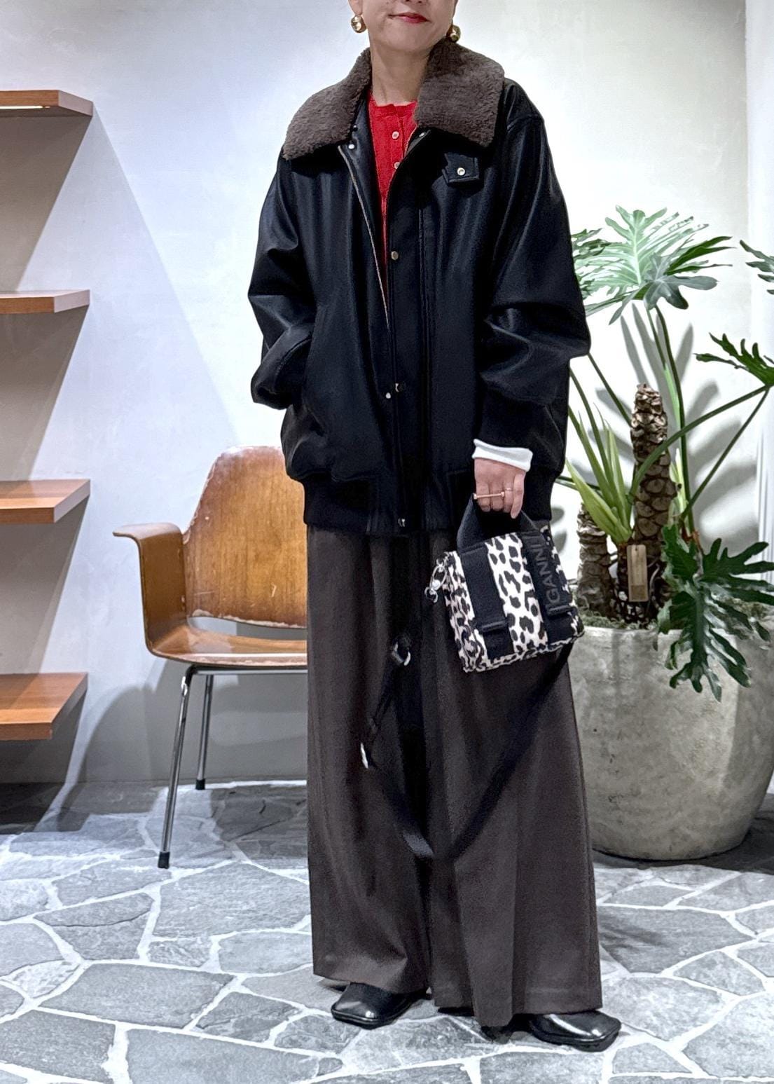 全体的にトーンダウンしてしまうので、トップスに赤を差し色に使っています!