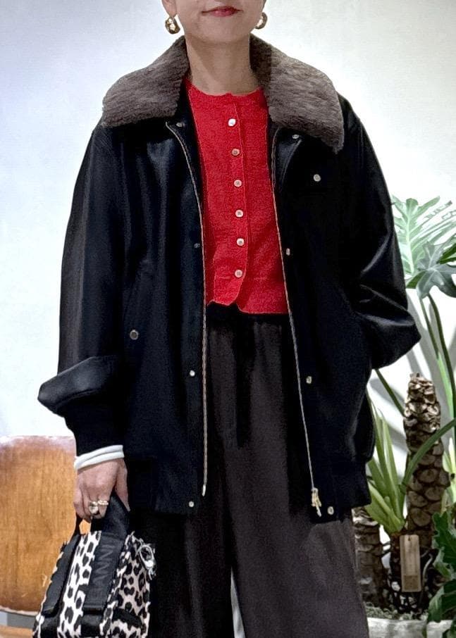 ADAM ET ROPÉ FEMMEシンセティックレザーフライトジャケットブラック / F¥39,600レビュー丸みのあるシルエットでインナーに肉厚なものやインナーダウンをレイヤード出来るので、真冬も使えます。スッキリ見えするので、ボトムにワイドパンツやフレアスカートを合わせても◎。