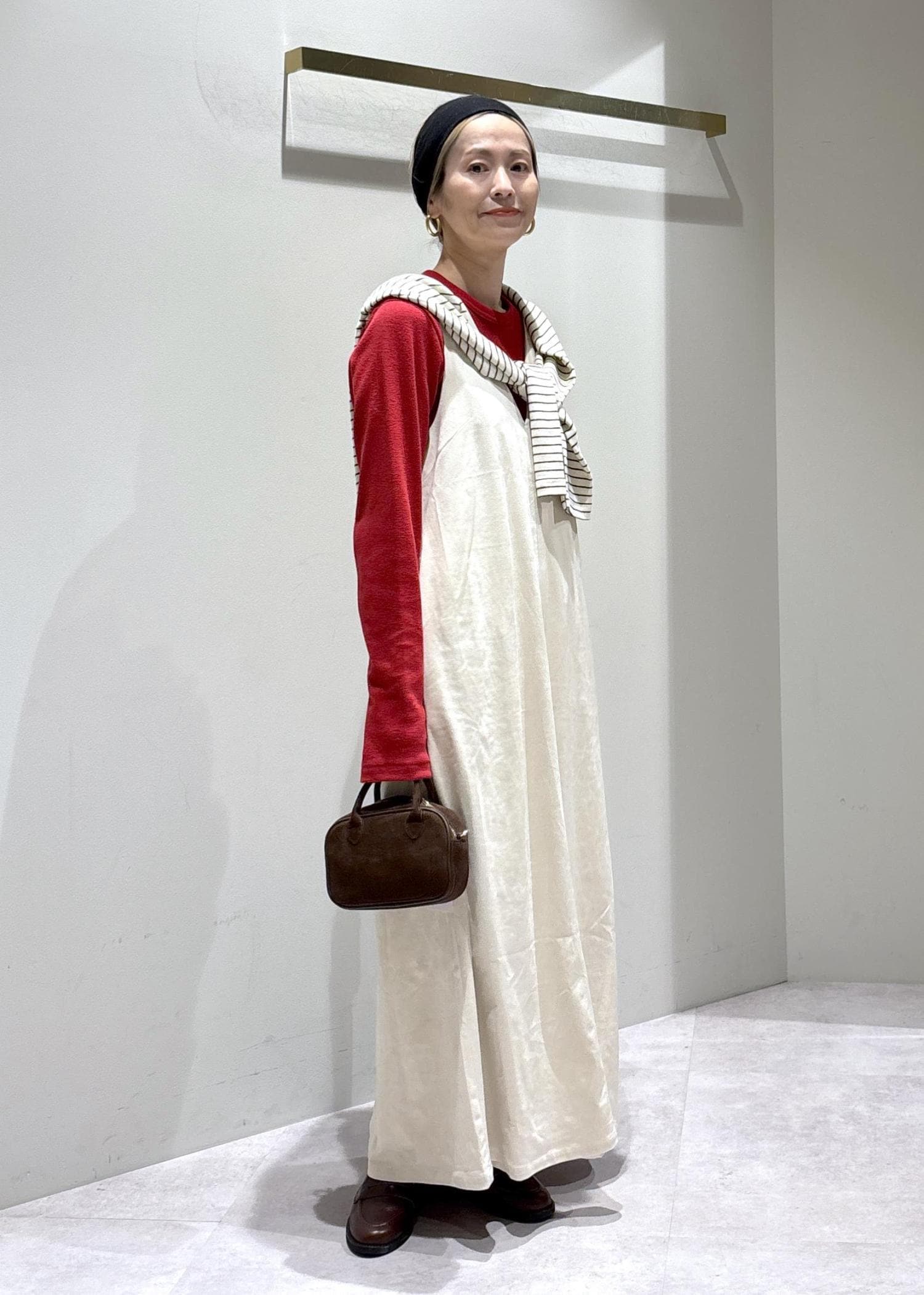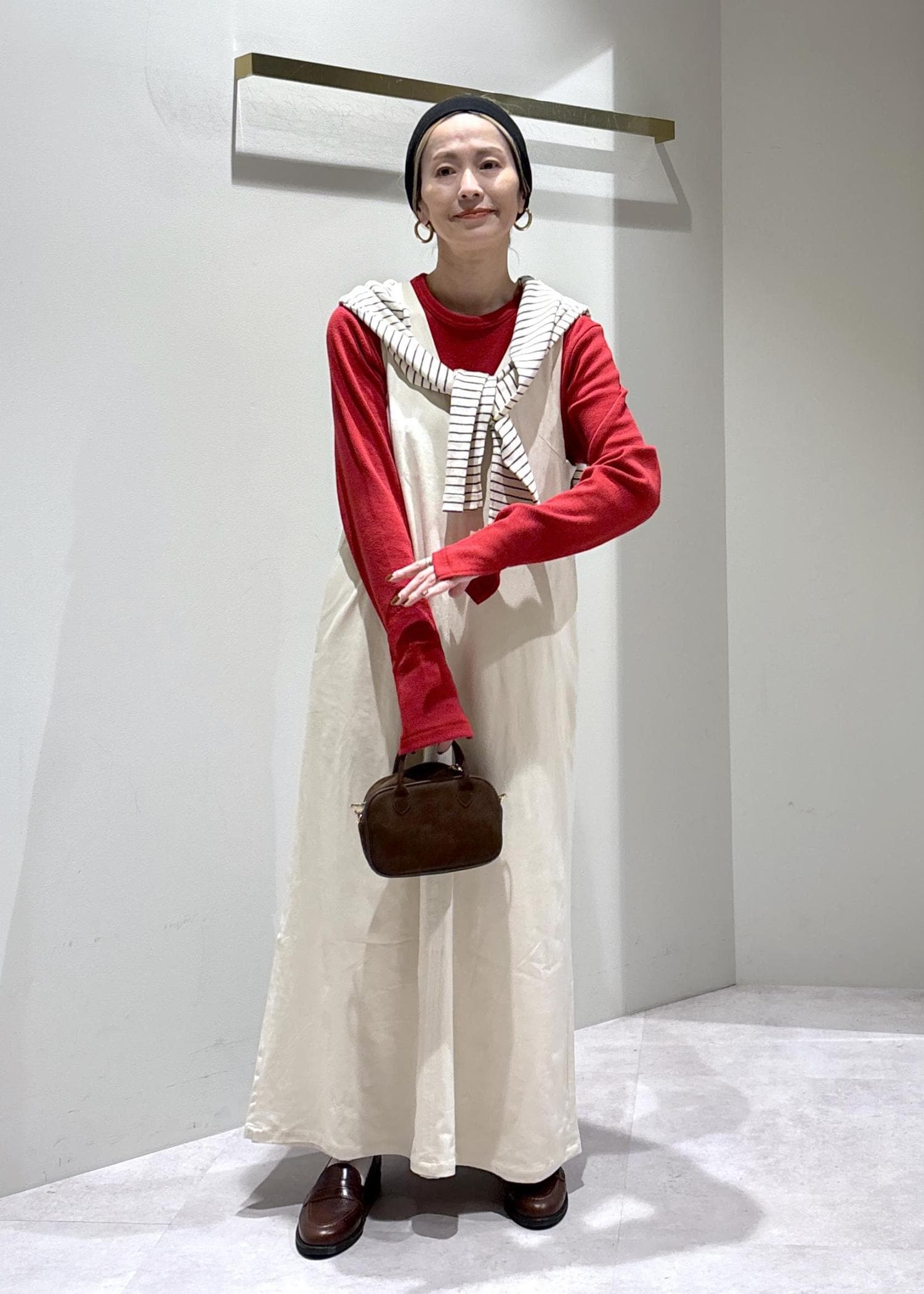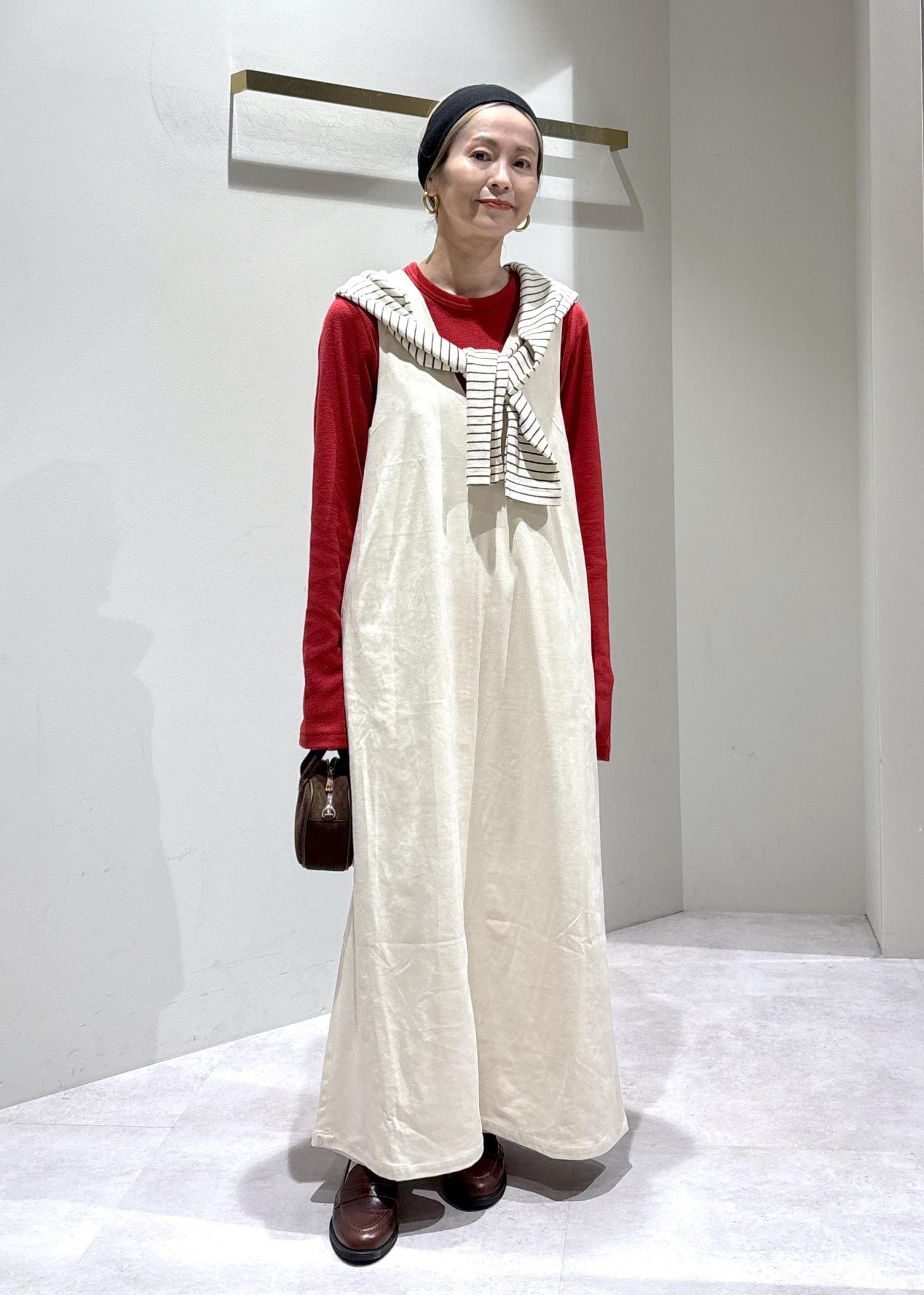 やさしい生成りカラーのワンピースに赤を差して秋のムードに。ゆるっとしたシルエットで、力の抜けた大人カジュアルにしてみました。