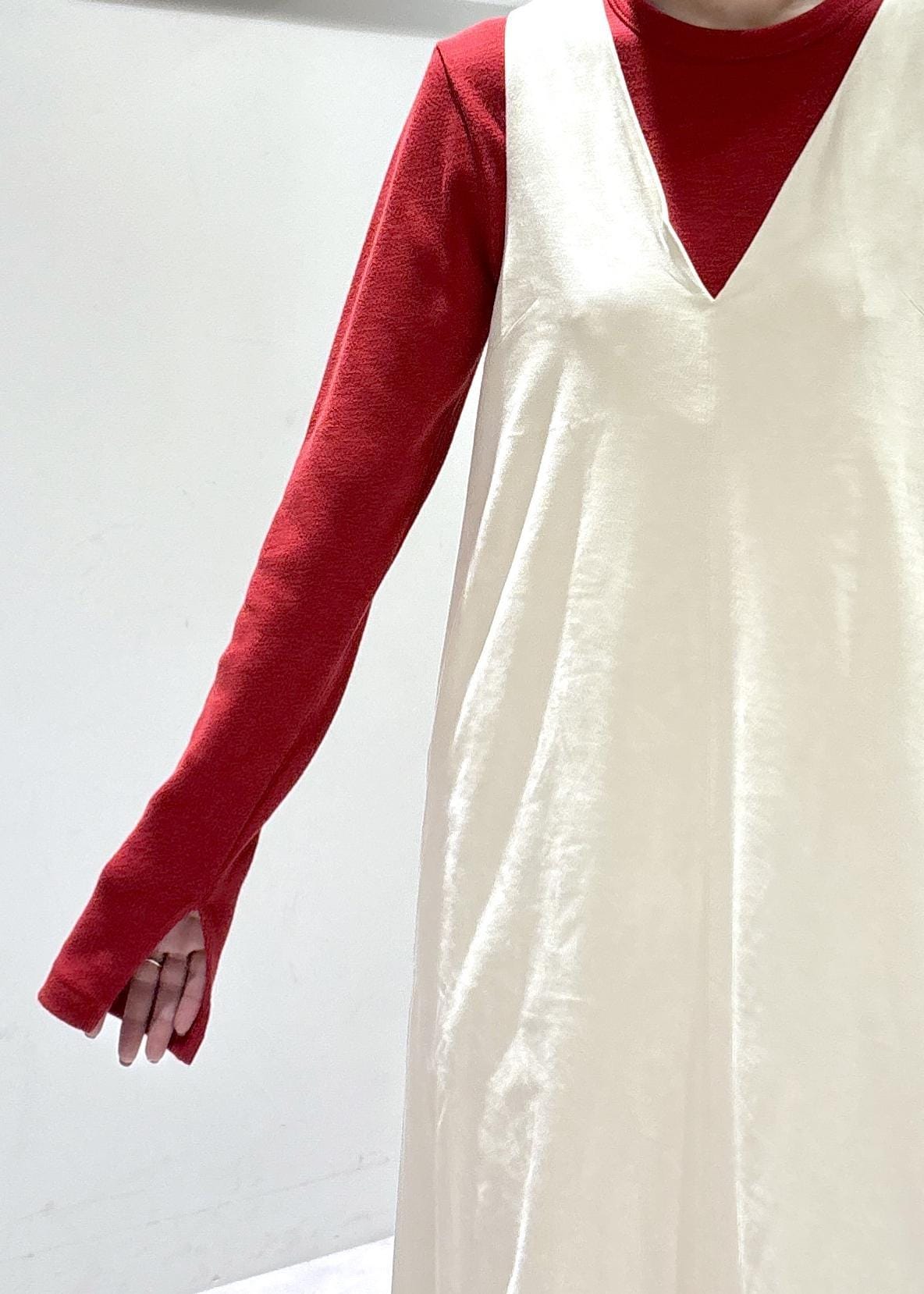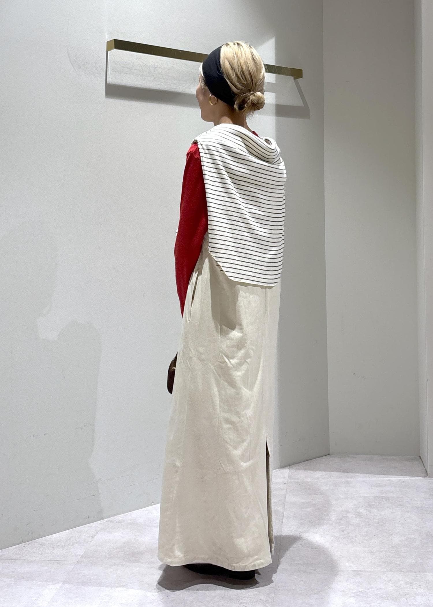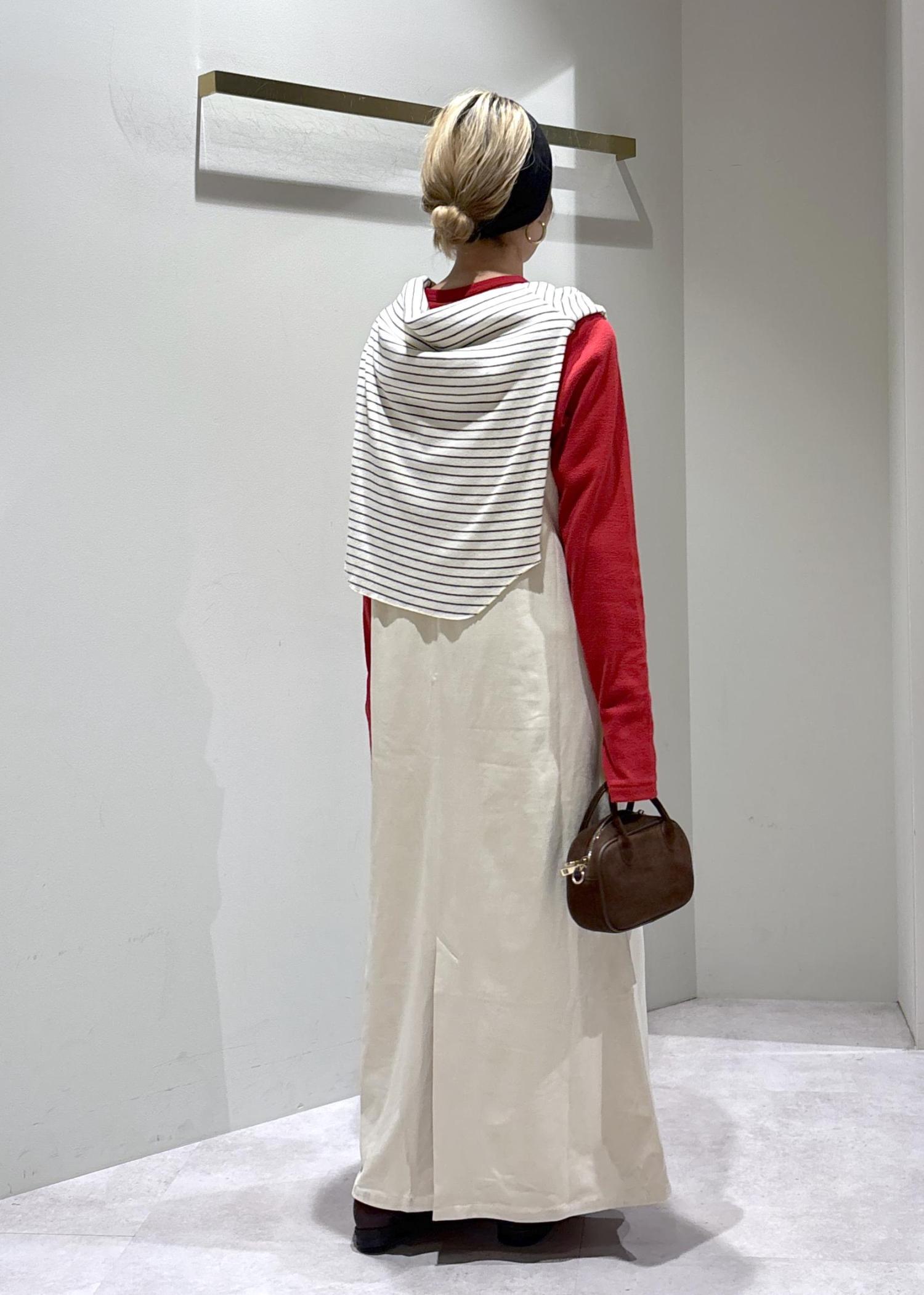 やさしい生成りカラーのワンピースに赤を差して秋のムードに。ゆるっとしたシルエットで、力の抜けた大人カジュアルにしてみました。