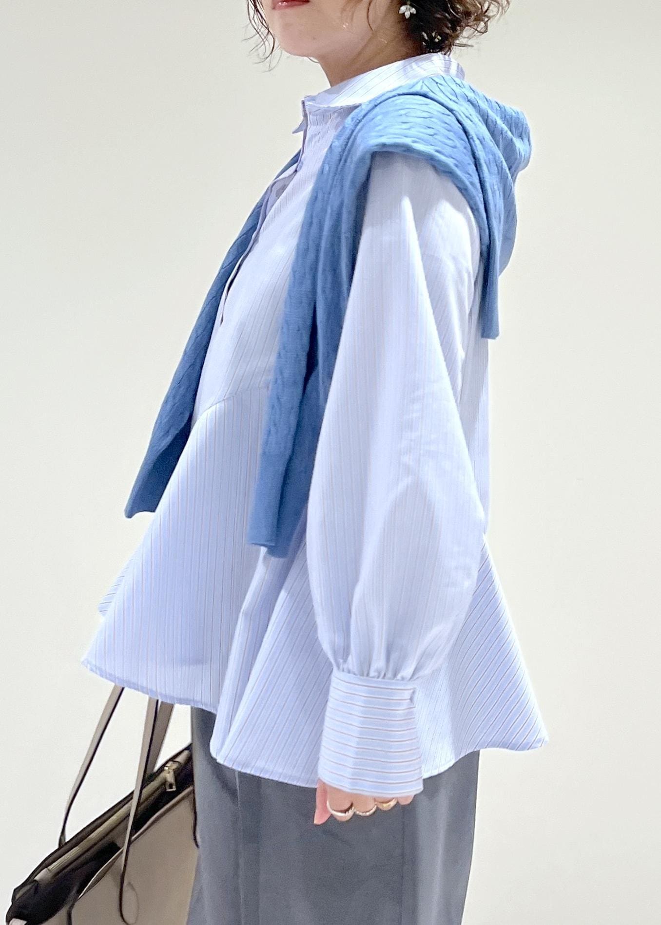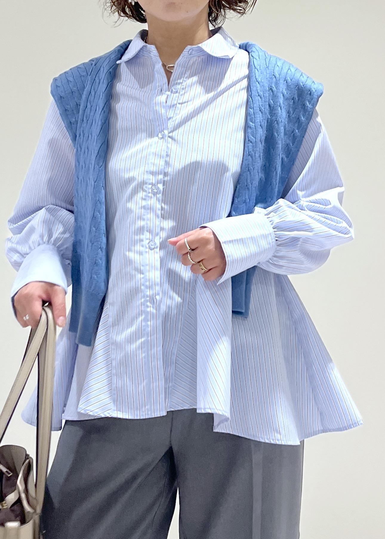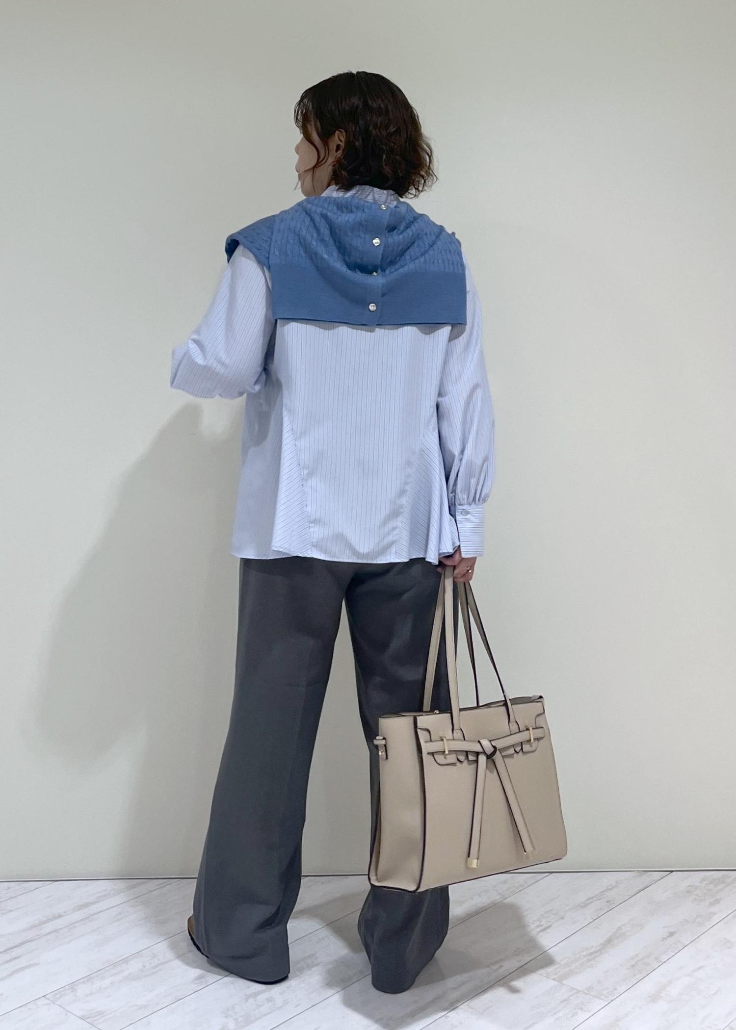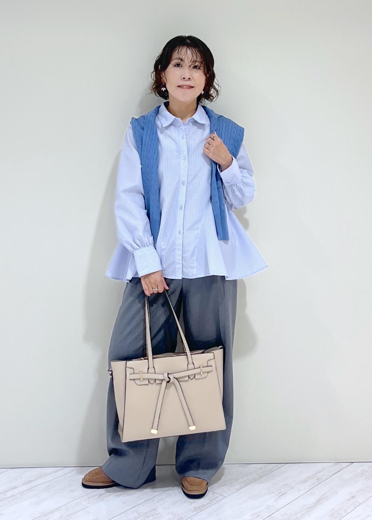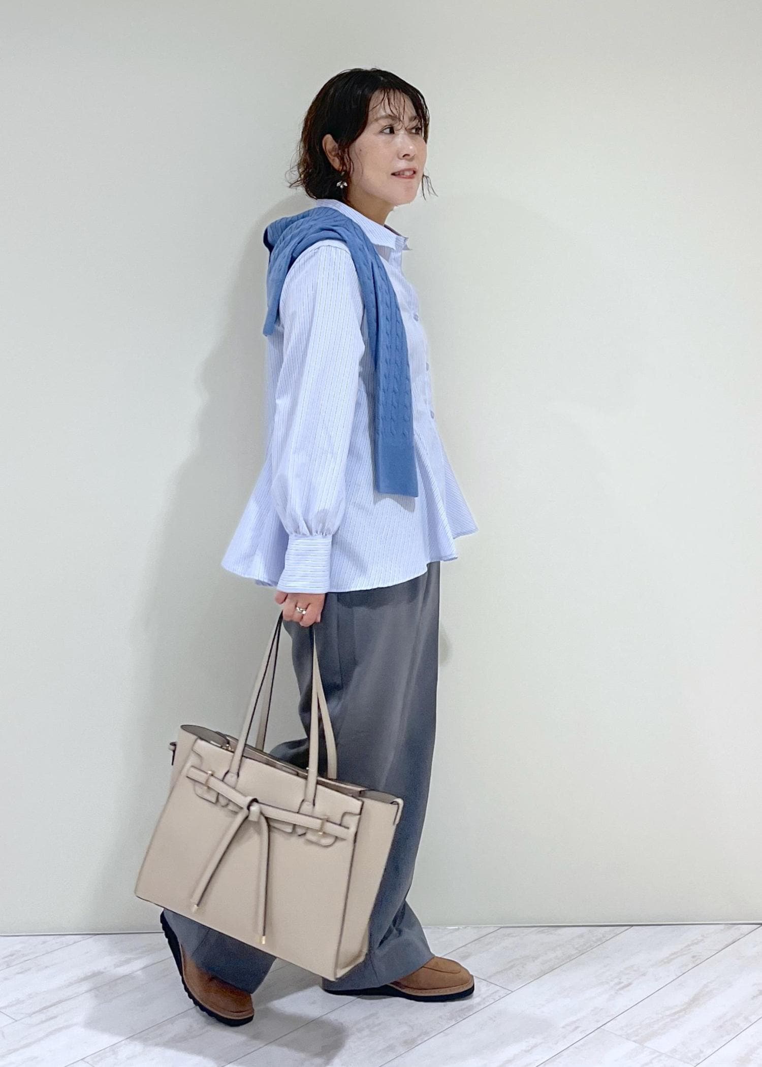肩掛けのカーディガンもブルーのトーン違いで合わせてポイントにしています。