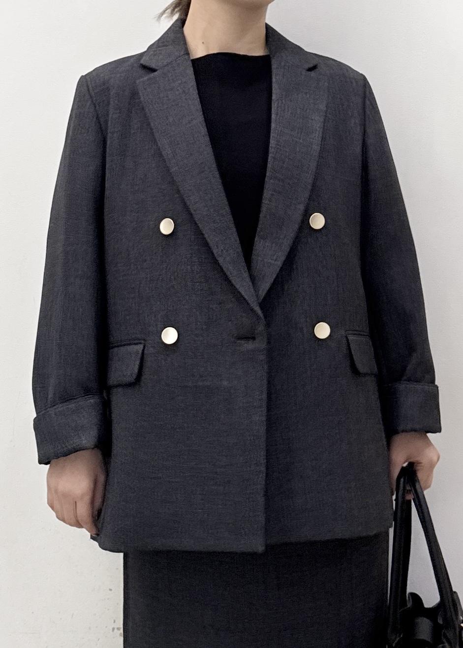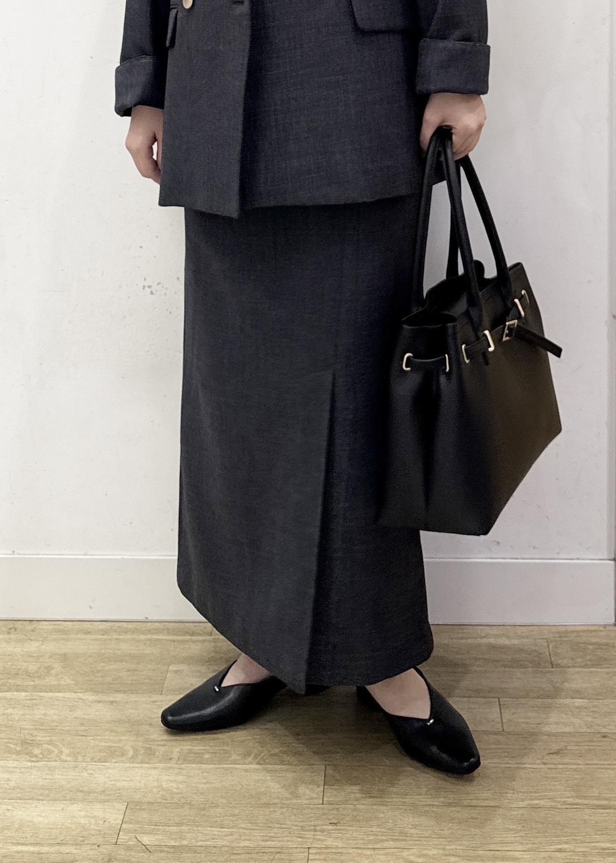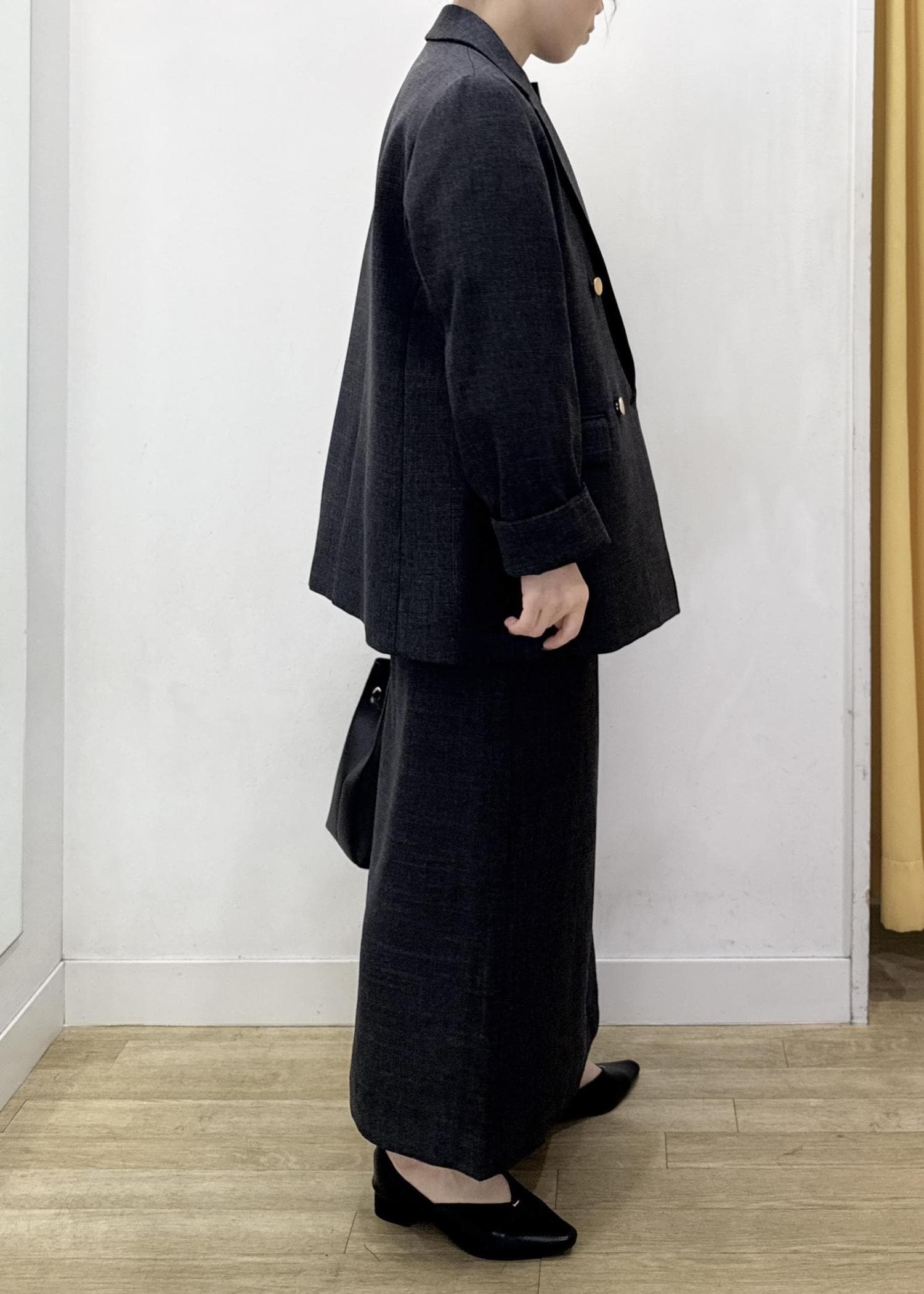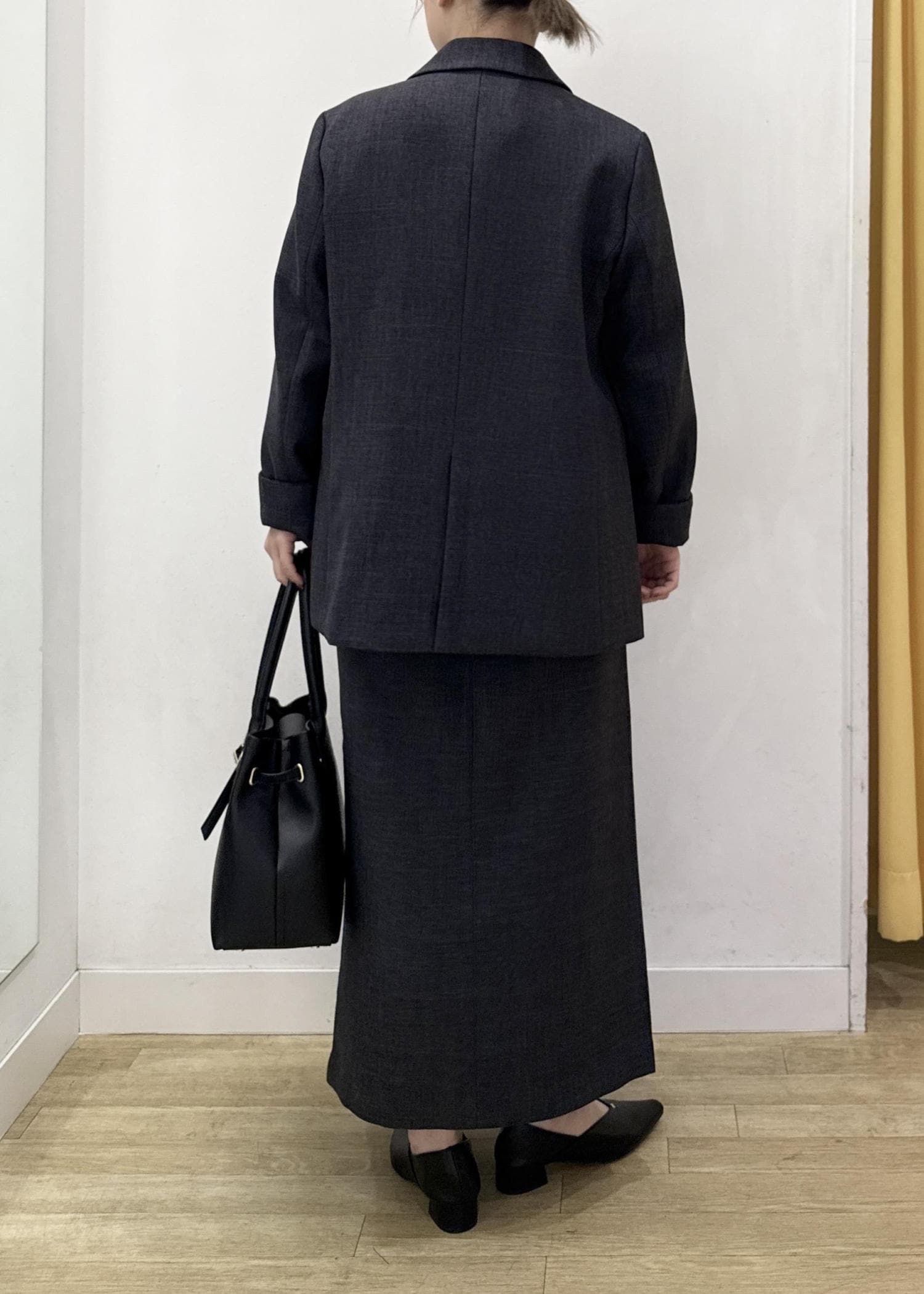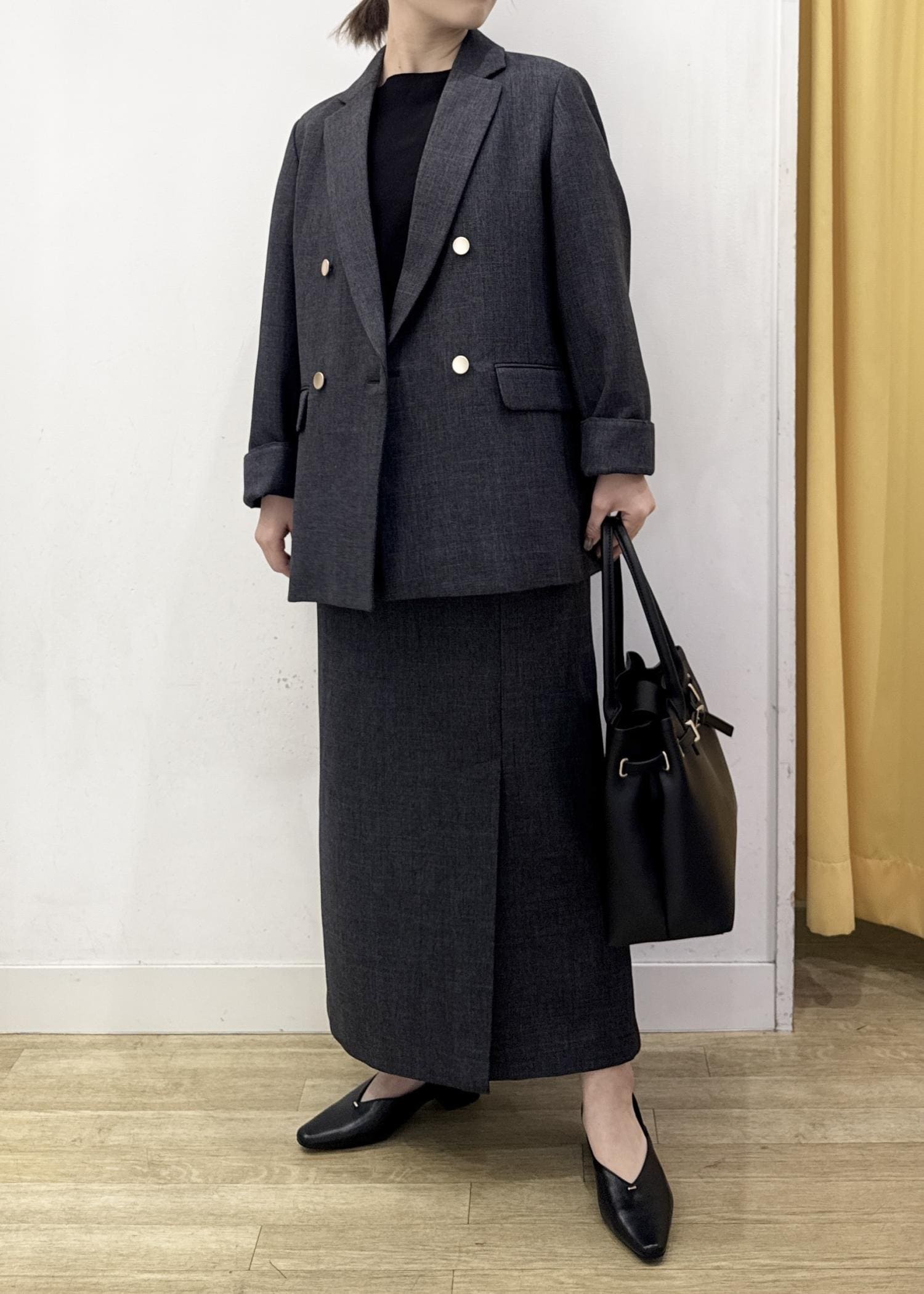 ゆったりとしたオーバーサイズのジャケットに、セットアップ対応のアイラインスカートを合わせたキレイめコーディネート!