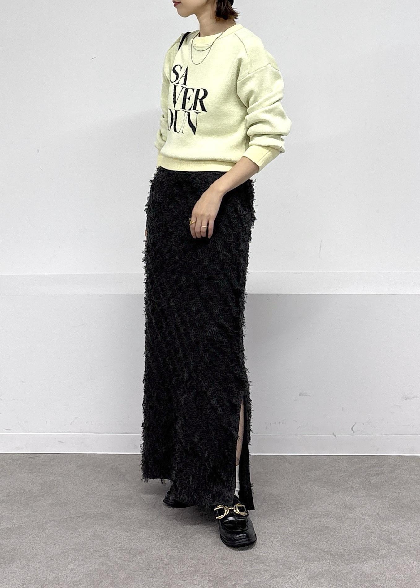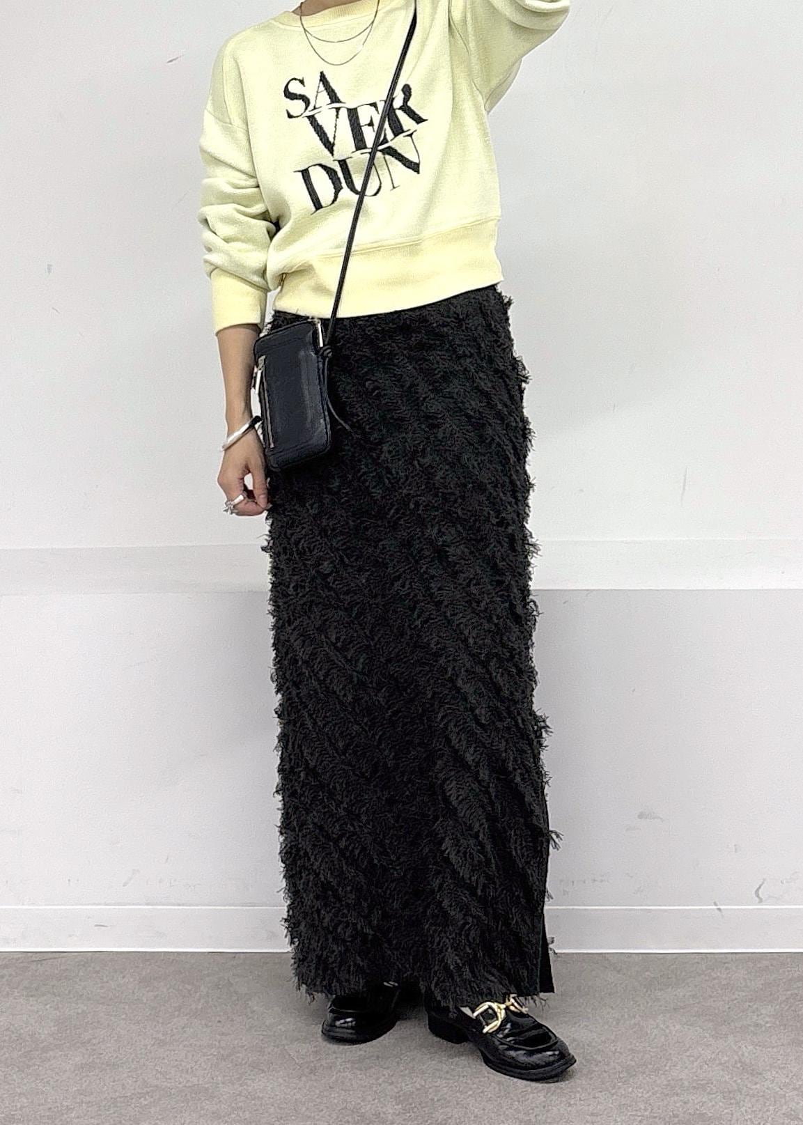 VISフリンジニットナロースカートチャコール / F¥6,589レビューフリンジニットが季節を感じるスカート♪トレンド感ある一枚で華やかな印象のデザインで目を惹きます。ウエストゴム、ニット素材と柔らかくて着心地◎裏地もお尻周りについているので安心です。全体的にややゆったりめ、着丈は足首くらいの長さでした。