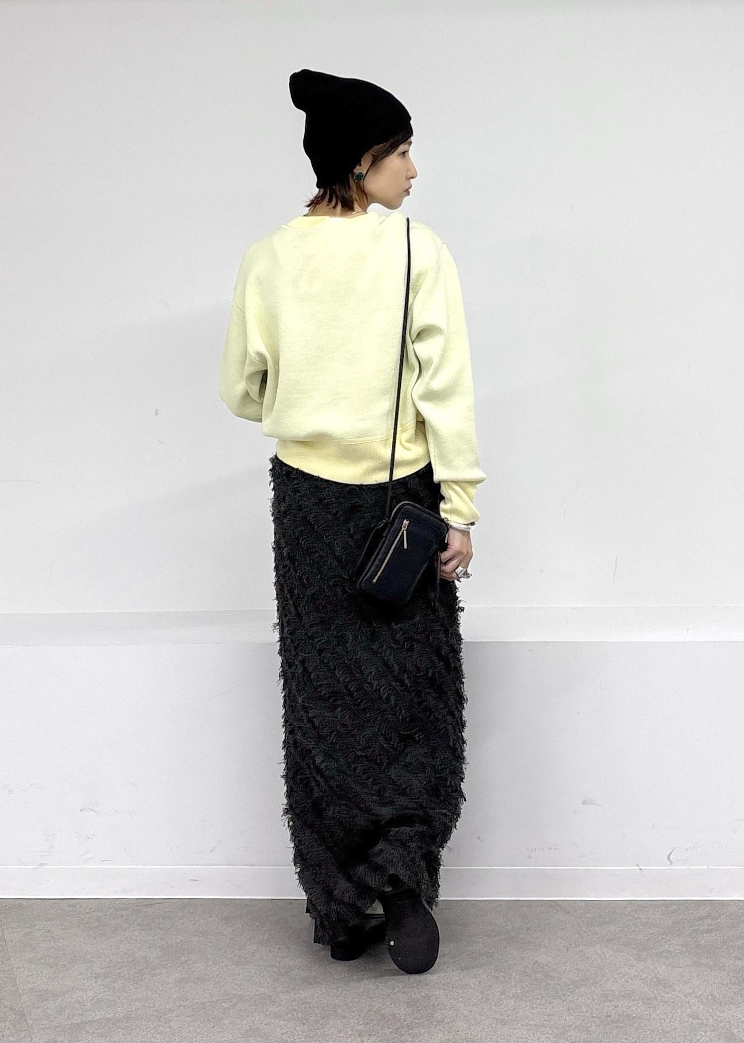 淡いイエローが大人可愛いロゴニットをポイントに、季節を感じるニットスカートで合わせた休日のお出かけスタイル♪小物はブラックで少しマニッシュな印象にまとめました◎秋オススメの大人カジュアルコーデ。