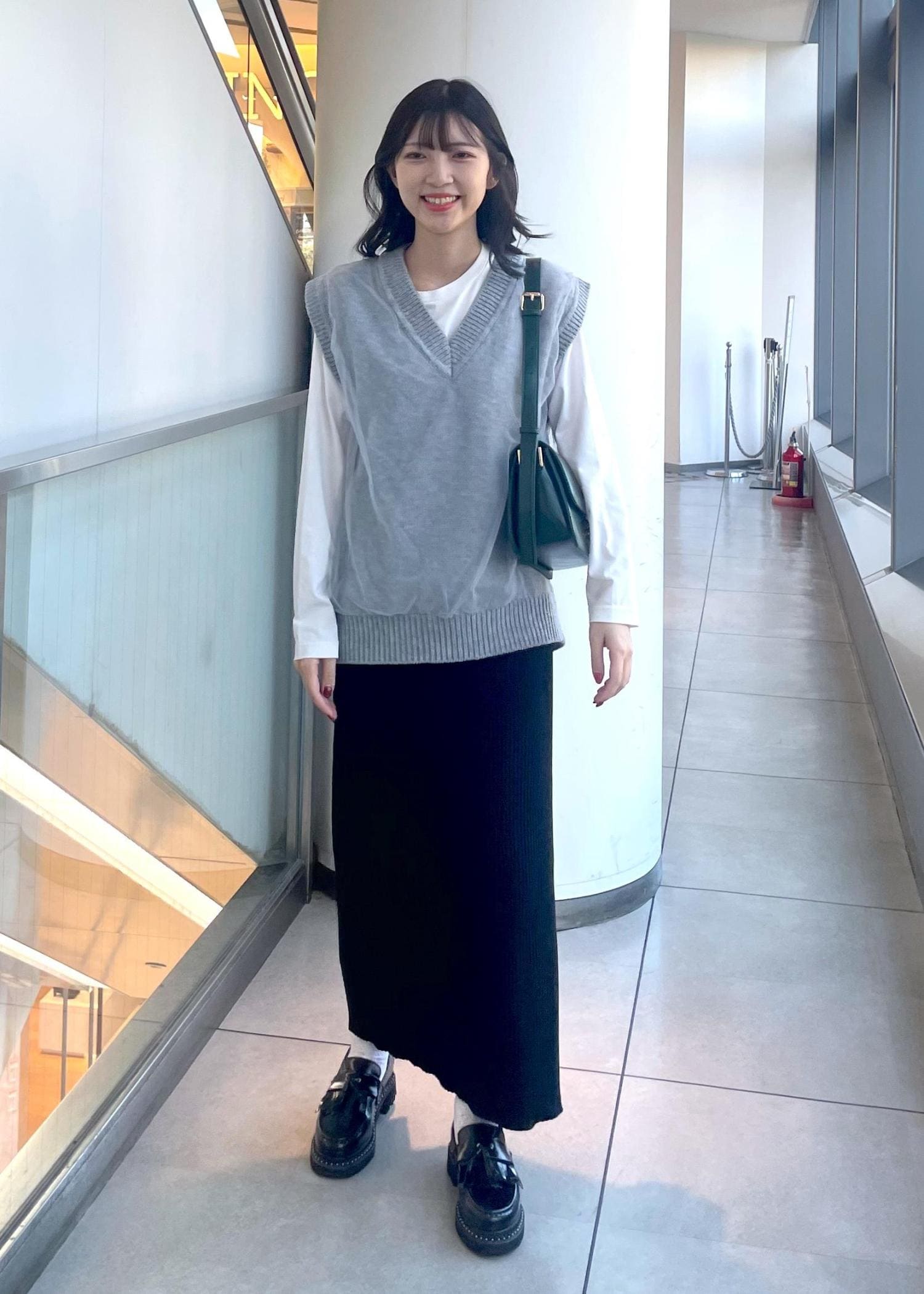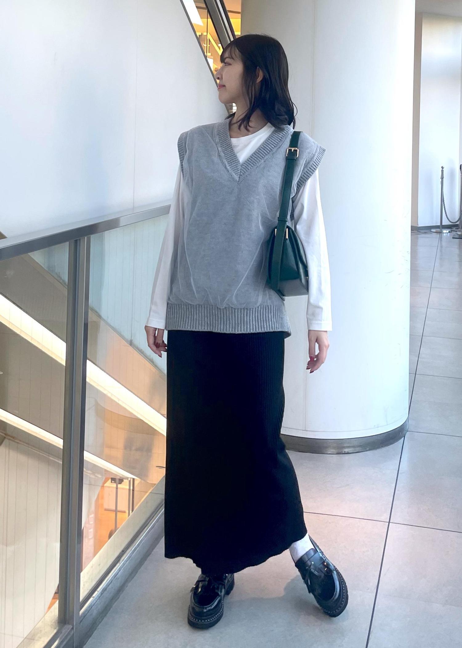 ニットベストを使い、カジュアルに着られるスタイルにしました。シンプルですが秋カラーのバッグがワンポイントになります。